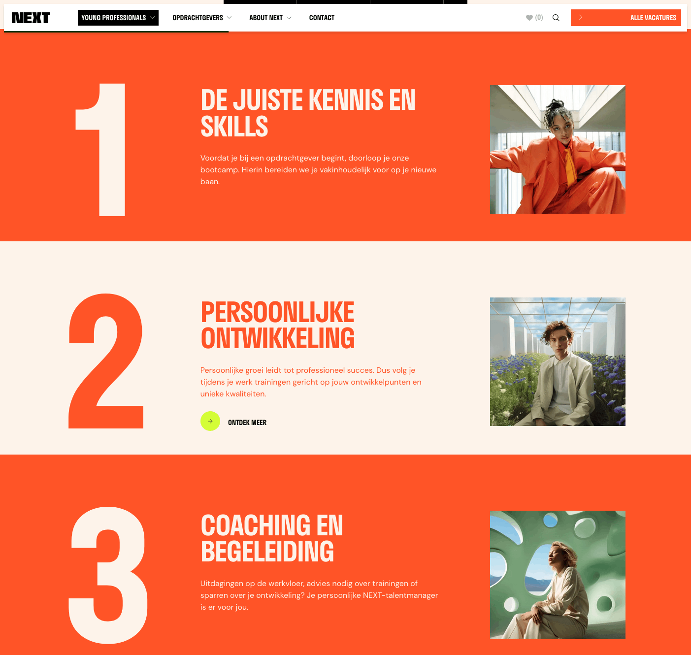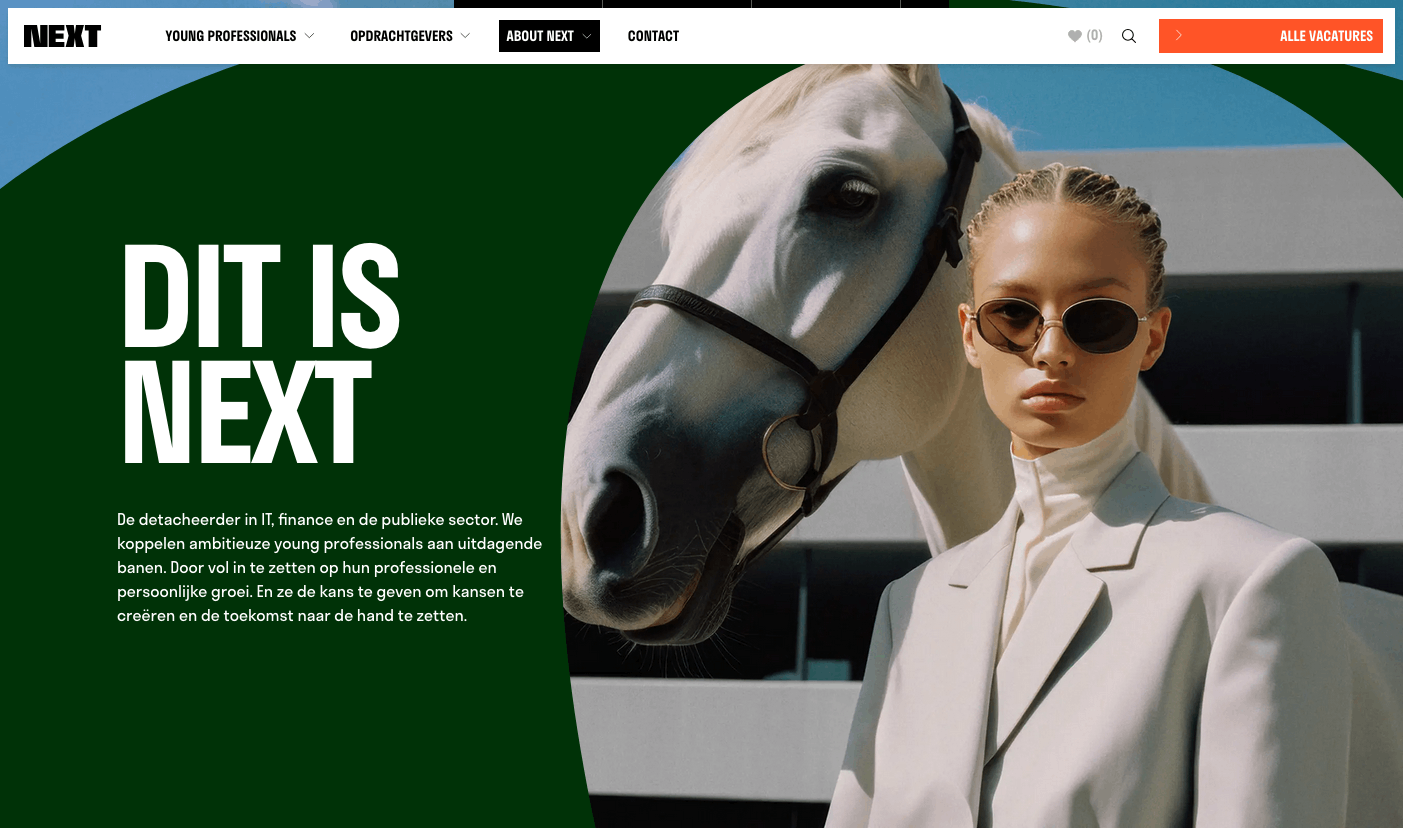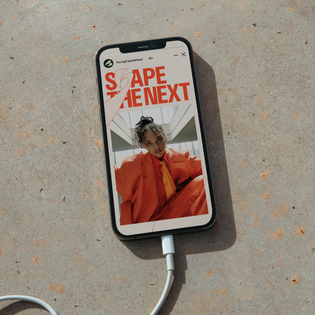 The current website of YoungCapital NEXT was designed in 2024 by Dutch agency Verve. Its primary colors are dark green and orange, spiced up with secondary bright pink, blue, and green. What shapes the identity on top of these is the headline typeface, Stratos Semibold, designed by Yoann Minet. It’s used exclusively in the condensed capitals. A main feature of Stratos is the mix of narrow uppercase letters that create a poignant impact with a lowercase that is wider and of geometric character. Check out Production Type’s website to see the interplay.