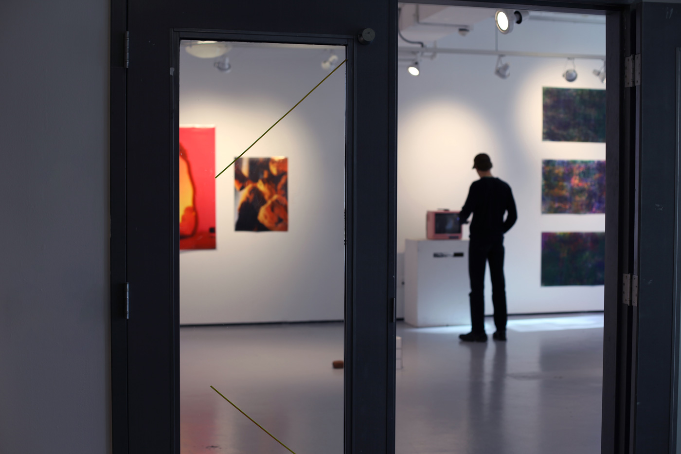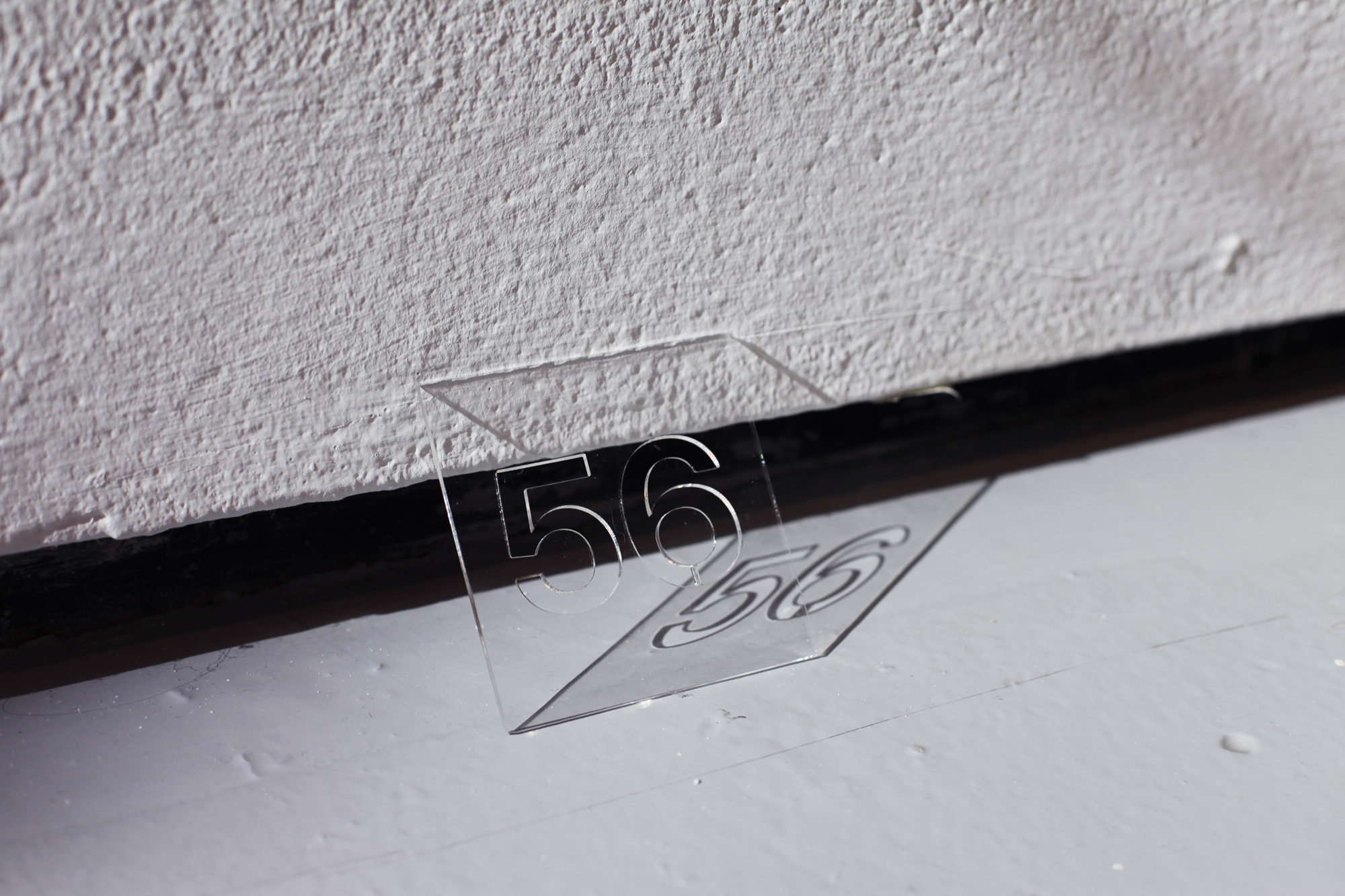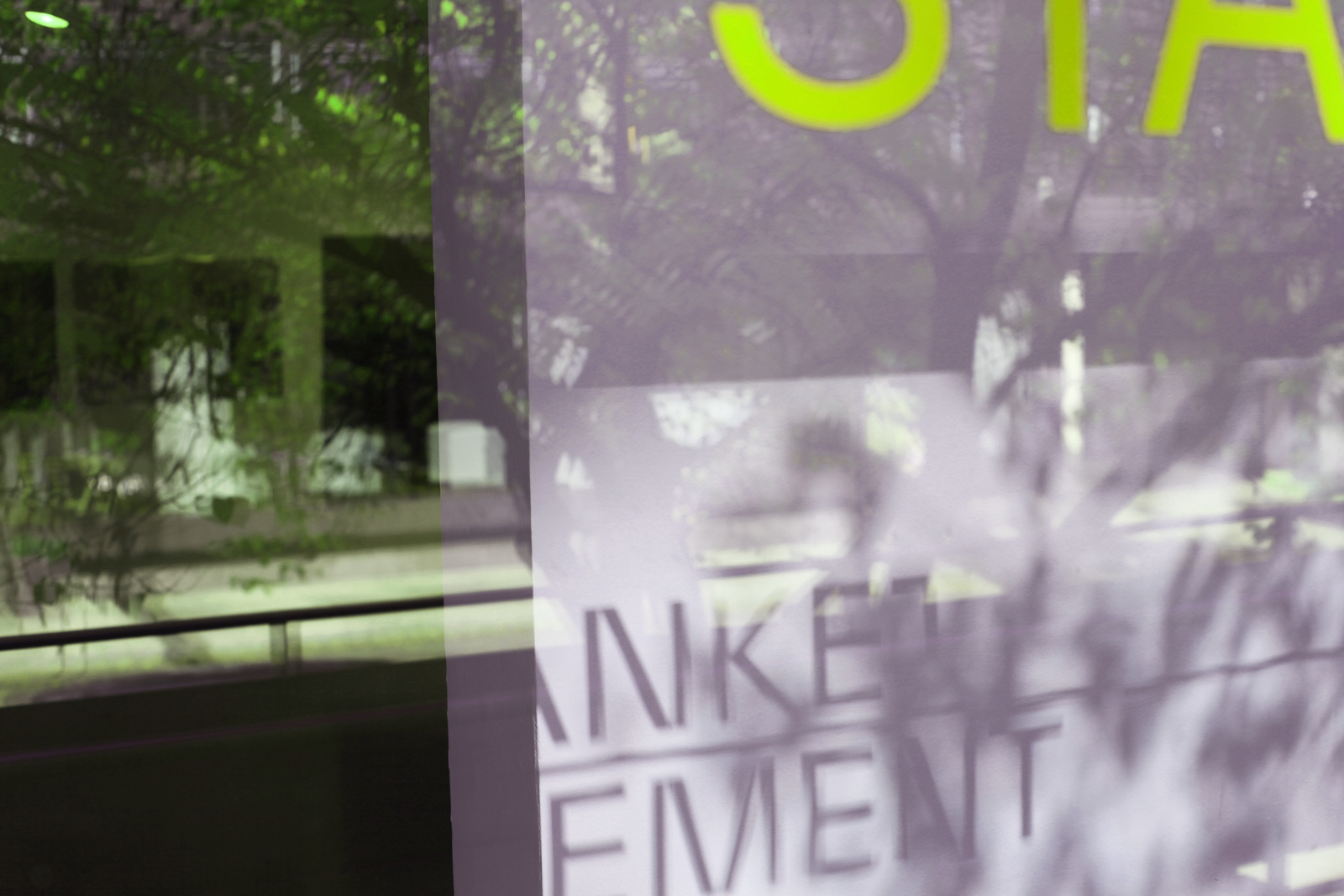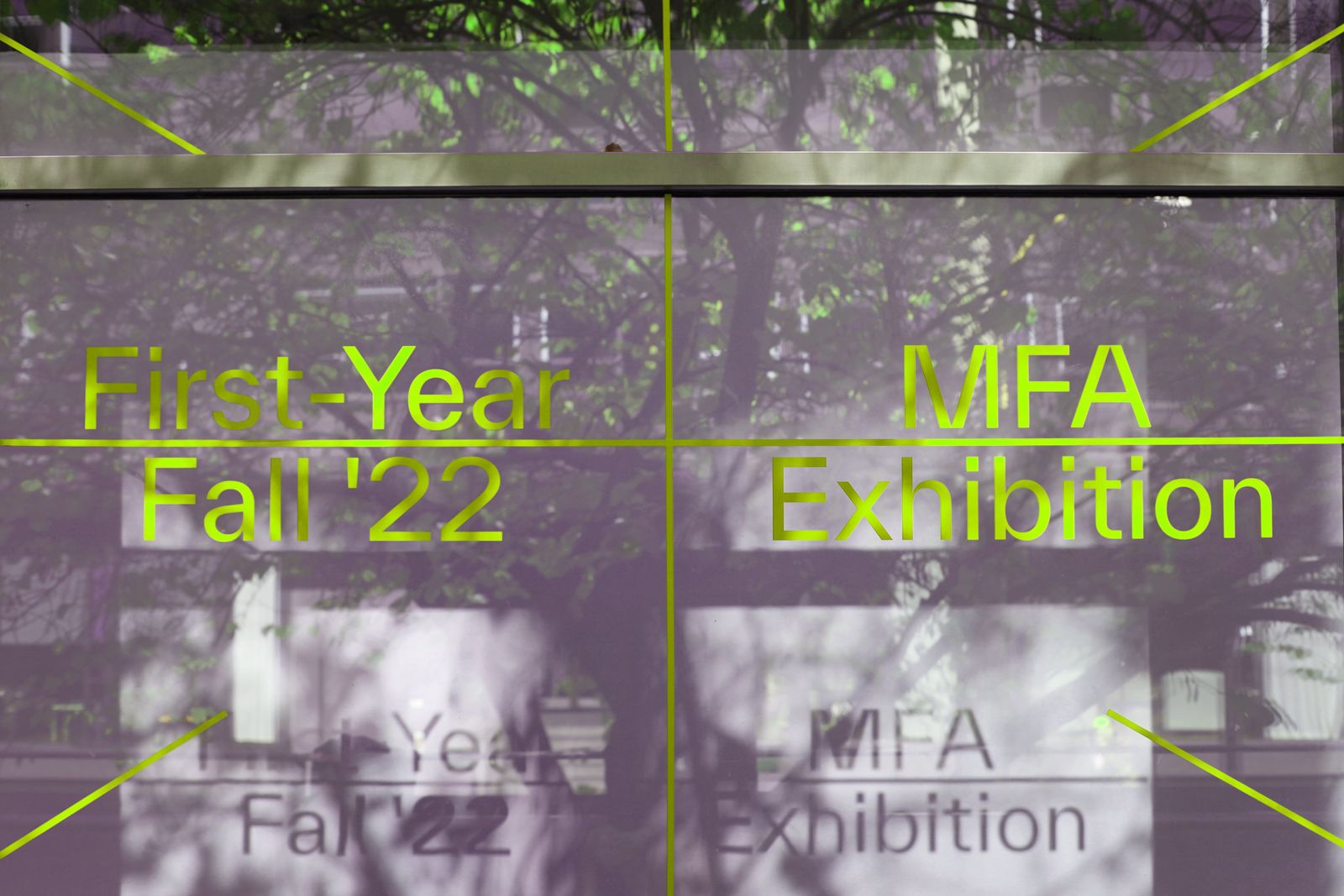 The exhibition design uses typography and symmetric lines to populate and transform the transparent surfaces of the gallery and in turn the architecture itself. By masking and de-masking the surfaces, the design areas act not only as screens, but rather as matrices. A matrix is a concept and means of transmission very familiar in graphic design, namely in print processes: A physical surface that can be manipulated to hold ink, which is then transferred to paper through a reversal. Most, though not all, matrices are able to print the same image many times.
