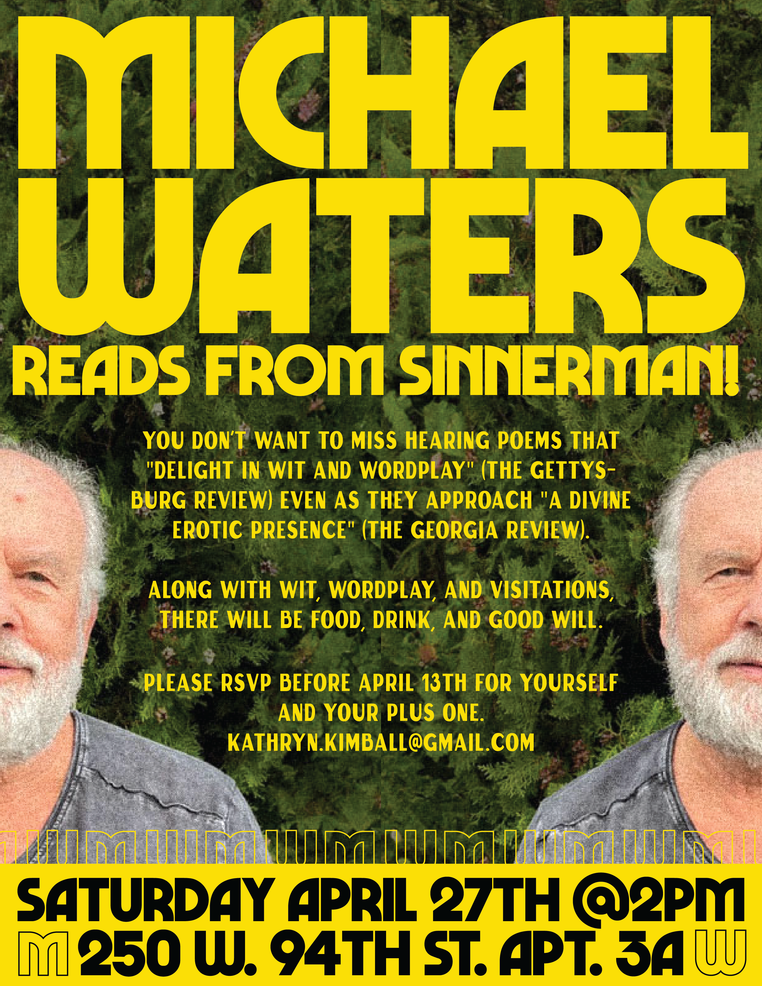 In April 2023, poet Michael Waters read from his book Sinnerman, published that year with Etruscan Press. The poster for the reading event pairs two all-caps typefaces, Marvin Visions by Mathieu Triay and a condensed style of Sequoia by Rachel Kick. The design takes advantage of the fact that in Marvin Visions, the author’s initials form a near-perfect mirror image when stacked on top of each other.
