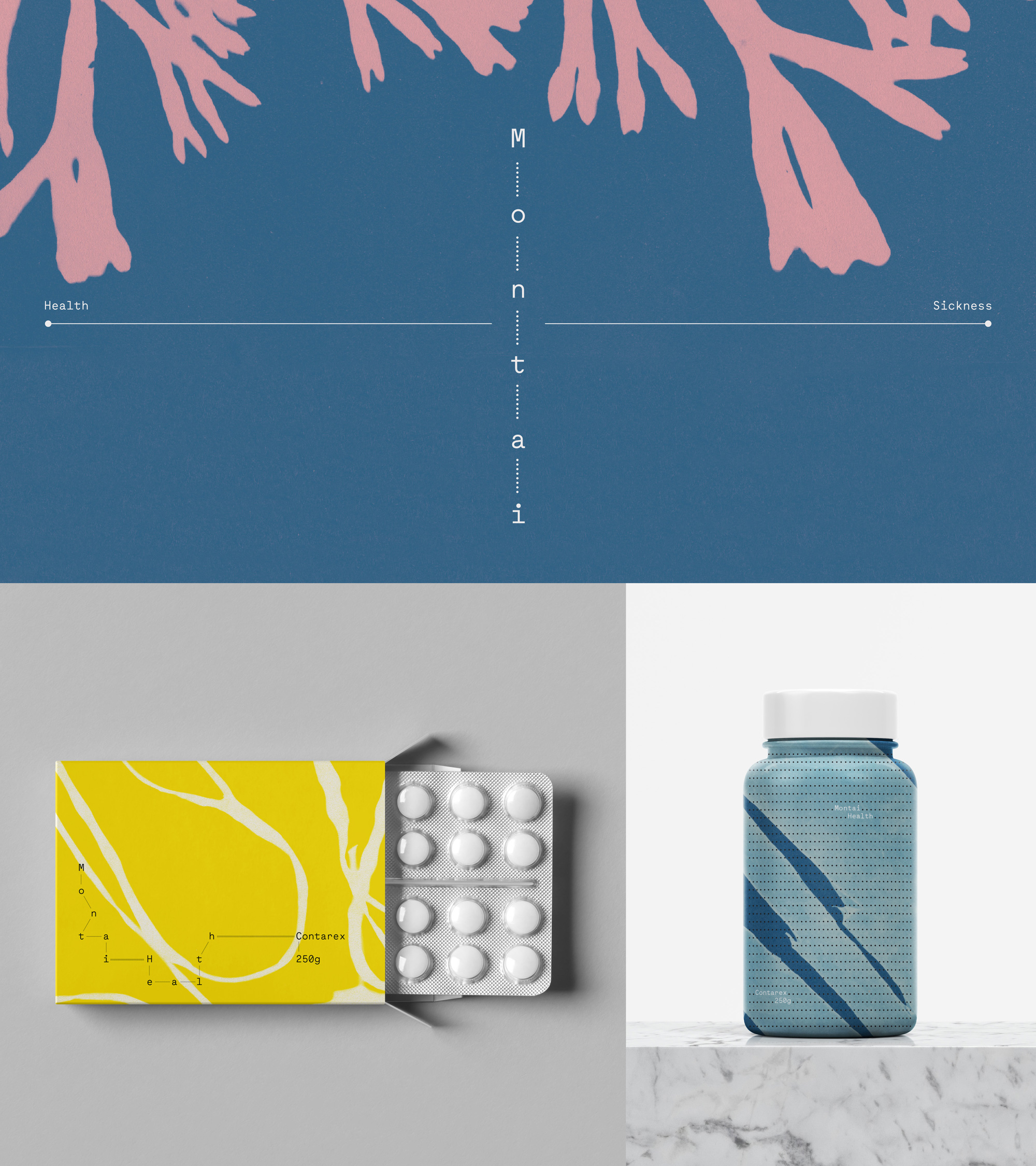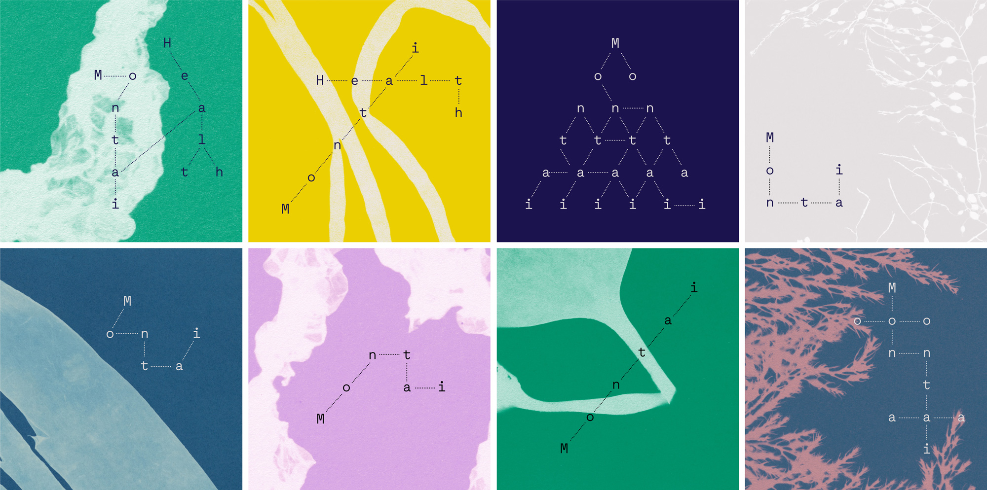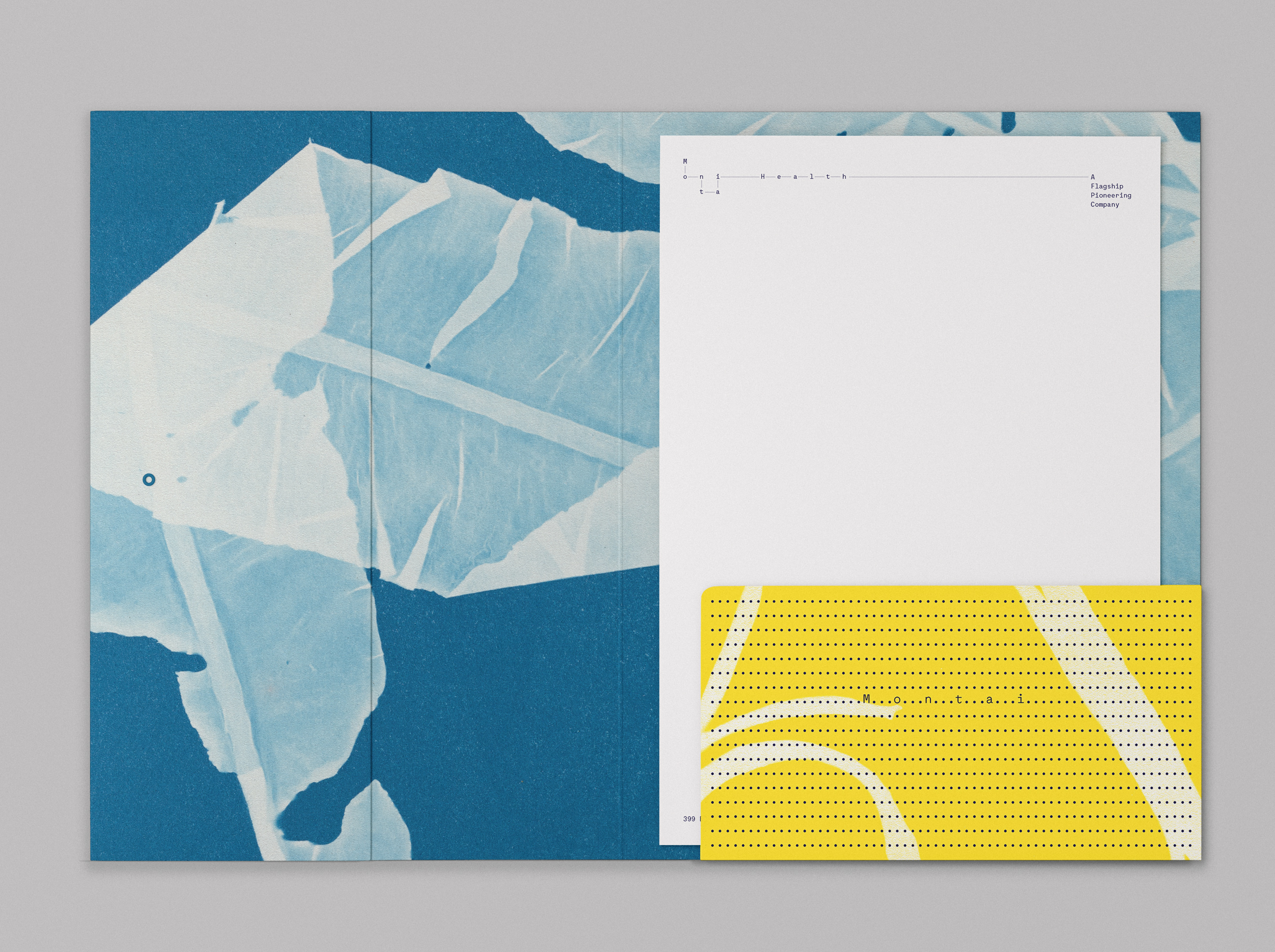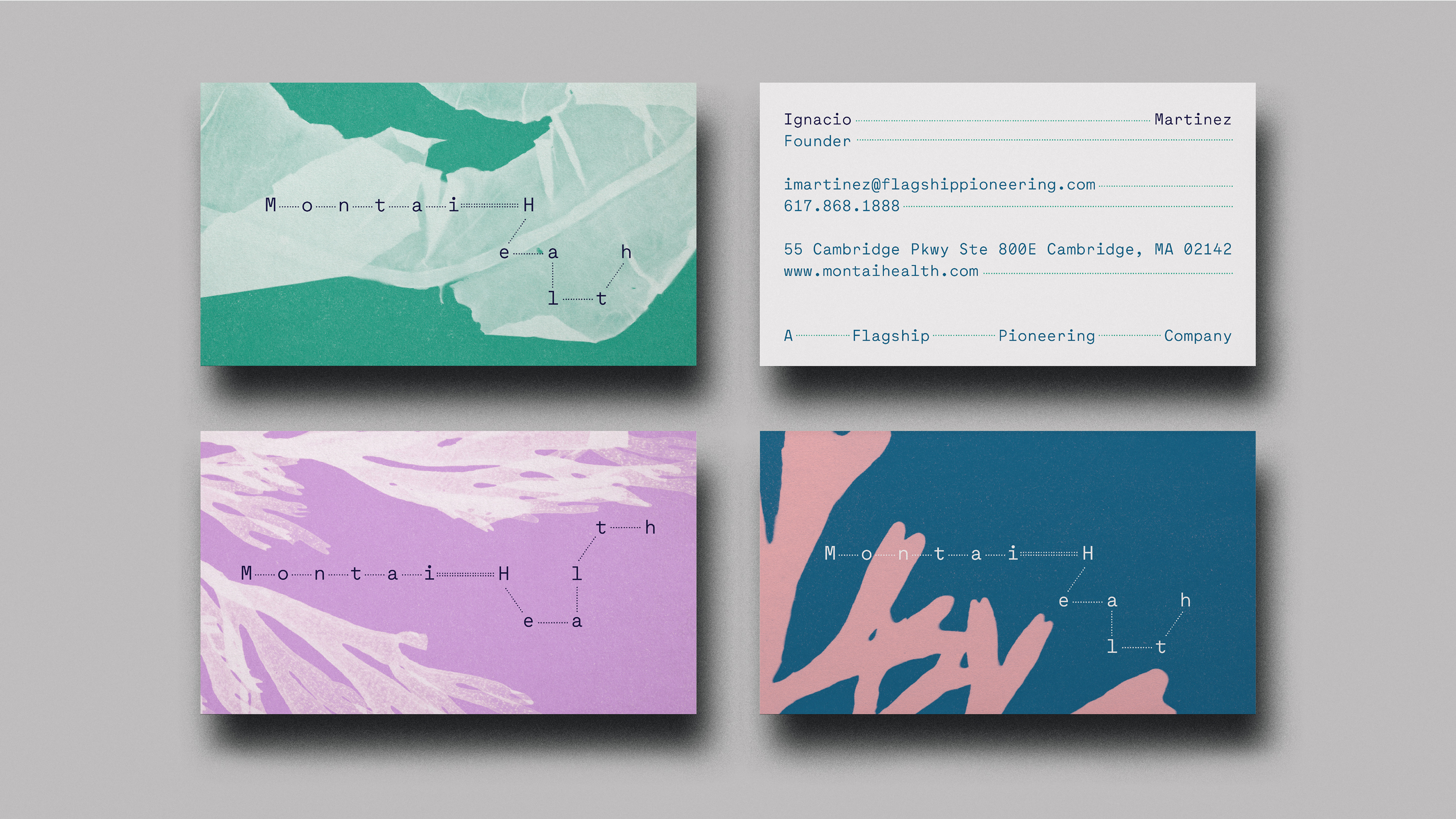 Our dynamic, modular identity system borrows from the visual language of chemical bond diagrams, symbolizing the infinite chemical possibilities afforded by their platform. Maax Mono from 205TF forms the foundation of the brand’s typographic language. Graphik from Commercial Type is leveraged in situations when a monospace font is less suitable. Vintage cyanotype textures emphasize Montai’s exclusive use of safe, organic compounds.