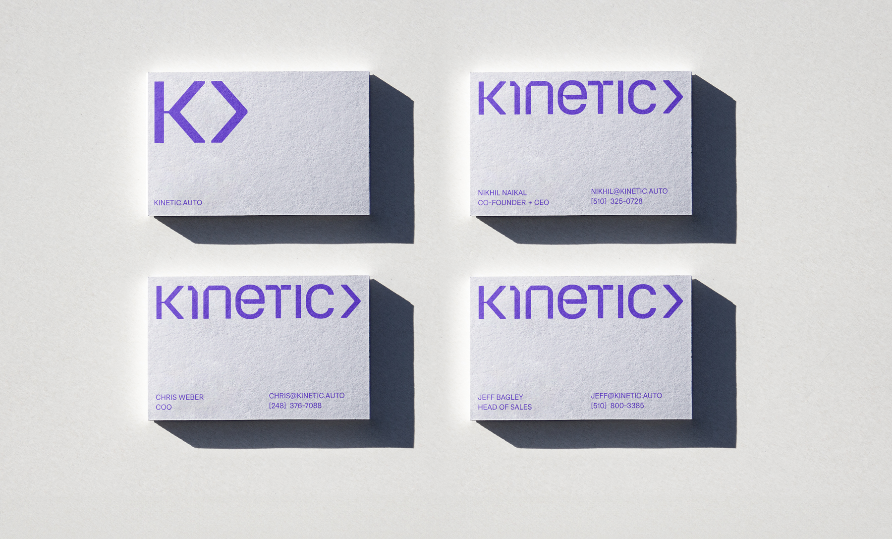 The Kinetic logo and its accompanying monogram is symbolic of their comprehensive, self-contained, ever-expanding solution. The bespoke letterforms within the wordmark nod to engineering, precision, and cutting-edge digital technology, with a sense of visual strength that keeps them grounded in the industrial sector. Denim from Displaay is used throughout the brand system, supporting the technological tone of the brand.