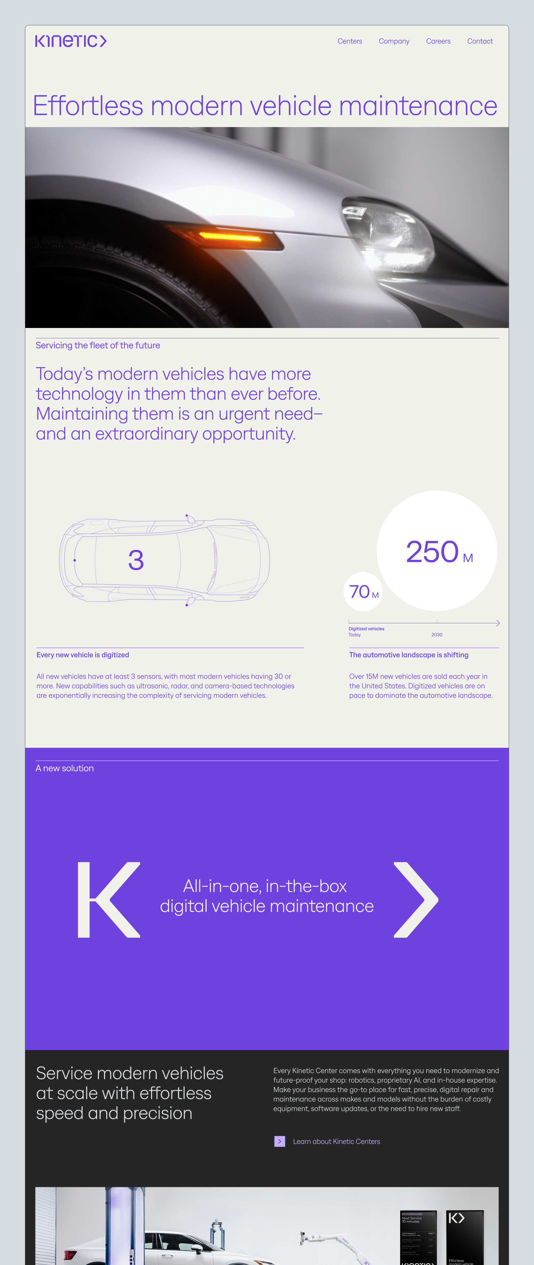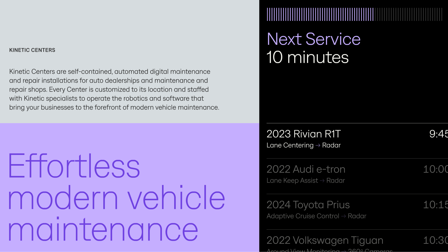 Kinetic is creating an infrastructure-as-a-service solution to eliminate the friction associated with providing maintenance to today’s modern digitized vehicles. Their solutions promise effortless speed, effortless accuracy, and effortless precision.