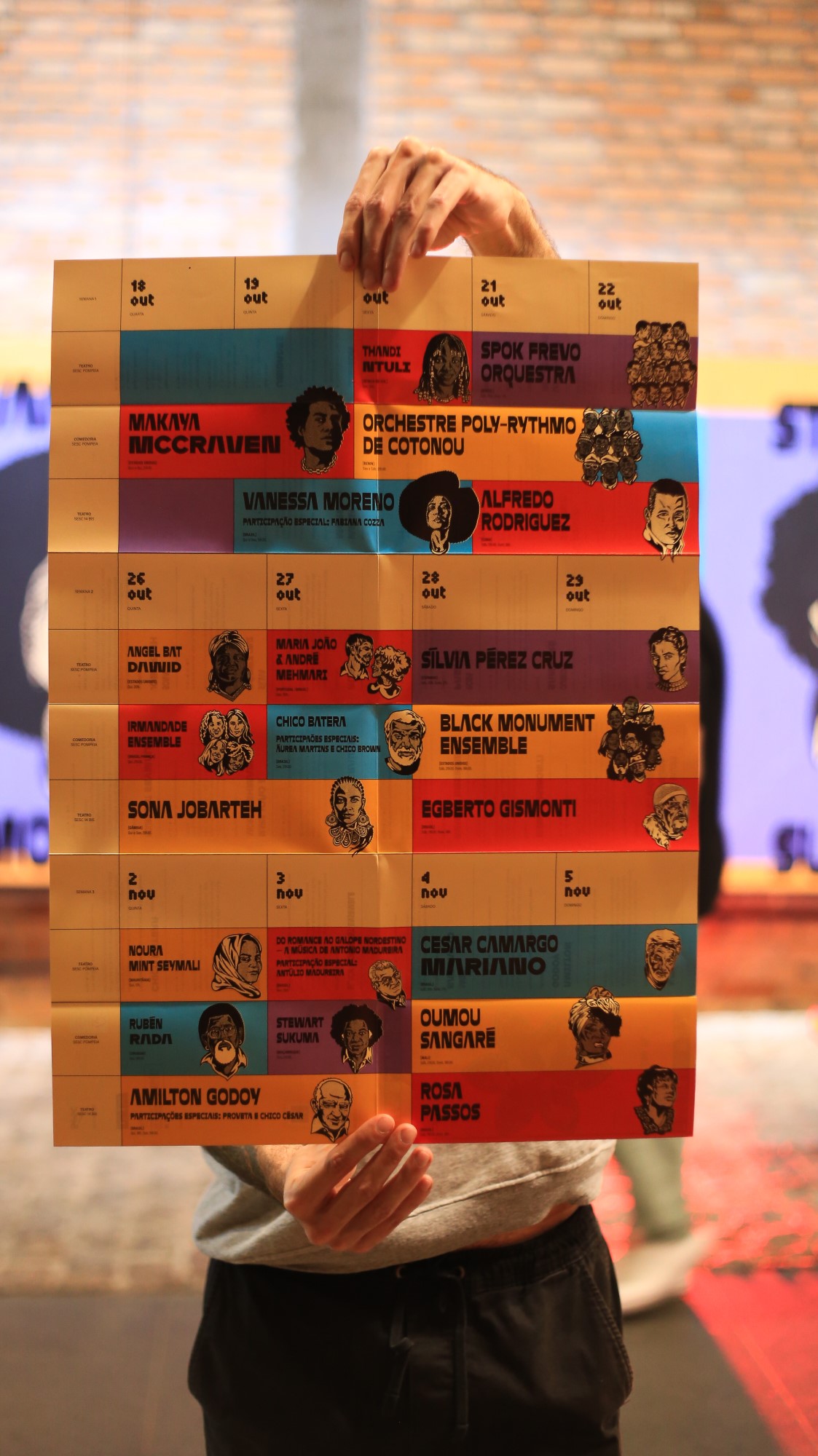 Giulia Fagundes explains that developing visuals to represent “the displacement of the center”, as proposed by the festival’s curators, and “assuming the symbolic place of contesting the power relations present within it” was the project’s greatest challenge. The goal was to bring the various paths of the Afro-diasporic culture and its aesthetic autonomies into a cohesive visual identity.