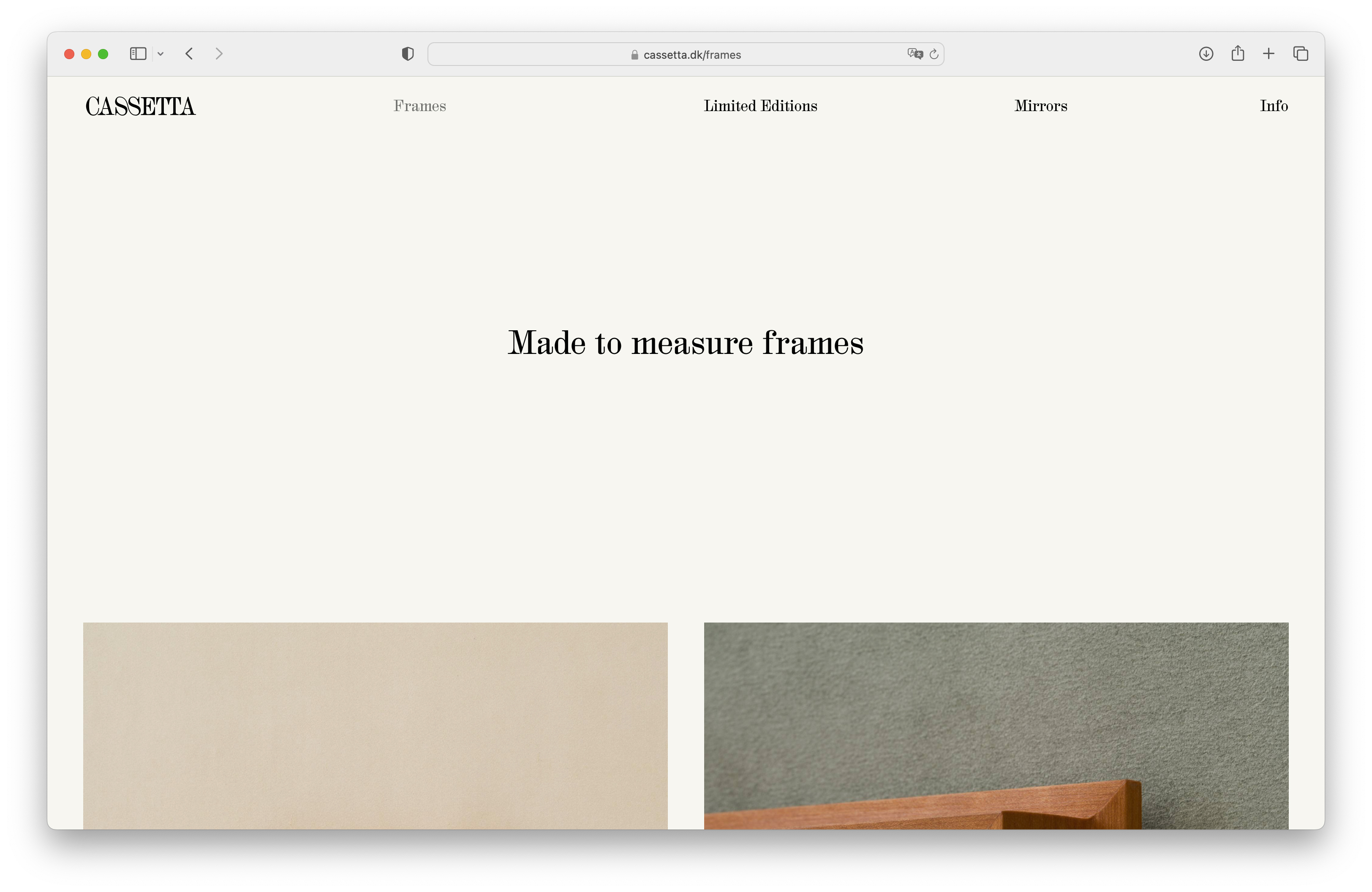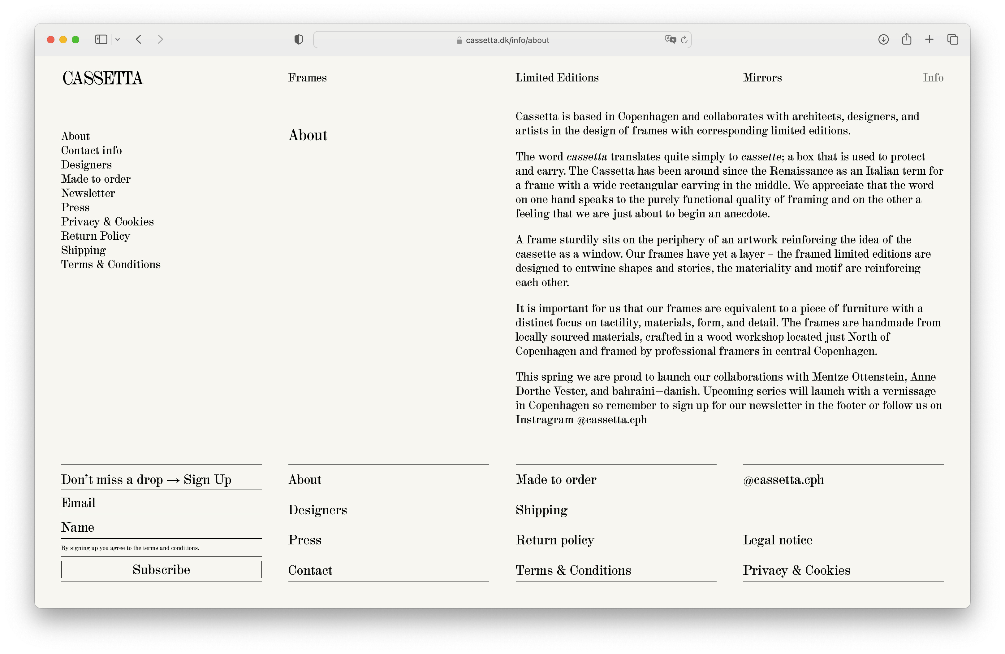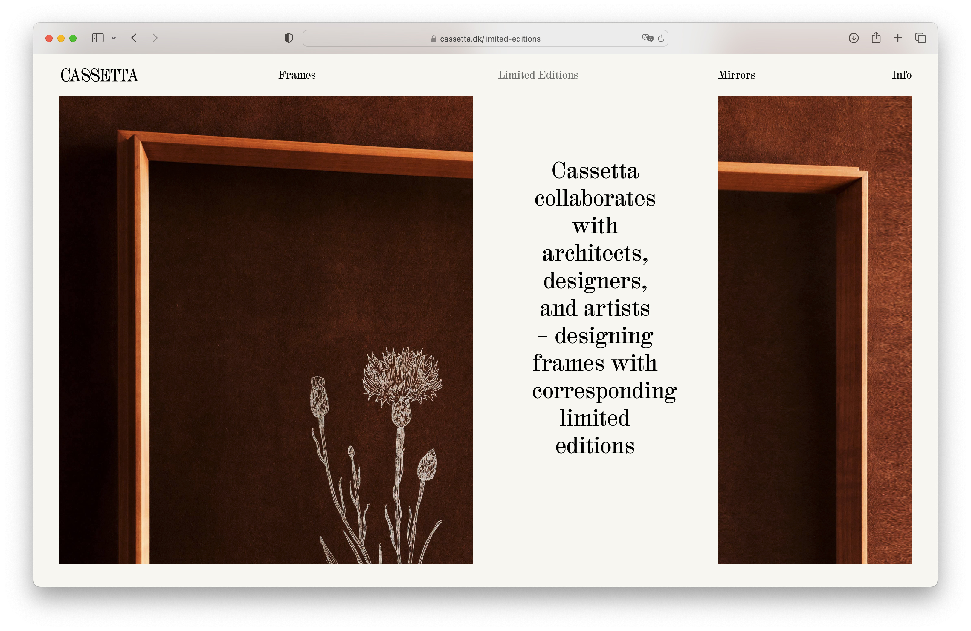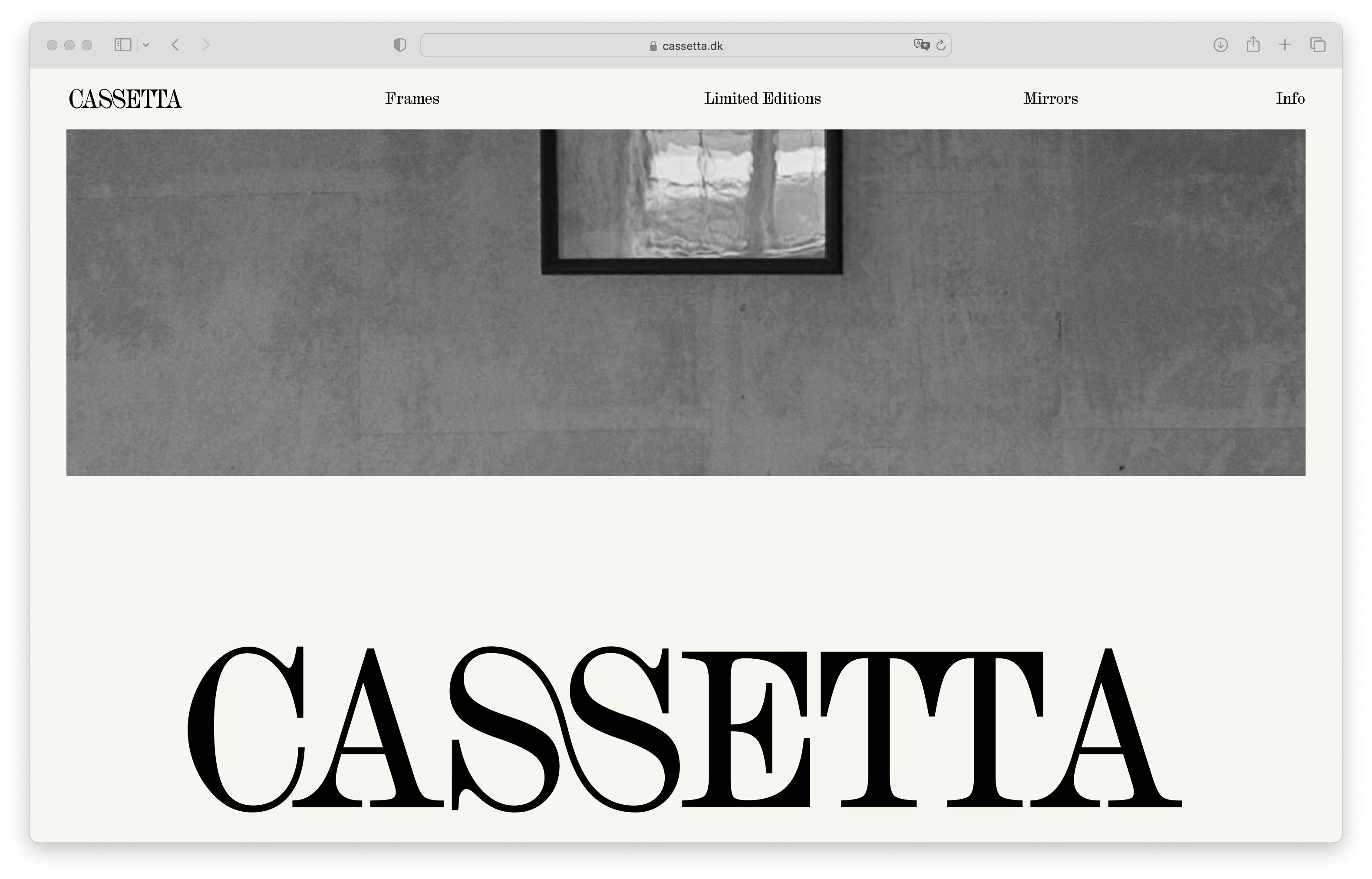 Cassetta, based in Copenhagen, produces frames, mirrors and limited editions in close collaboration with architects, designers, and artists. Their graphic identity, logotype, website, and online store were designed by Studio Atlant (development by Julia Novitch) and set in HAL Colant (HAL Typefaces). The studio also created customized SS and TT ligatures for the logo, not included in the original glyph set.