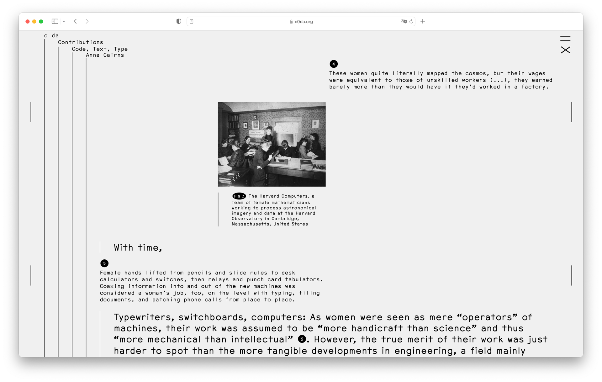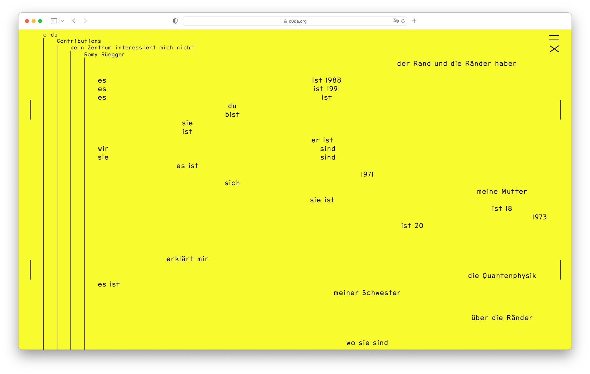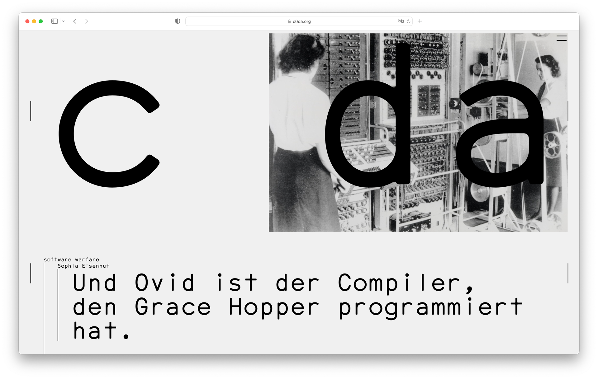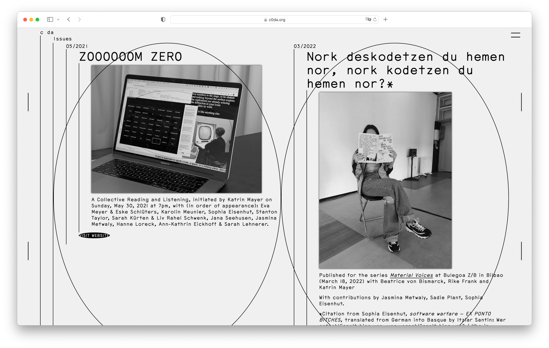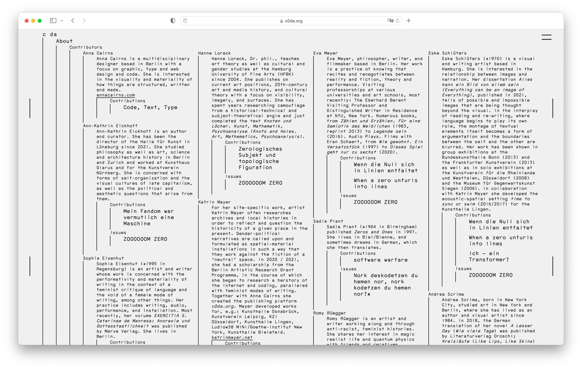 c0da is an artistic research and publishing project by Katrin Mayer, conceived during a grant by the Berlin Artistic Research Programme. The website shows artistic contributions by different artists and writers that reflect on feminist modes of coding and writing, and it serves as a platform for activities related to its ongoing research and artistic production.