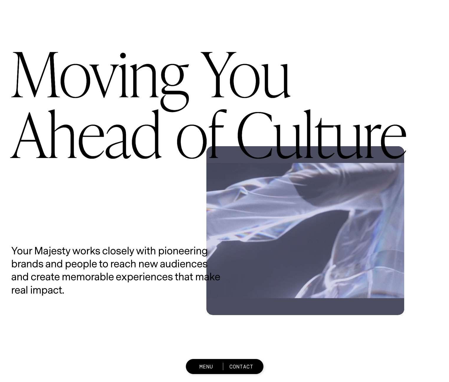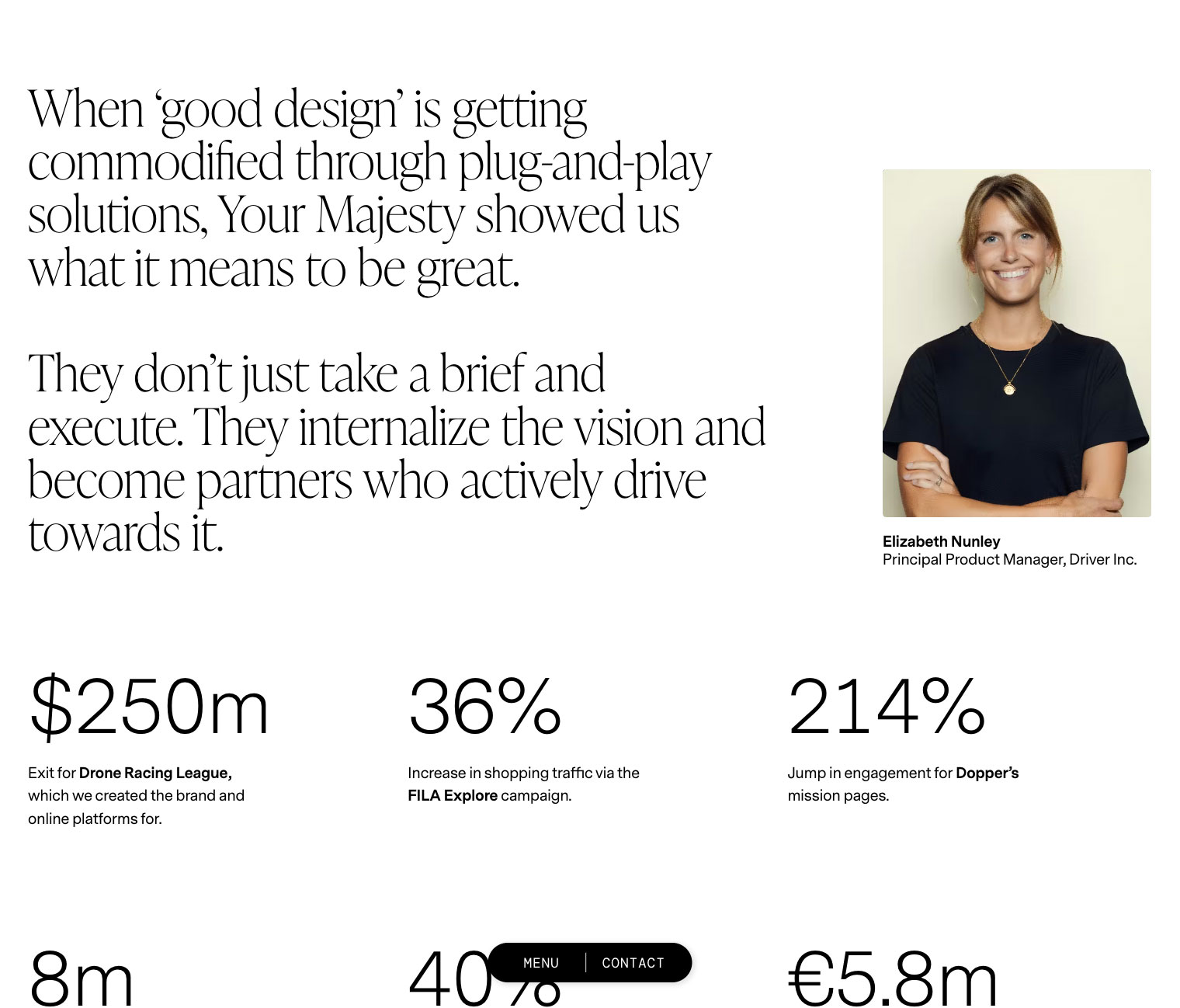 Your Majesty is an Amsterdam-based strategy-led design and technology agency that powers brands and digital products for fashion and technology pioneers. The website uses IvyPresto for headlines and quotes, Messina Sans and DM Mono for secondary texts.