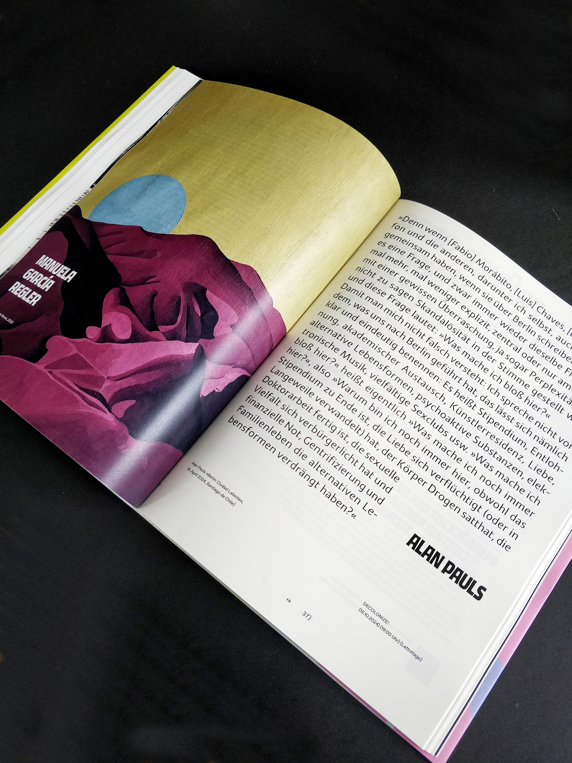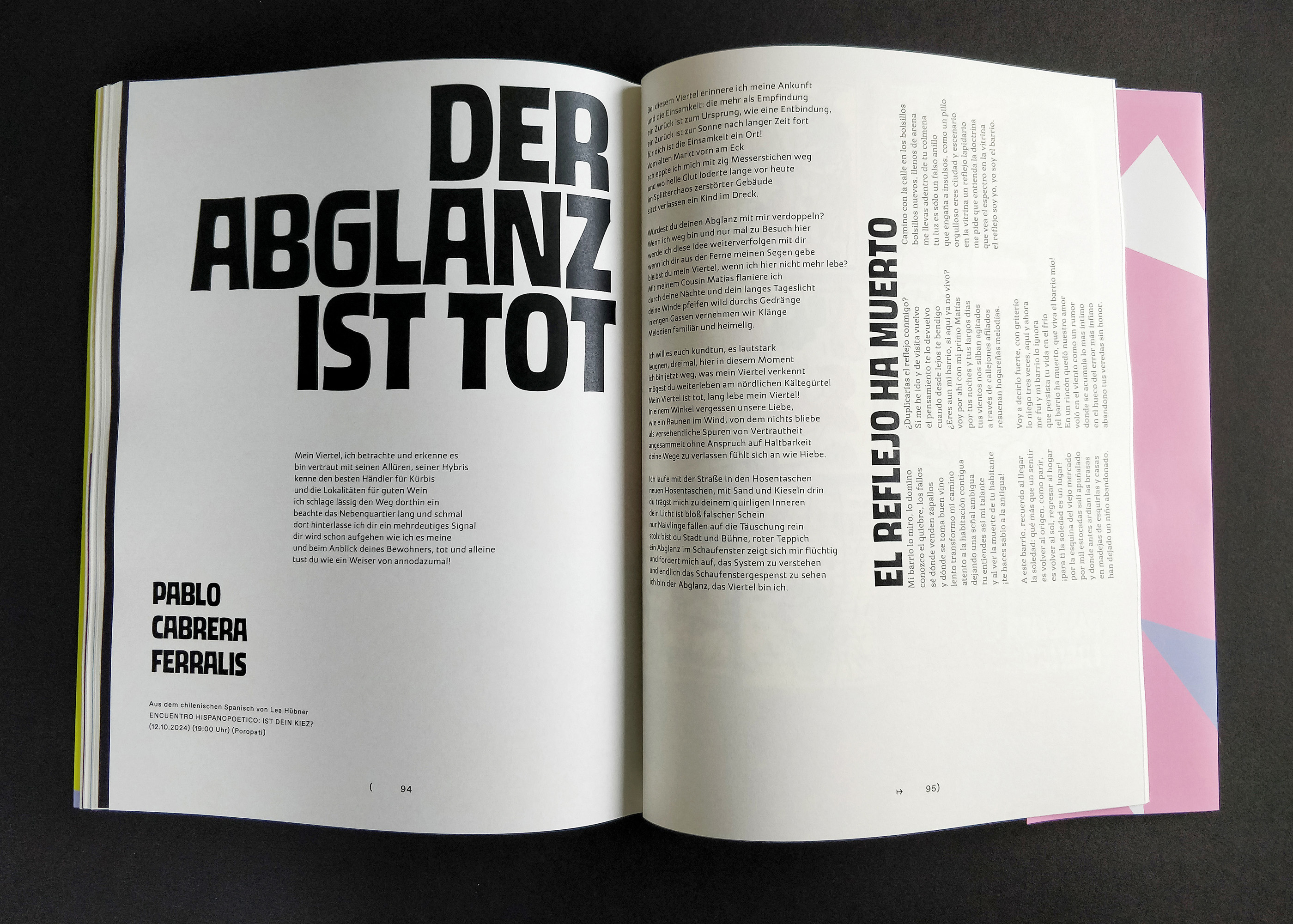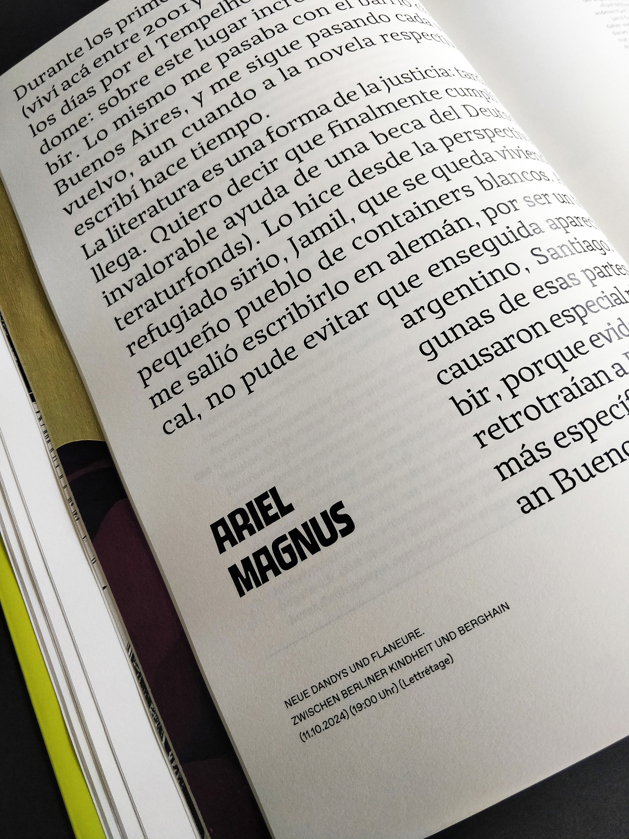 Barrio (Bairro) Berlin was a Latin American literature festival held in October 2024. Barrio is the certainty that Berlin is just another neighborhood of Latin America; it’s the reorganization of Berlin into Latin American neighborhoods. The catalog brings texts from literature, poetry, illustrations, and type from Latin American to this city that welcomes them. It opens the door to thinking about other structures (the jacket, the cover, the index, editorial text, title page, manifesto, frontispiece, body text, impressum, save page, back cover), other languages where there are no languages (in plural), but rather an immense desire to communicate. The boundary between languages dissolves because other codes and agreements emerge from this coexistence.