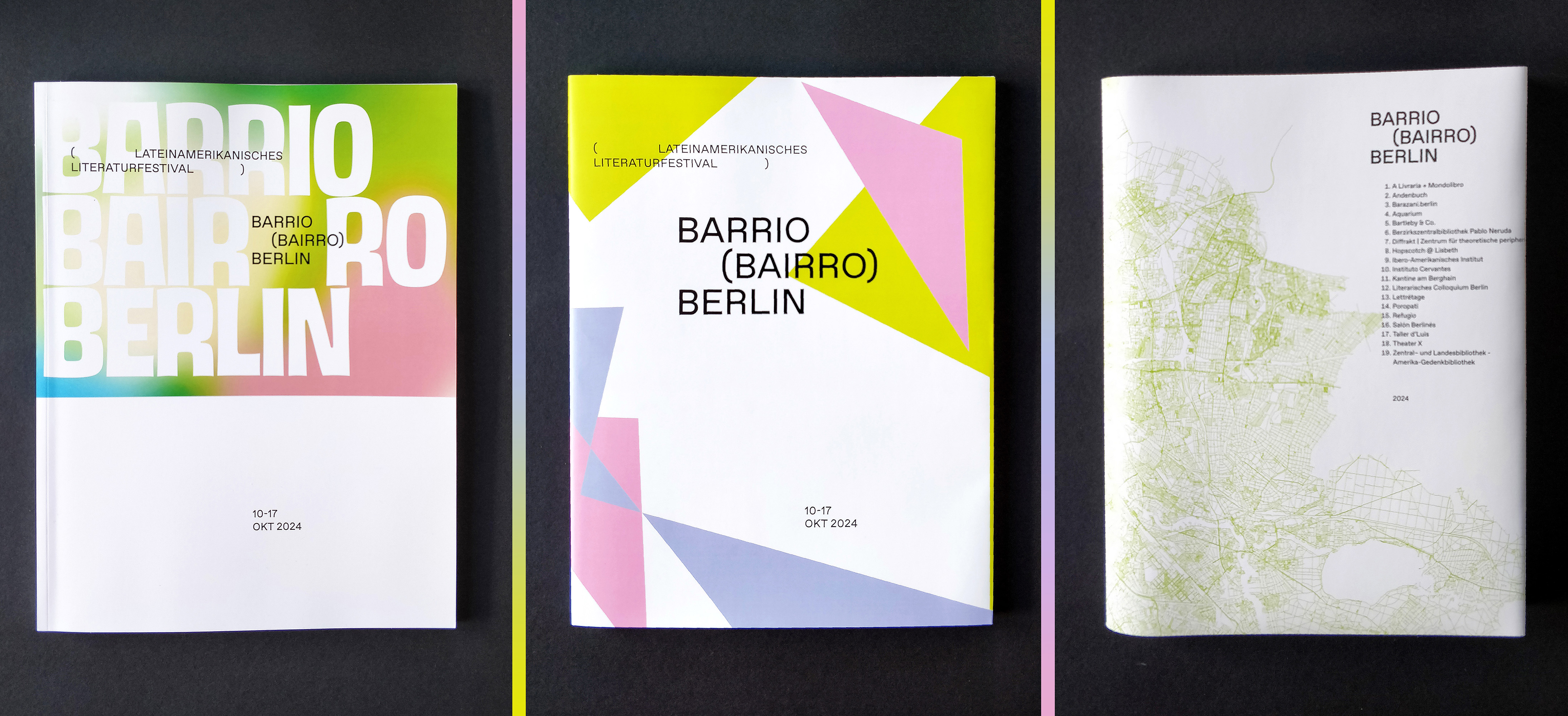 Barrio (Bairro) Berlin fue un festival de literatura latinoamericana celebrado en octubre 2024. Barrio es la certeza de que Berlin es un barrio más de latinoamérica, es la reorganización de Berlín en barrios latinoamericanos. El catálogo trae textos de autores, ilustraciones y tipografías latinas a esta ciudad que lo recibe. Se abre la puerta para pensar otros órdenes ( la sobrecubierta, la cubierta, el índice, texti edutirial, portadilla, manifiesto, title page, tripa, impressum, hinteres Vorsatzblatt, contratapa), otras formas, otros idiomas donde no hay idiomas (en plural), sino un deseo inmenso de comunicarnos, la frontera entre las lenguas se pierden porque otros códigos y acuerdos surgen de esta convivencia.