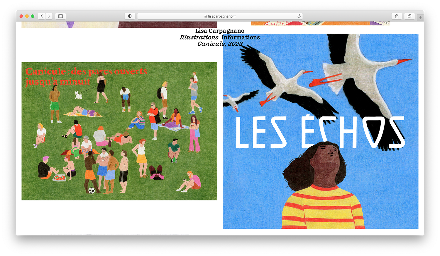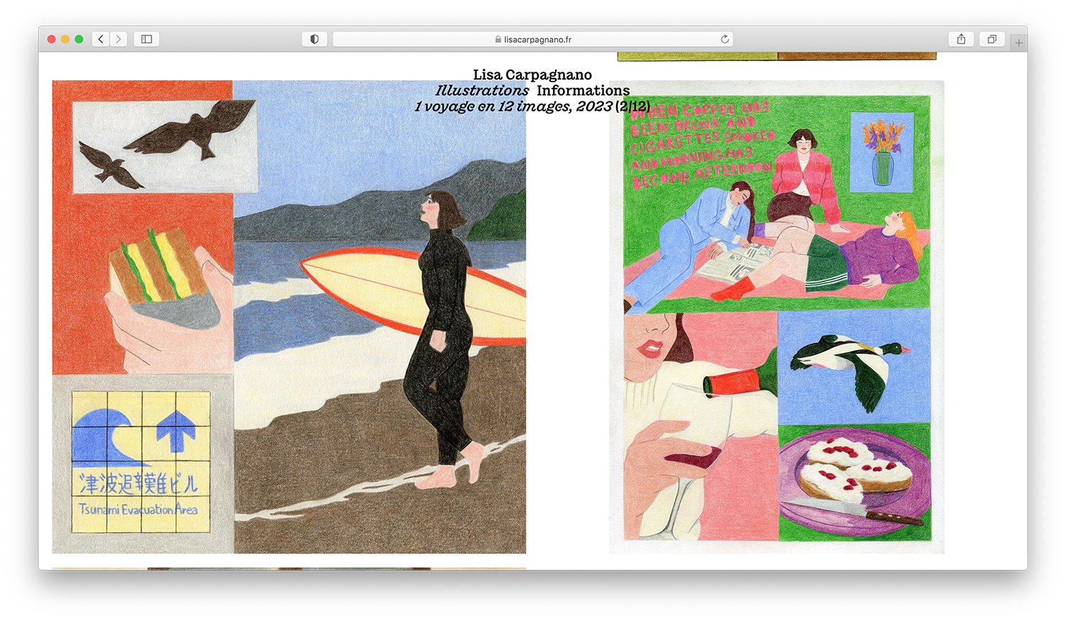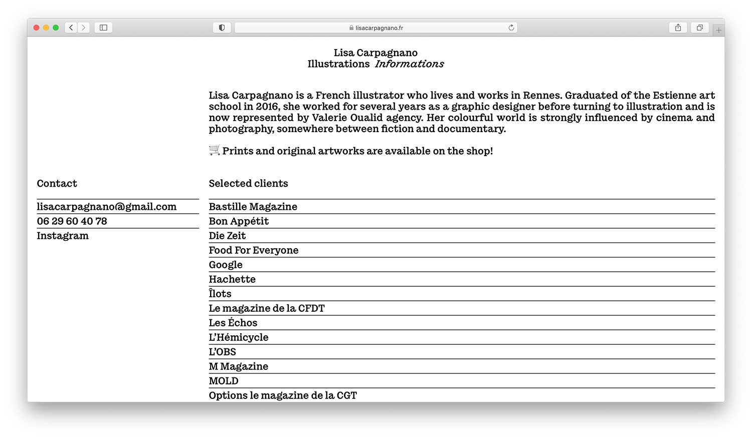 Lisa Carpagnano portfolio website Contributed by Lucas Le Bihan on Nov 2nd, 2024. Artwork published in September 2022. License: All Rights Reserved. The internet portfolio of French illustrator Lisa Carpagnano is a simple website with a top menu integrating both navigation and captions. The whole thing is set in a single size of the typeface Chantier, in Regular and Italic. Source: lisacarpagnano.fr Photo: Lucas Le Bihan. License: All Rights Reserved. Source: lisacarpagnano.fr License: All Rights Reserved. Source: lisacarpagnano.fr License: All Rights Reserved. Source: lisacarpagnano.fr License: All Rights Reserved. Typefaces More about ChantierGet Chantier Formats Web (5516) Topics Graphic Design (2957) Art (4570) Designers/Agencies Lucas Le Bihan (5) Tagged withillustrators (19)portfolios (752)websites (3471)one typeface family (1652)pre-release uses (687)lists (299)borders and rules (1085)menus (UI) (548) Artwork location France (2770) Rennes (19) In SetsPerfect Match (Lucas Bevilaqua) (135)PHANTA (Leonardo de la Fuente) (285) Post a comment Name Email – will not be published Website Your response Submit Comment More in Art Ways of Being. Advice for Artists by Artists2018BibliothèqueContributed by Florian Hardwig Staff Pick Der lange Arm der Stasi by Gabriele Stötzer and Anne König2022Malin GewinnerContributed by Felix Link Staff Pick Lucha Loco trade paperback edition2010Armin VitUnderConsiderationBryony Gomez-PalacioContributed by Nick Sherman Staff Pick Sponsor More in Web Rekkic. 2019RekkiDavid AnastácioContributed by Peiran Tan Sarah Bernhard2013We Are FellowsContributed by Malte Müller Triënnale Brugge website2023GlueContributed by Production Type Tom Tailor websitec. 2023unknownContributed by TypeType More Fonts In Use Het beest in ons, Natuurhistorisch Museum Rotterdam2022Studio SpassContributed by Production Type Staff Pick Le Lido de Paris logo and neon signc. 1968unknownContributed by Florian Hardwig Staff Pick The Stephen King Companion by George Beahm (ed.)1989Edward KingConnell-Zeko Type & GraphicsContributed by Ian Fine-Free Staff Pick Brasserie Uncle2017Benjamin LoryContributed by Benjamin Lory Staff Pick The New York Times Magazine, “The Lives They Lived” 2023 issue2023Claudia Isabel RubínBen GrandgenettGail BichlerContributed by Eliott Grunewald Staff Pick Die Legende von Paul und Paula movie poster1972Klaus VonderwerthContributed by Florian Hardwig Staff Pick The Form of Form, 4th edition of the Lisbon Architecture Triennale2016R2 DesignContributed by Tânia Raposo Staff Pick Die Gallus-Wühlkiste (Typotron)2012TGG Hafen Senn StiegerDaniela SpinelliContributed by Indra Kupferschmid Staff Pick
