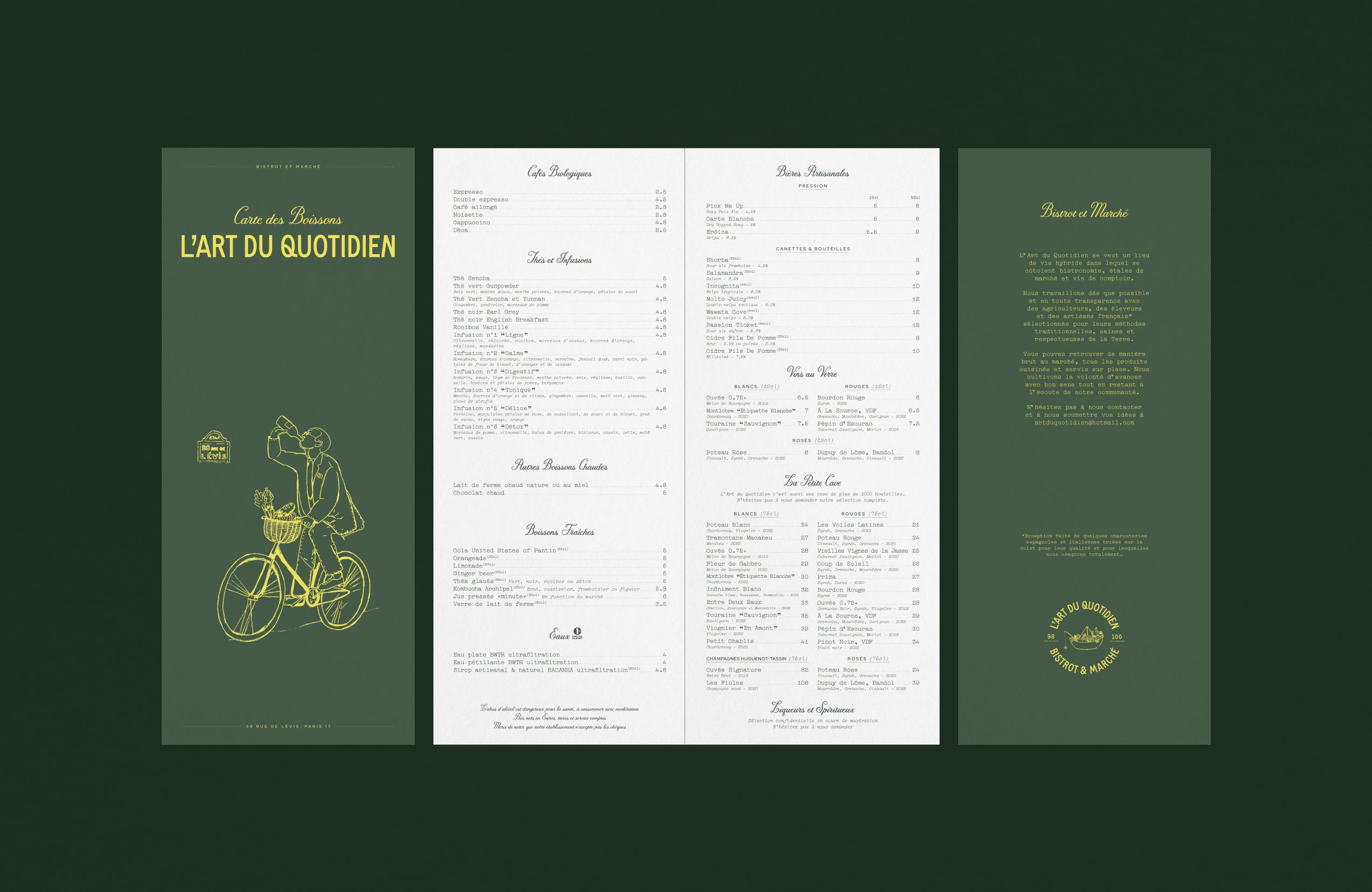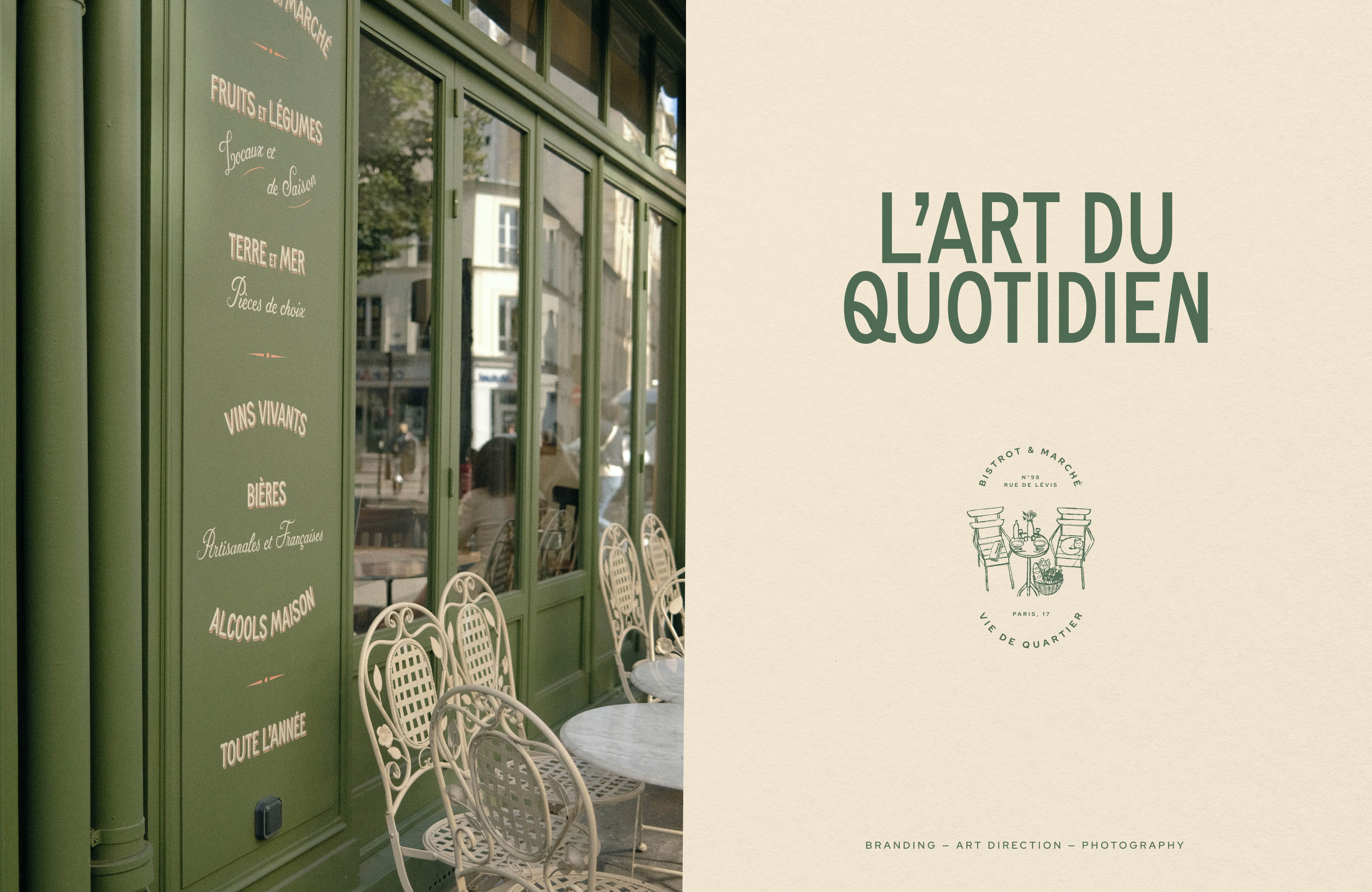 We created a tailor-made visual identity that aligns with L’Art du Quotidien: highlight the product, transparency, craftsmanship, small producers, conviviality, and quality, all while respecting an ecological and responsible approach. The goal for them was to become an institution in a vibrant Parisian neighborhood, showcasing exceptional expertise with an excellent quality-to-price ratio.