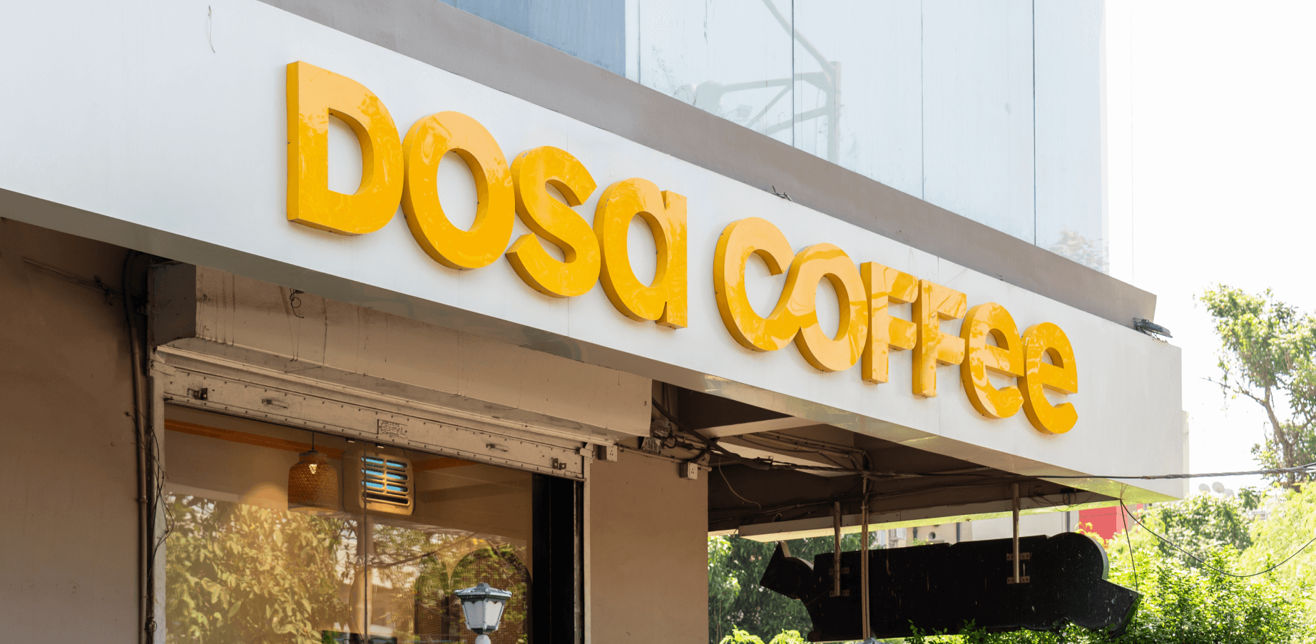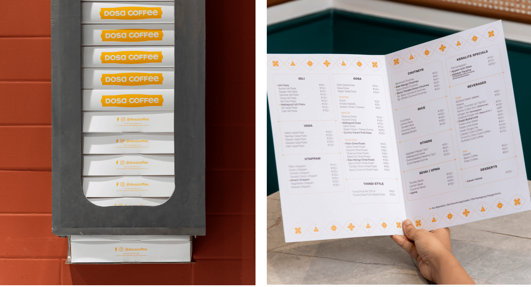 Dosa Coffee has been serving authentic South Indian food in Kolkata, India, since the past five years. Known for its no-fuss eateries, and with growing outlets and multiple kinds of offerings, it was struggling to develop consistent brand language. It needed an efficient branding system to work across different formats while retaining its original essence.