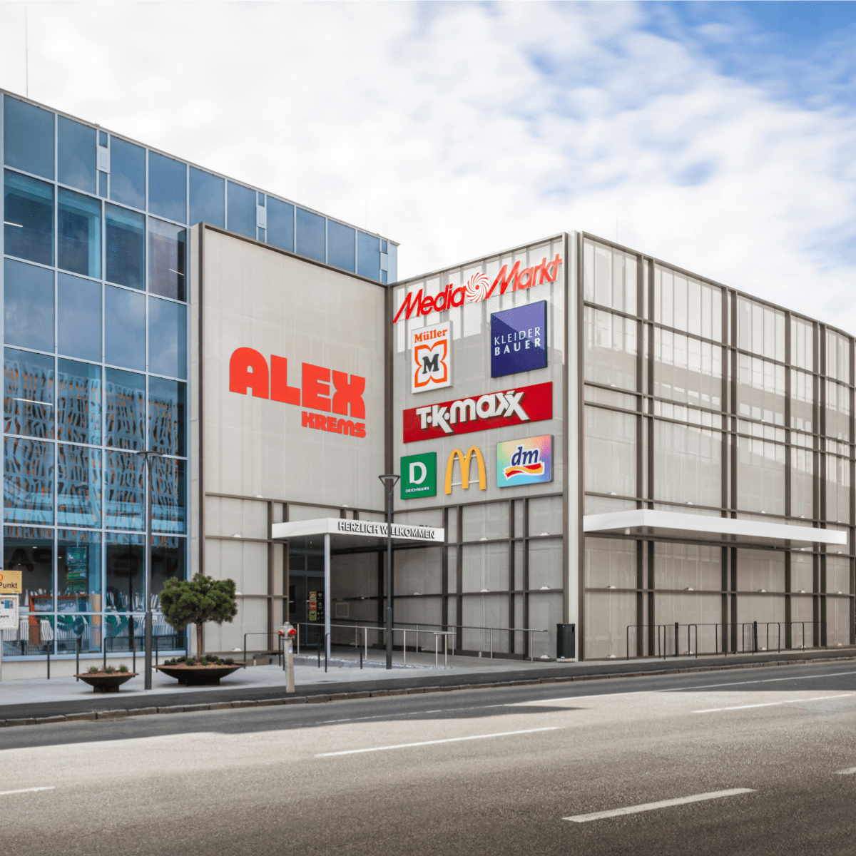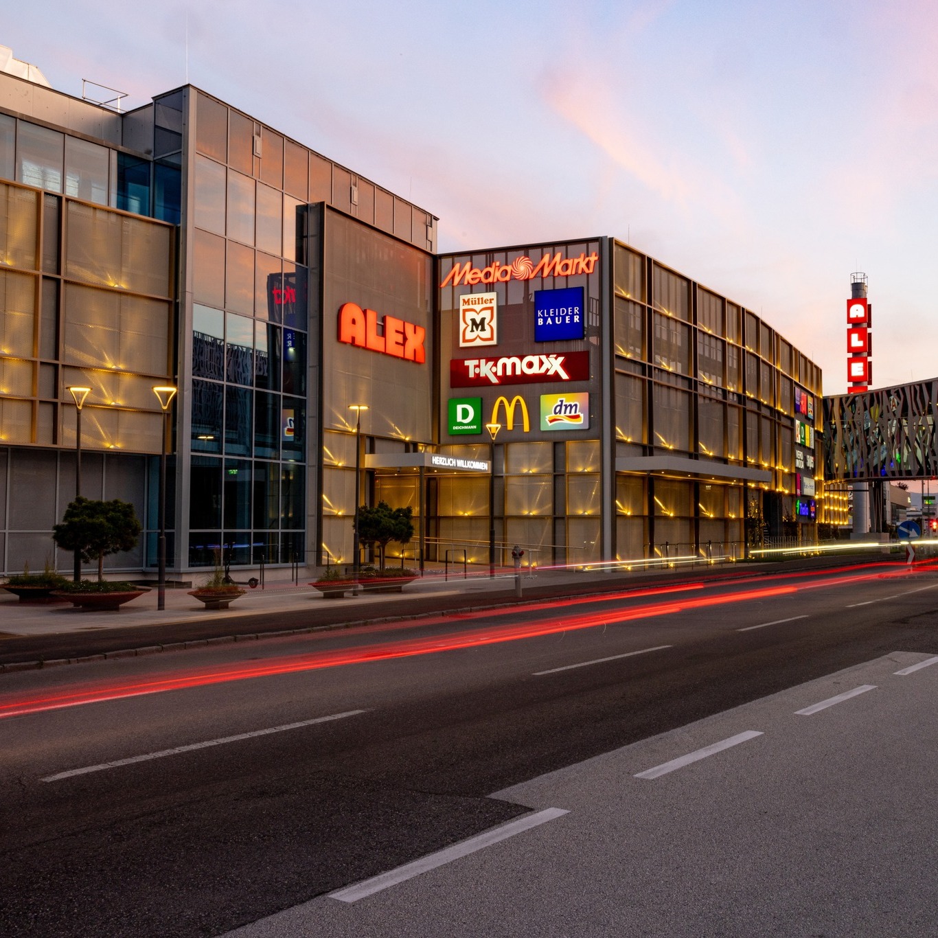 In spring 2024, the Bühl Centre shopping mall in Krems an der Donau in Austria becomes ALEX Krems. The new logotype uses the Baustraßetypeface (designed by Fantasia Type and available on Future Fonts) and is applied in numerous media including inflatable structures, three-dimensional letters and illuminated signs.