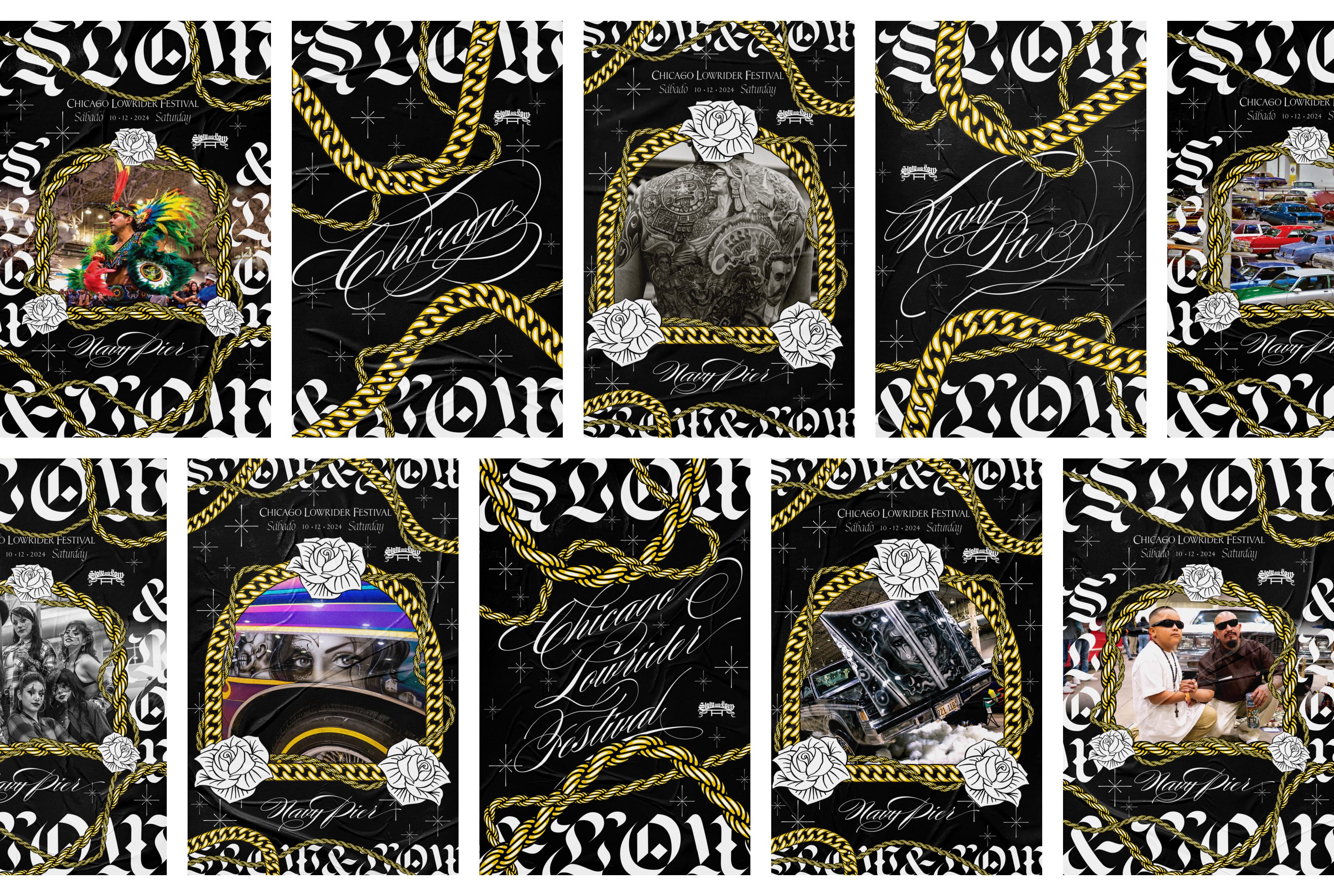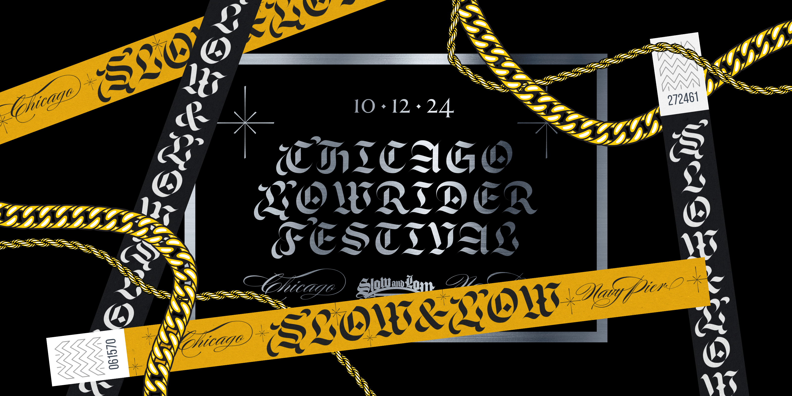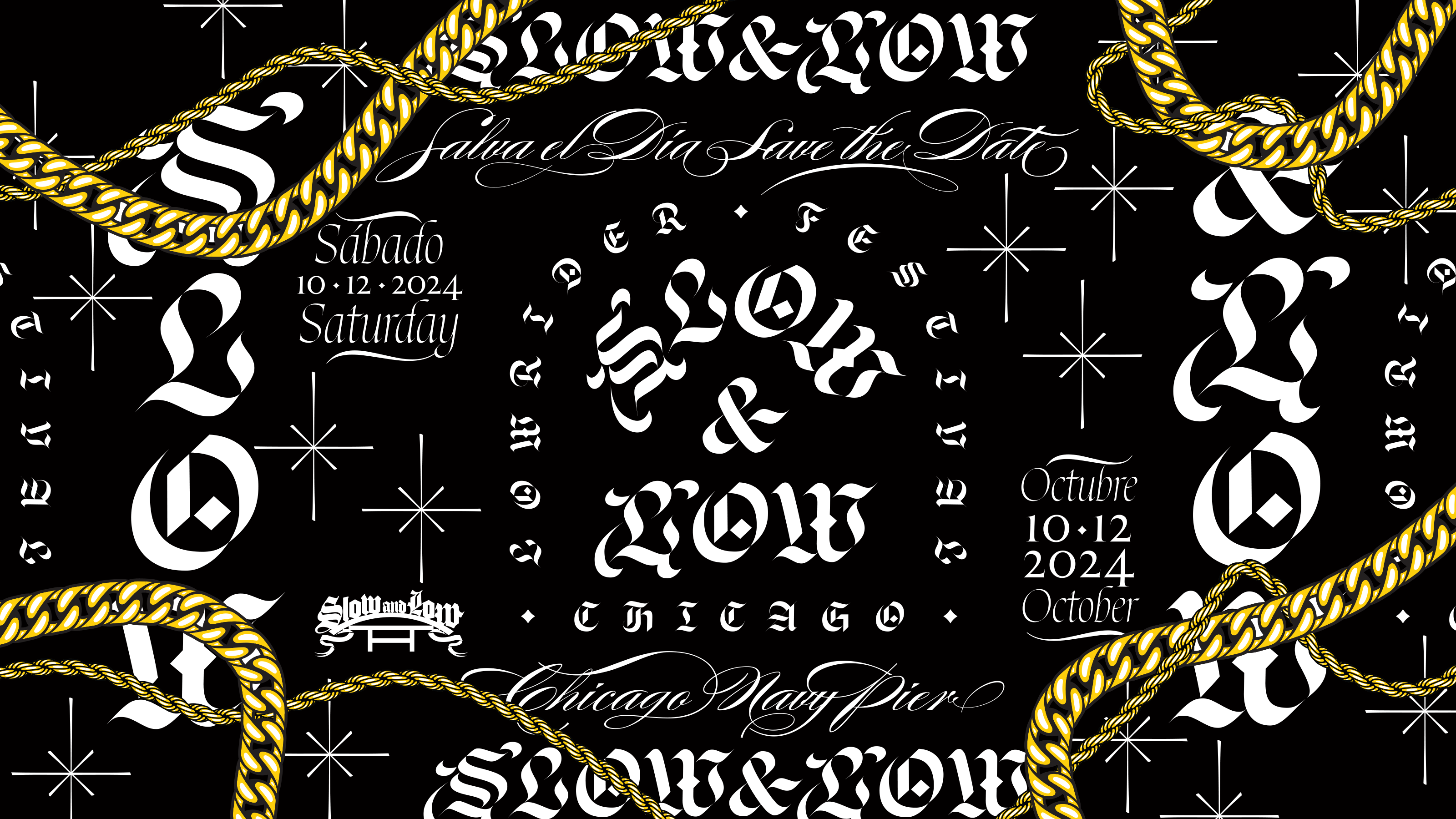The 2024 Slow & Low identity that Span designed amplifies a story of exquisite craftsmanship and celebration, drawing inspiration from the intricate artistry of lowrider culture. The typographic palette features a customized version of Lucas Sharp and Wei Huang’s blackletter typeface, Respira. Adding a layer of joyful elegance this scribe-like blackletter is complemented by Alejandro Paul’s Burgues Script, based on master calligrapher Louis Madarasz’s work. Rounding out the collection is Lucas Sharp’s limited edition Sharp Freehand, a calligraphic typeface inspired by master letterer Oscar Ogg, and Sharp’s Greenstone that is connected to the tradition of tombstone carving. Together, from chains to script, the festival identity offers a striking, refined edge that mirrors the masterpieces showcased at Slow & Low.
