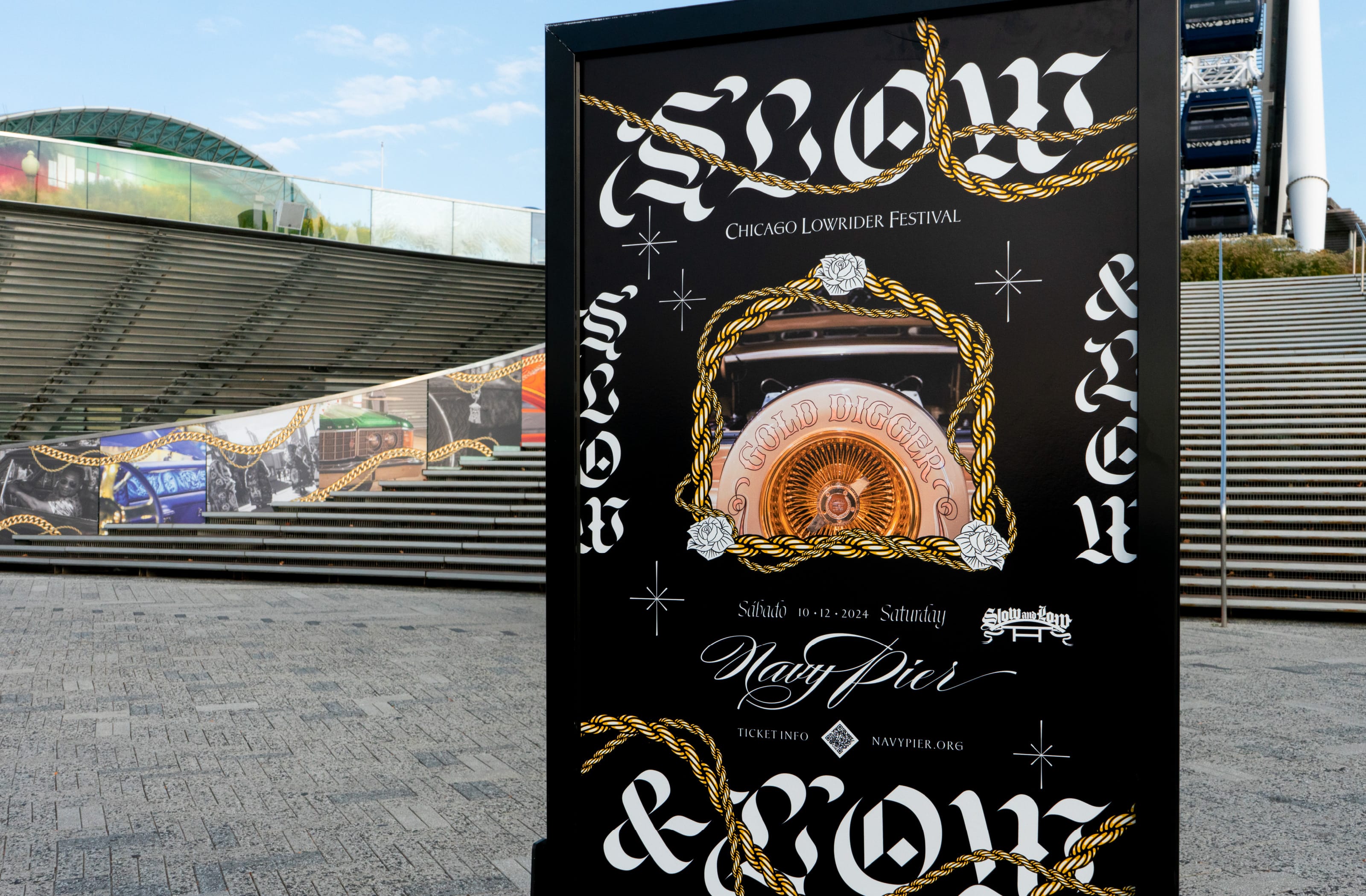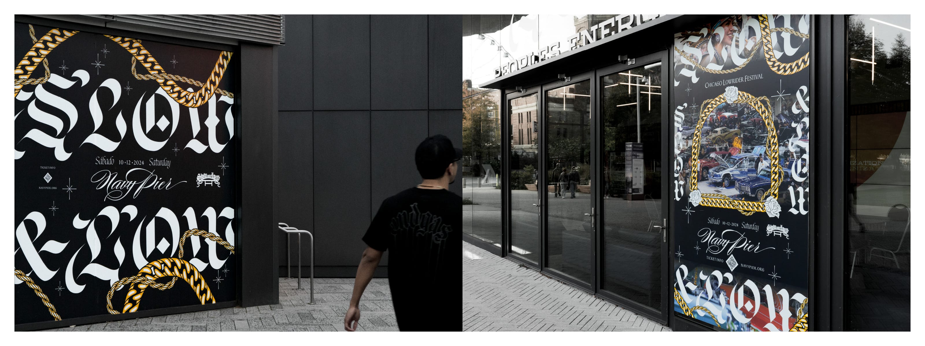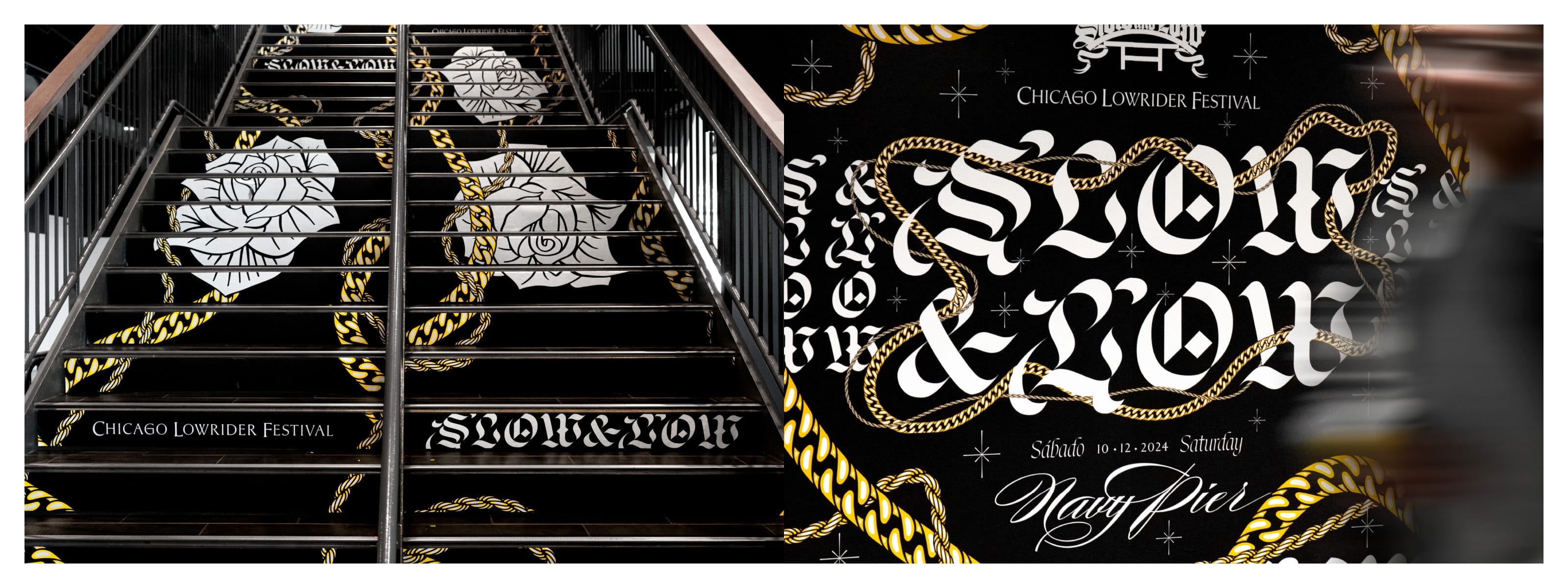 The 2024 Slow & Low identity that Span designed amplifies a story of exquisite craftsmanship and celebration, drawing inspiration from the intricate artistry of lowrider culture. The typographic palette features a customized version of Lucas Sharp and Wei Huang’s blackletter typeface, Respira. Adding a layer of joyful elegance this scribe-like blackletter is complemented by Alejandro Paul’s Burgues Script, based on master calligrapher Louis Madarasz’s work. Rounding out the collection is Lucas Sharp’s limited edition Sharp Freehand, a calligraphic typeface inspired by master letterer Oscar Ogg, and Sharp’s Greenstone that is connected to the tradition of tombstone carving. Together, from chains to script, the festival identity offers a striking, refined edge that mirrors the masterpieces showcased at Slow & Low.