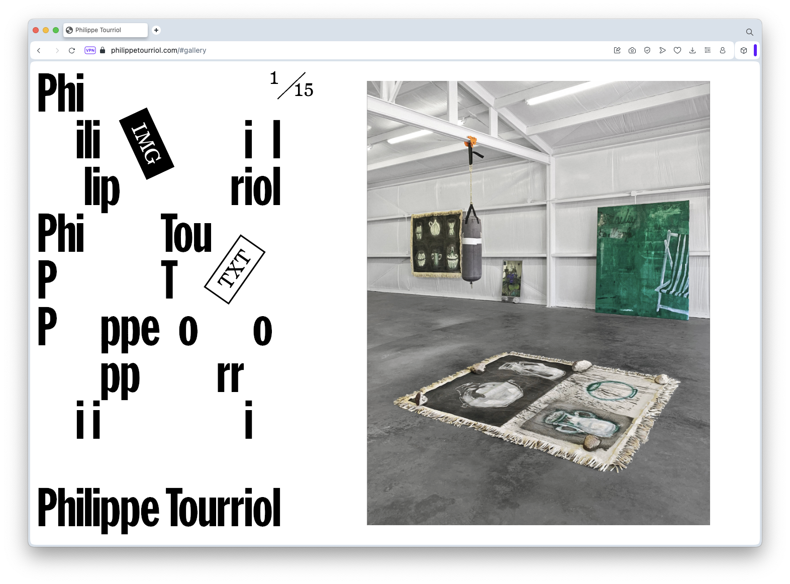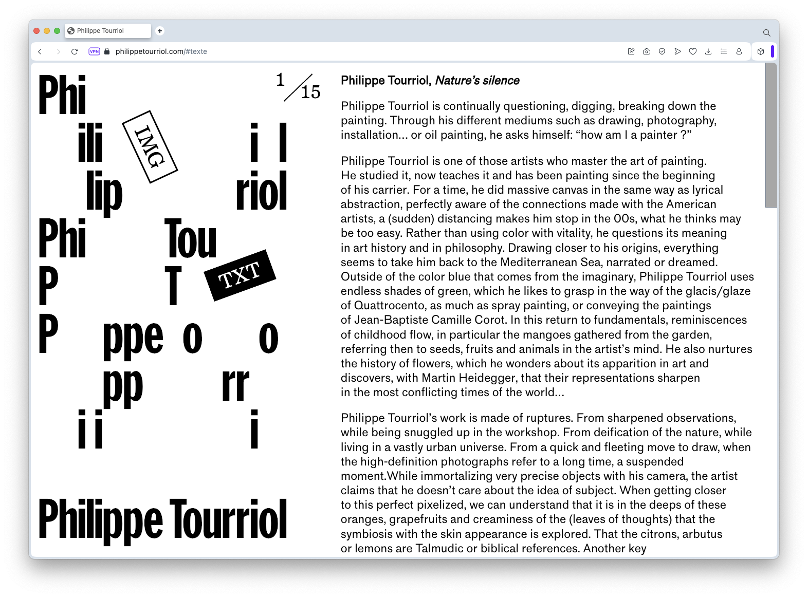 Here for Philippe Tourriol’s website, we tried different fonts, but we rapidly ended on Franklin Hex because this font was able to achieve the perfect balance between text and aesthetic. Since the artist is also working in the United States (Marfa), we were quite happy with their American filling of the composition. As you said, thanks to the font, we didn’t play with the kerning.