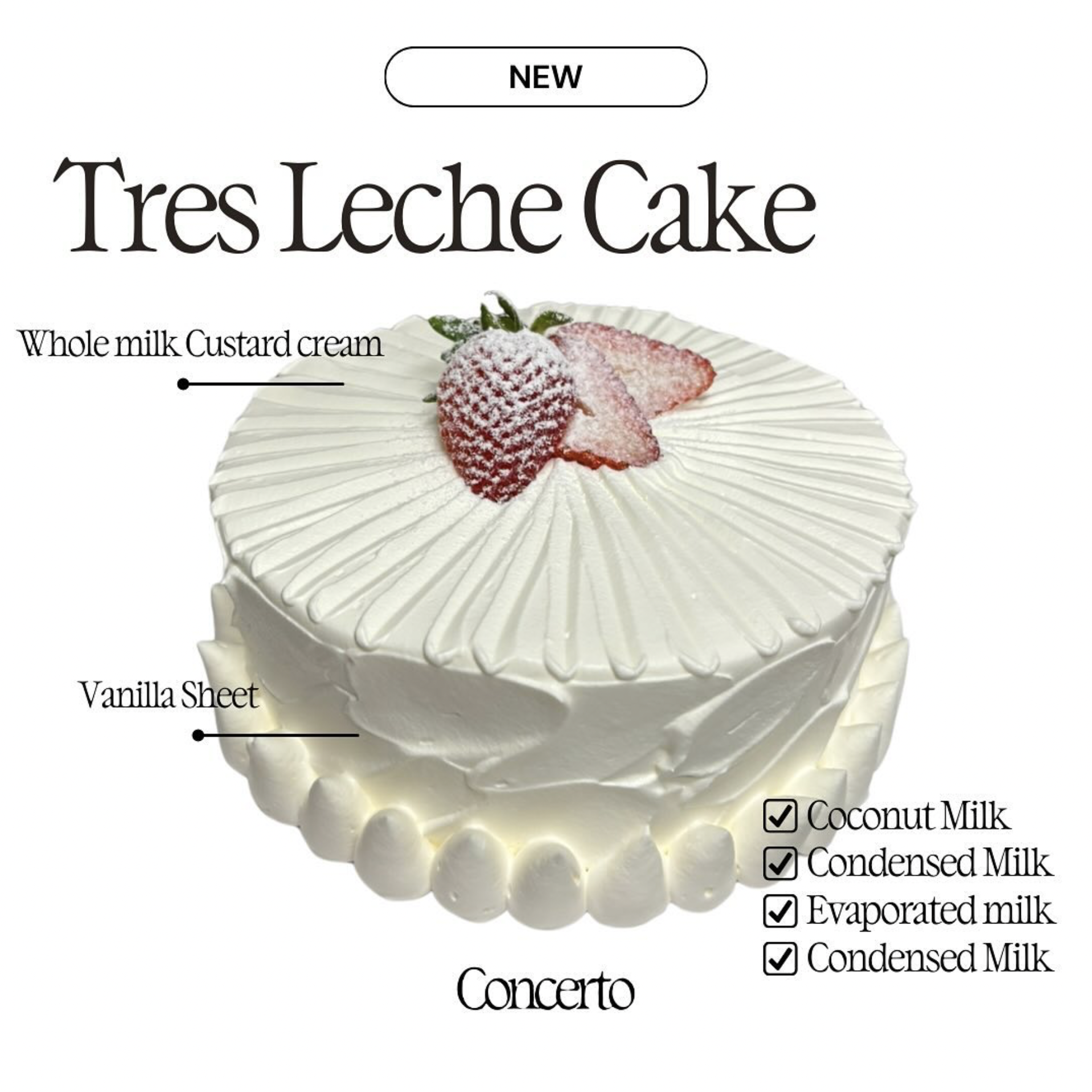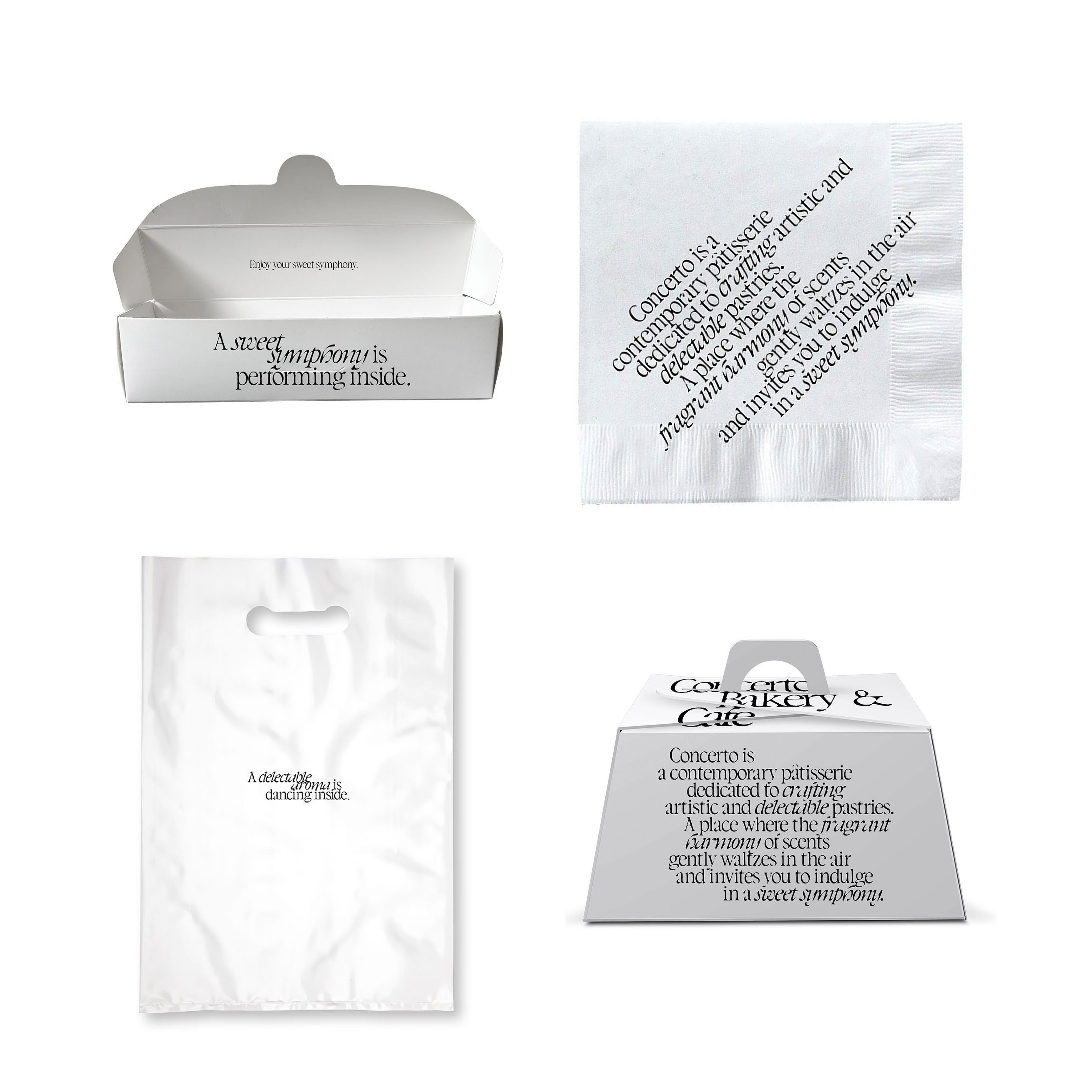 Concerto is a contemporary patisserie dedicated to crafting artistic and delectable pastries, located in the HMart store, located in Los Angeles’ Koreatown. The text-based visual identity of the bakery pairs DaVinci by Virgile Flores with Apple Myungjo; both are softened with a contour line that makes the letters appear like stencils, virtually dissolving into the white background.
