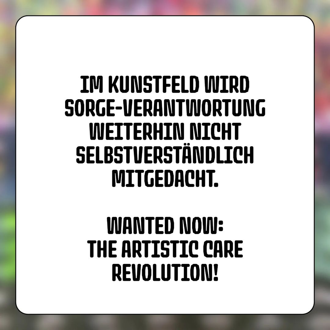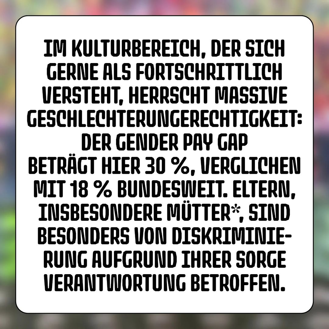 Women*, especially mothers*, continue to perform the majority of un(under)paid care work. This inequality is exacerbated in the art industry, where the gender pay gap is higher than the average for society as a whole. Discrimination on the basis of care work is widespread, and children are often seen as career killers for their artist mothers*.