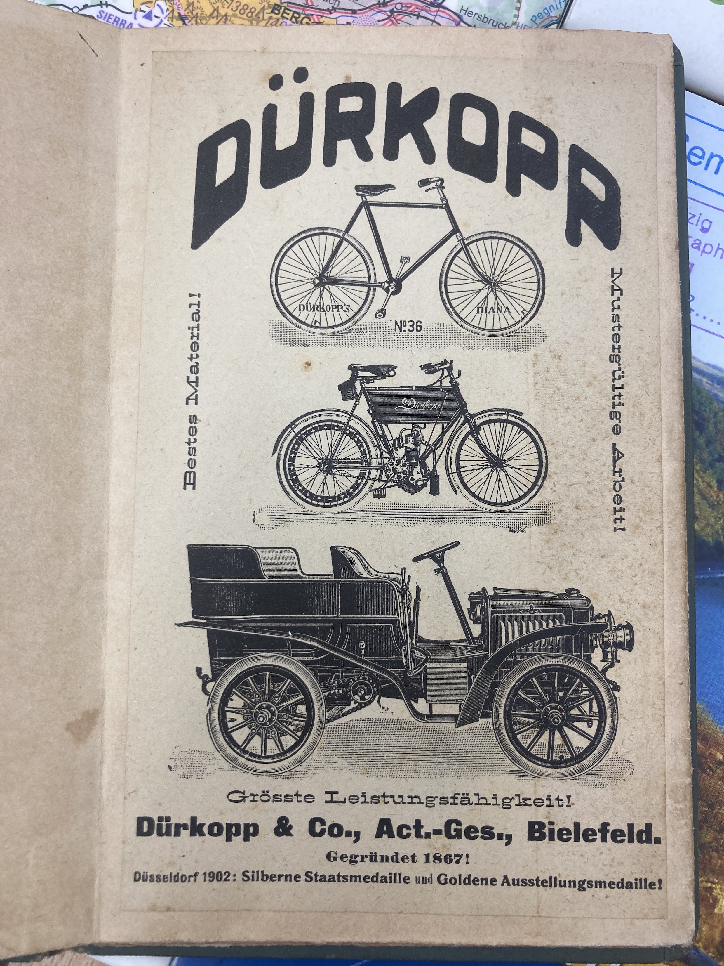 The book includes maps for bicycle tours in Saxony. Dürkopp was a producer of sewing machines, bicycles, motorcycles and cars, founded in 1867 in Bielefeld. The company still exists today under the name Dürkopp Adler.
