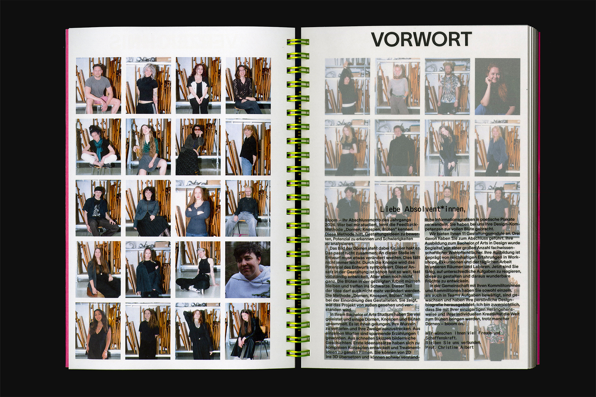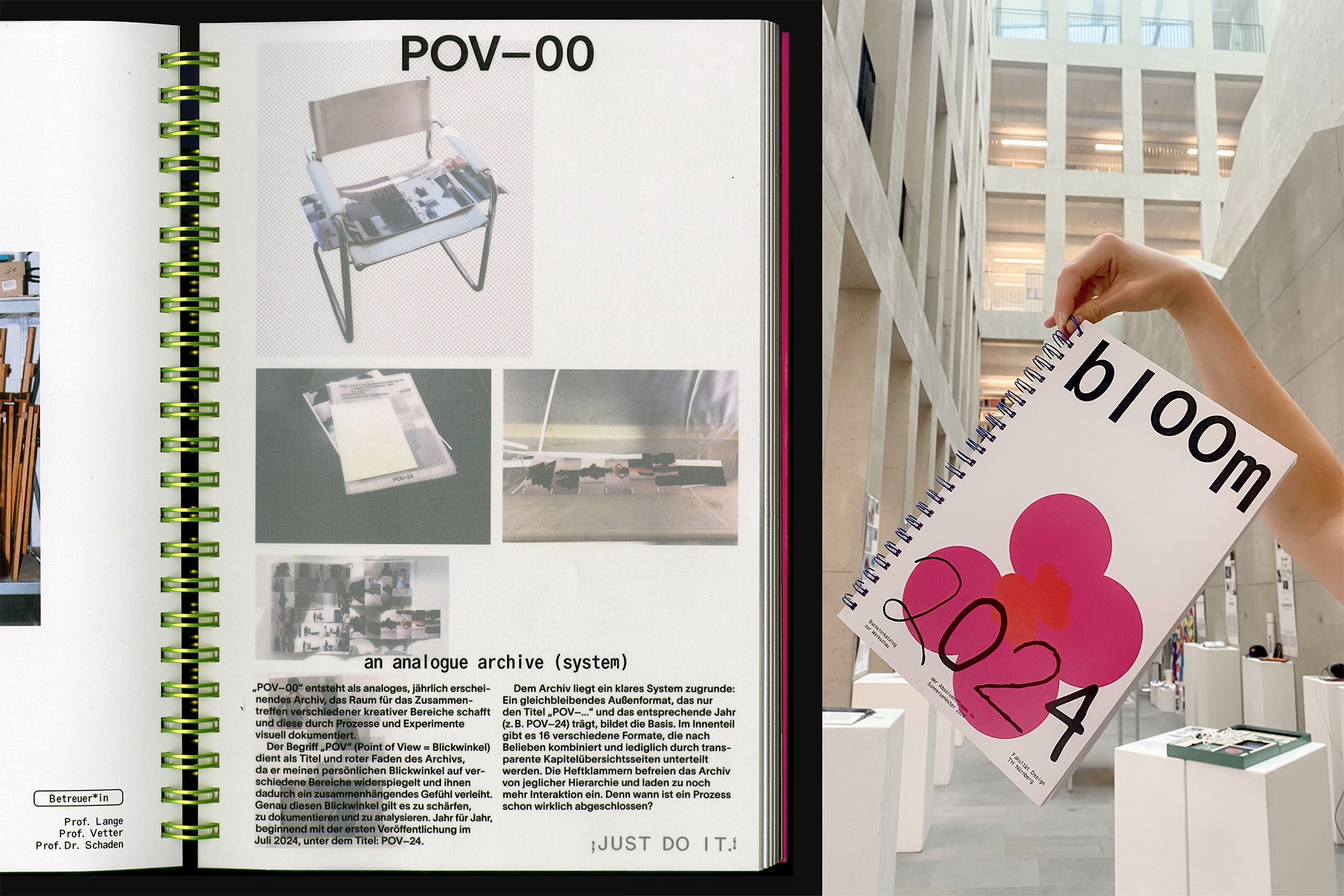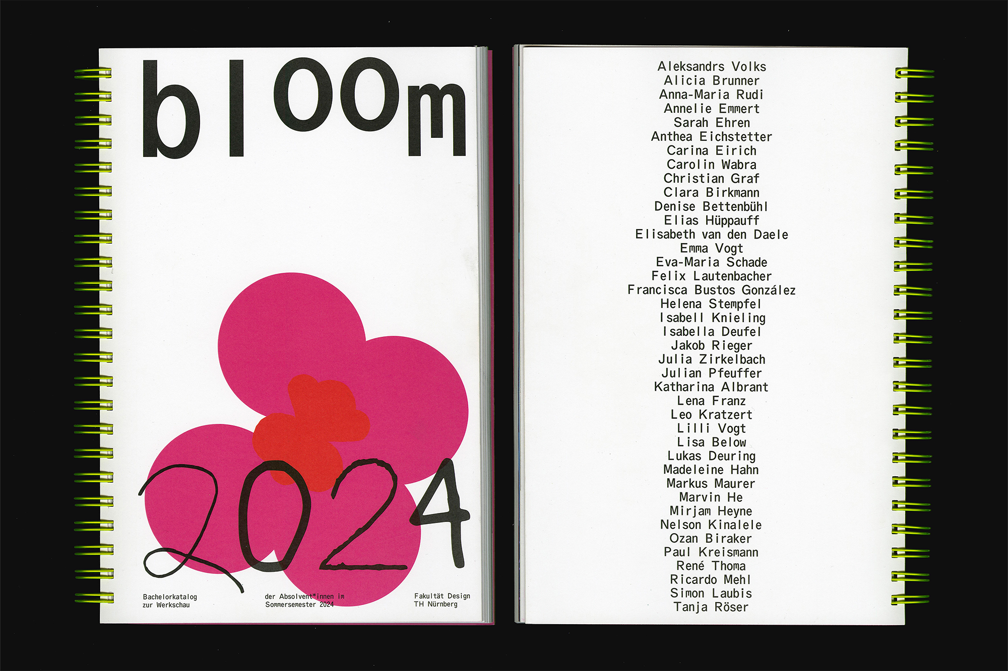 The exhibition bloom – Absolvent:innen 2024 showcases the works of graduates from the summer semester at the TH Nürnberg, Faculty of Design. In the catalog, each graduate was allocated a double-page spread with a transparency overlay for their work. The catalog highlights the diversity of the university’s eleven different classes.