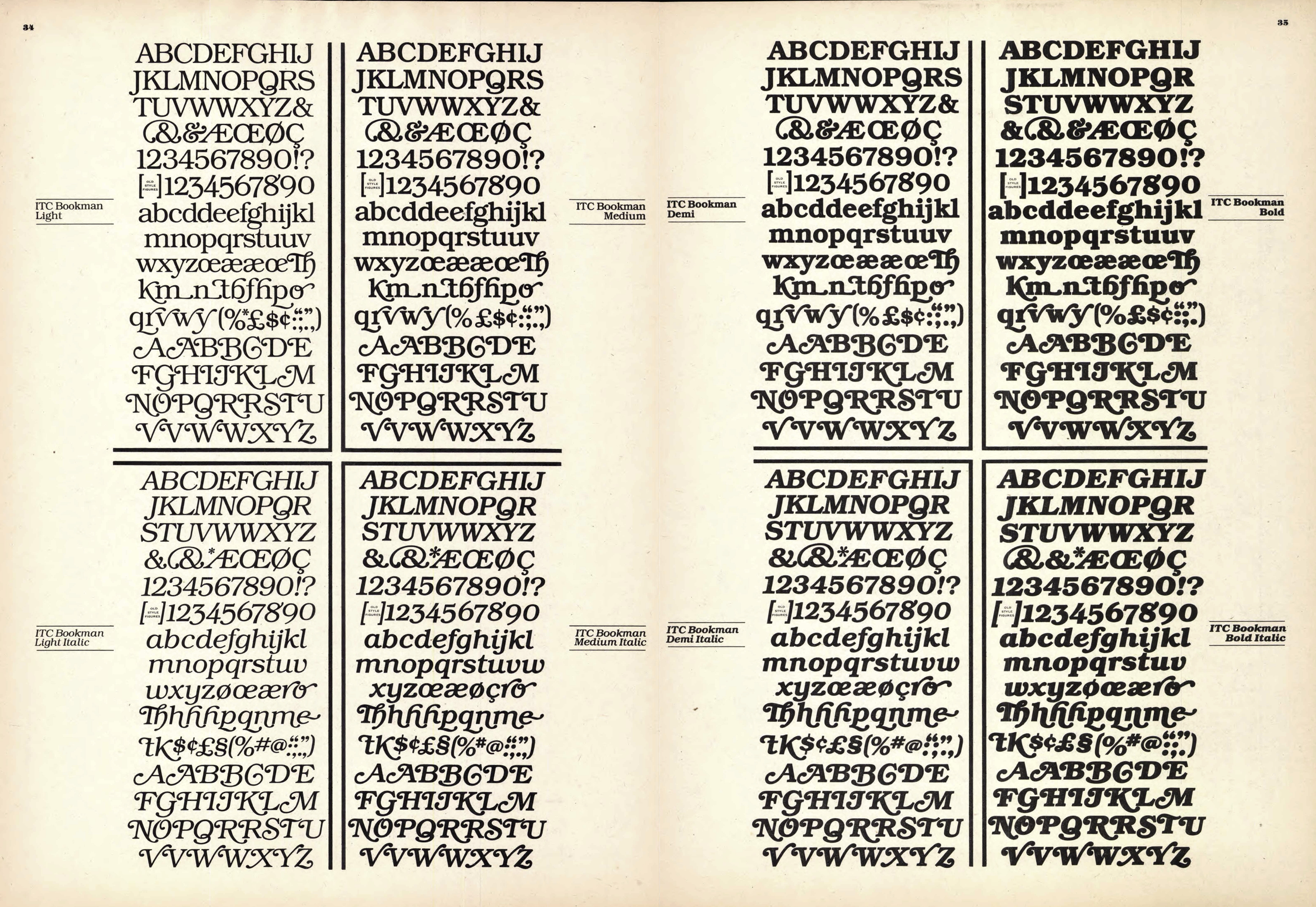 Announced in late 1975 in U&lc, vol. 2, No. 4, ITC Bookman spans four weights in roman and italic. The title is set in caps from the Bold weight, with one of the alternate ampersands, several swash forms, and some modifications: the nested LI pair was made from parts of existing glyphs, the top of the second G is retracted to make space for the ampersand, and the swash forms for V and R lost the ball terminal on the top left to enable tight letterspacing.