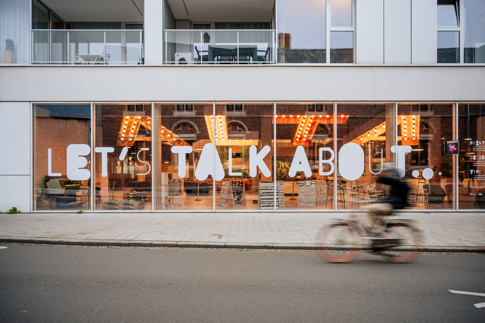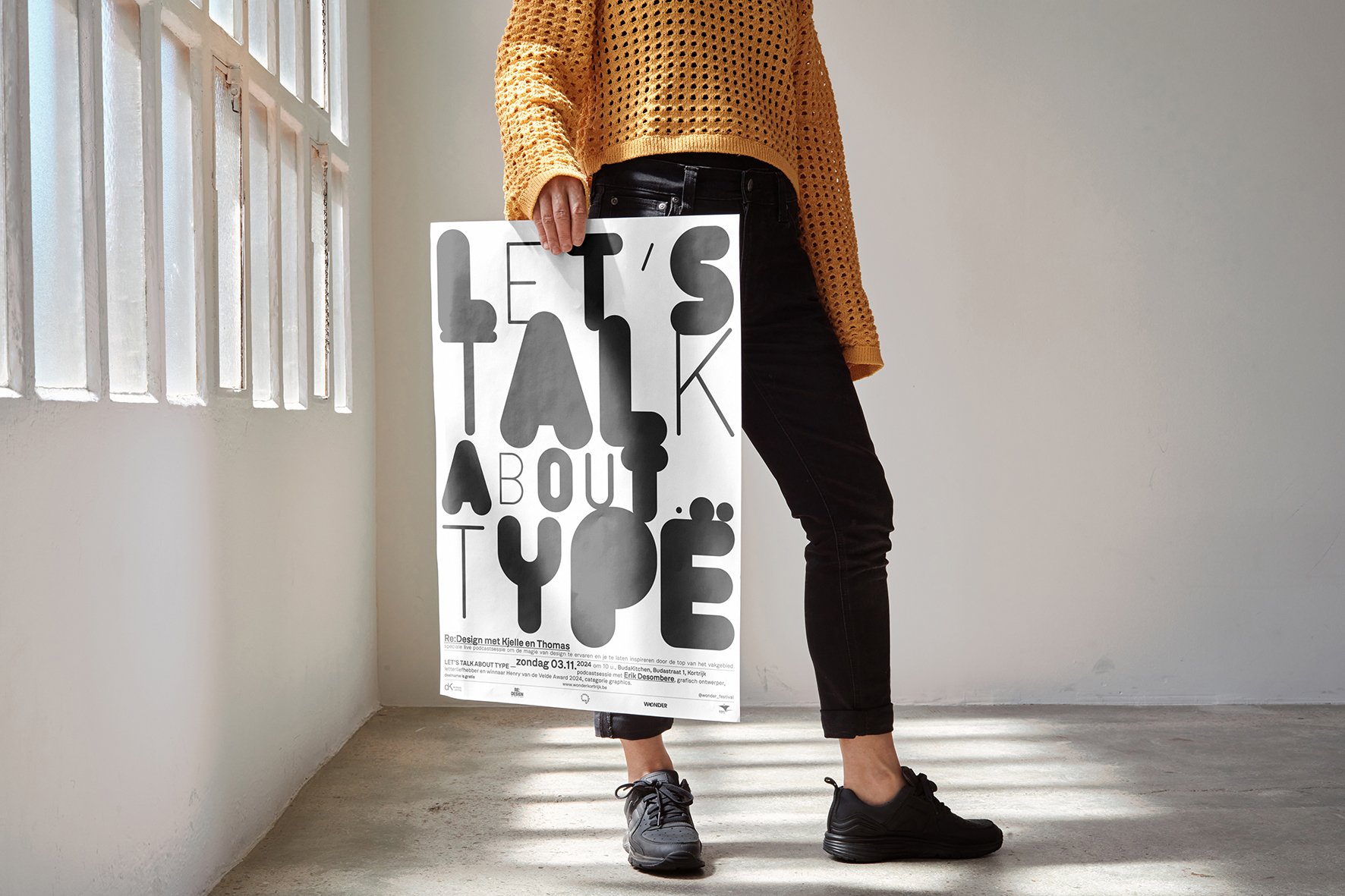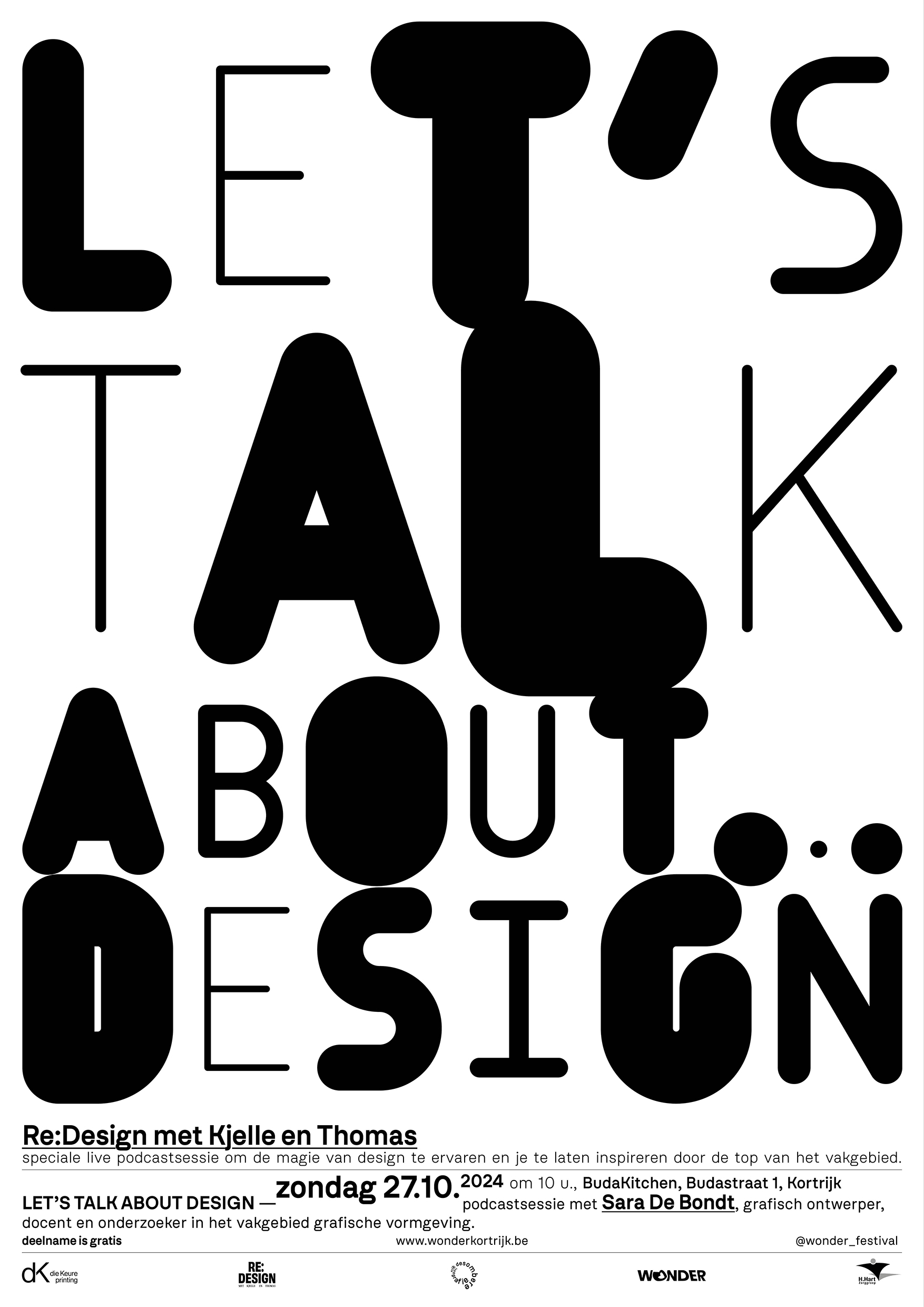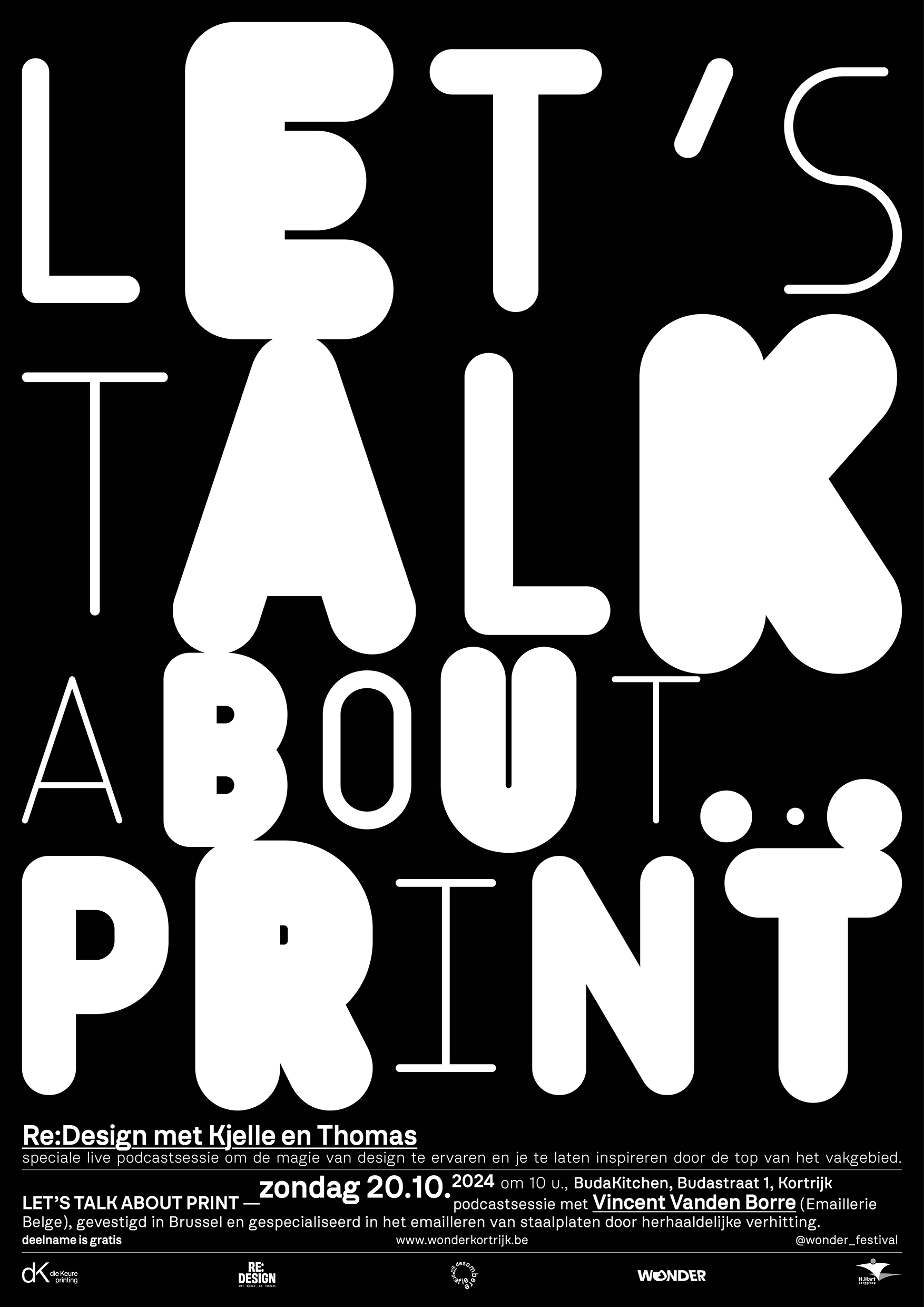 A series of three posters, each positive and negative: Let’s Talk about… Type, Print, Design. The posters were designed for a live podcast recording during the Wonder Festival in Kortrijk, Belgium. This festival brings young creative force and established values from all disciplines – from design, innovation, technology to art – will set out their vision of a better future. Wonder takes you along a free trail of special places in Kortrijk UNESCO City of Design, with stunning exhibitions, installations and events.
