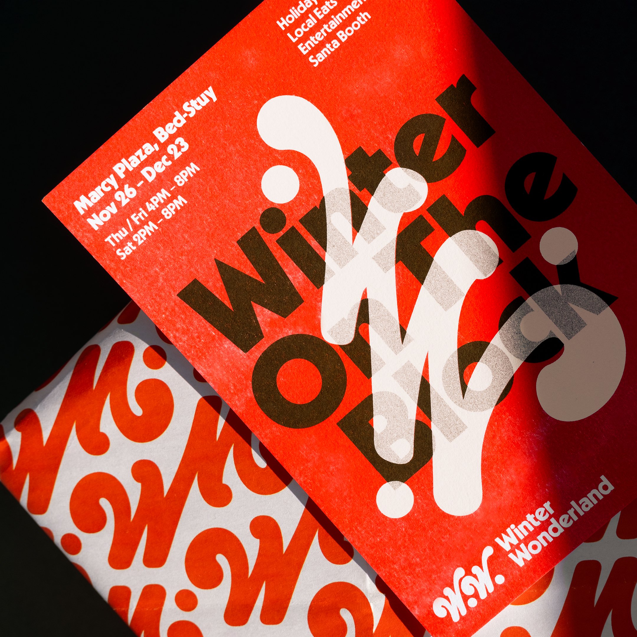 Through the Neighborhoods Now initiative, Gretel partnered with Bed-Stuy’s community leaders to bring Winter Wonderland to life through a joyful visual identity that celebrates Bed-Stuy’s vibrant culture and history while wrapping the neighborhood with holiday cheer. […] At the heart of the Winter Wonderland look & feel is a pair of dynamic “Ws” set in Esselte Letraset’s iconic typeface Lazybones. The letterforms fluidly transform to become inclusive and approachable, reconfiguring and combining into various holiday decorations, from snowflakes, christmas trees, menorahs, to patterns that wrap the neighborhood with holiday spirit.