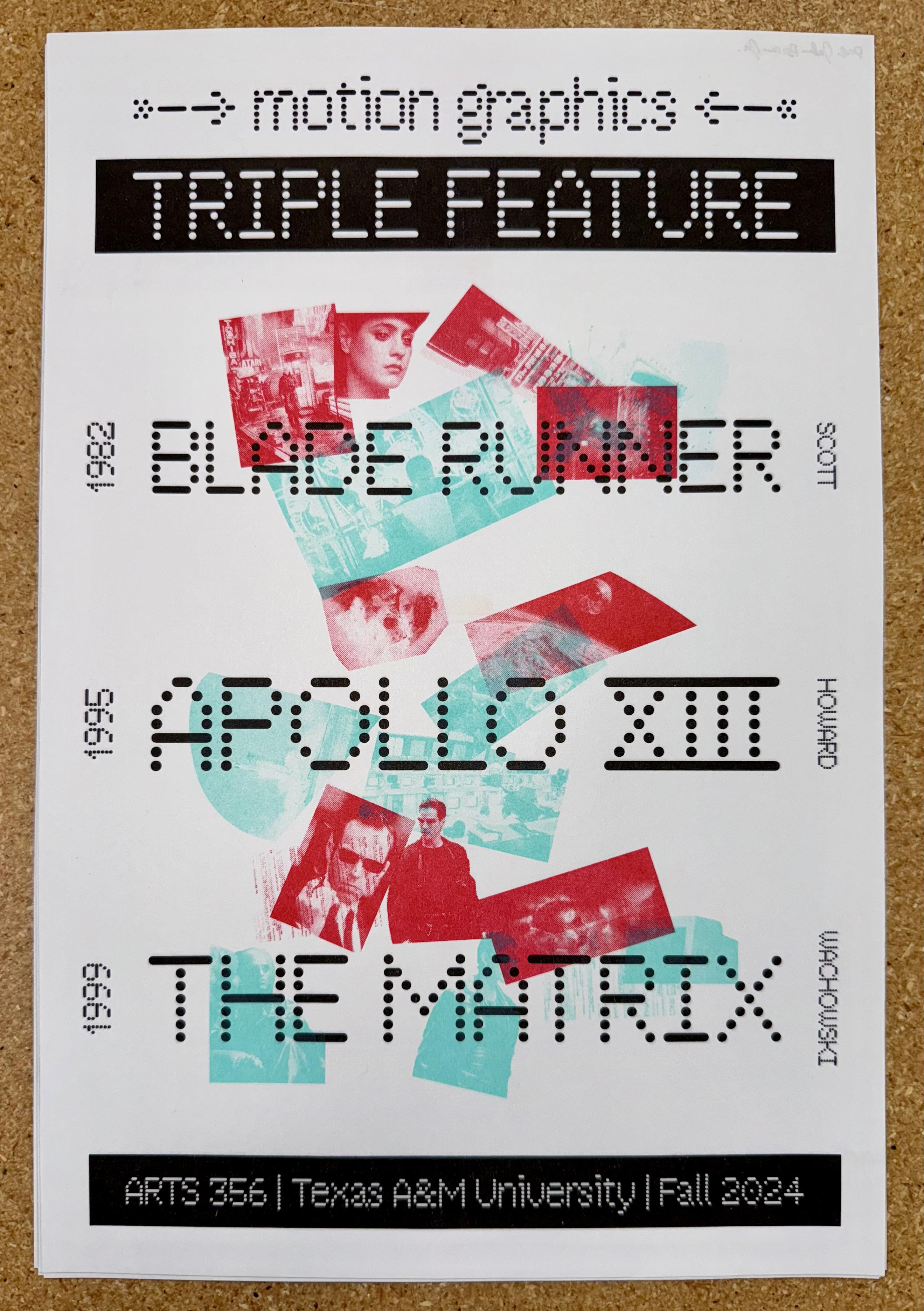 A poster celebrating the end of the first motion graphics course at Texas A&M University with a triple feature of films that the students developed opening titles for. It is printed on the Risograph using three inks (Black, Bright Red, and Mint) and featuring the in-progress typeface by Mass-Driver, MD Thermochrome.