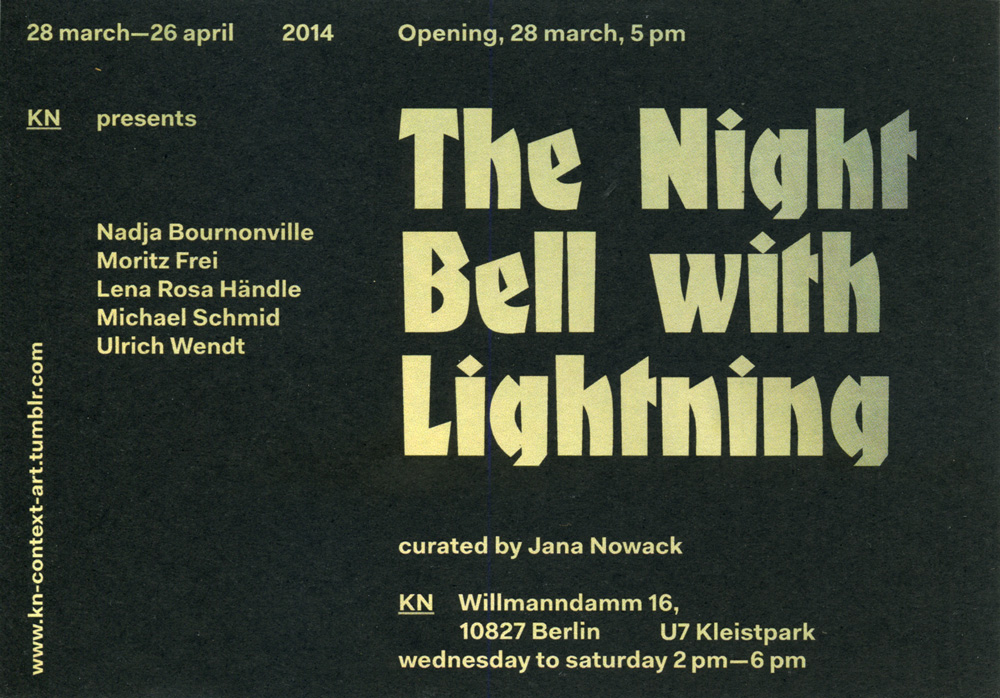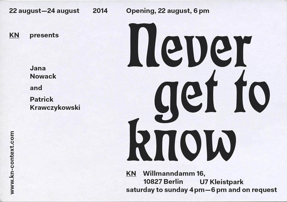 A series of flyers for exhibitions at gallery KN, an art space in Berlin-Schöneberg founded by Jana Nowack. The flyers were designed by arc, each with a different titling typeface. The accompanying sans serif is Thomas Thiemich’s Fakt from 2010.