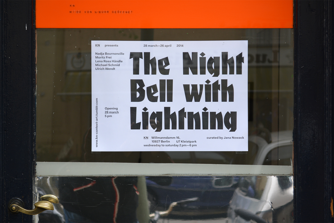 Poster for The Night Bell With Lightning in the window of KN, ft. Fanfare.