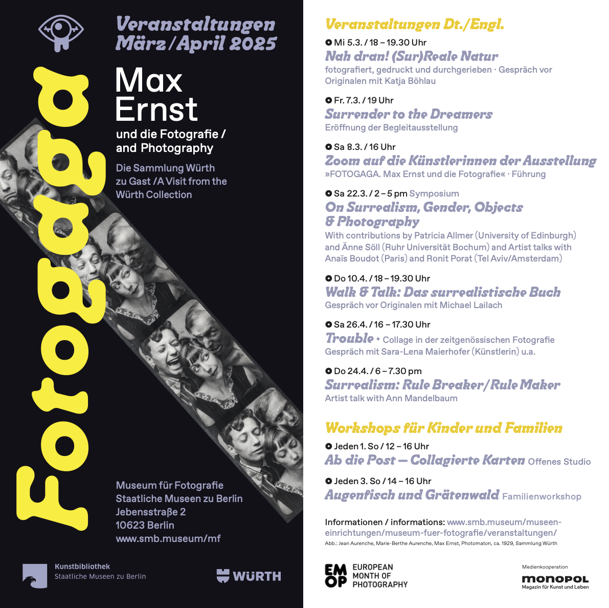 Max Ernst holds a prominent position within Dada and Surrealist Art. His name stands for genre-bending works that combine dream and reality. The exhibition […] is the first to search for points of intersection between his work and photography. Commemorating Surrealism’s centenary, the Museum für Fotografie (Museum of Photography) is showing a representative overview of Max Ernst’s artworks from the Würth Collection. These are complemented by works from the Kunstbibliothek, Kupferstichkabinett, Sammlung Scharf-Gerstenberg and the Staatsbibliothek zu Berlin, and other exceptional loans from museums and private collections in France and Germany.