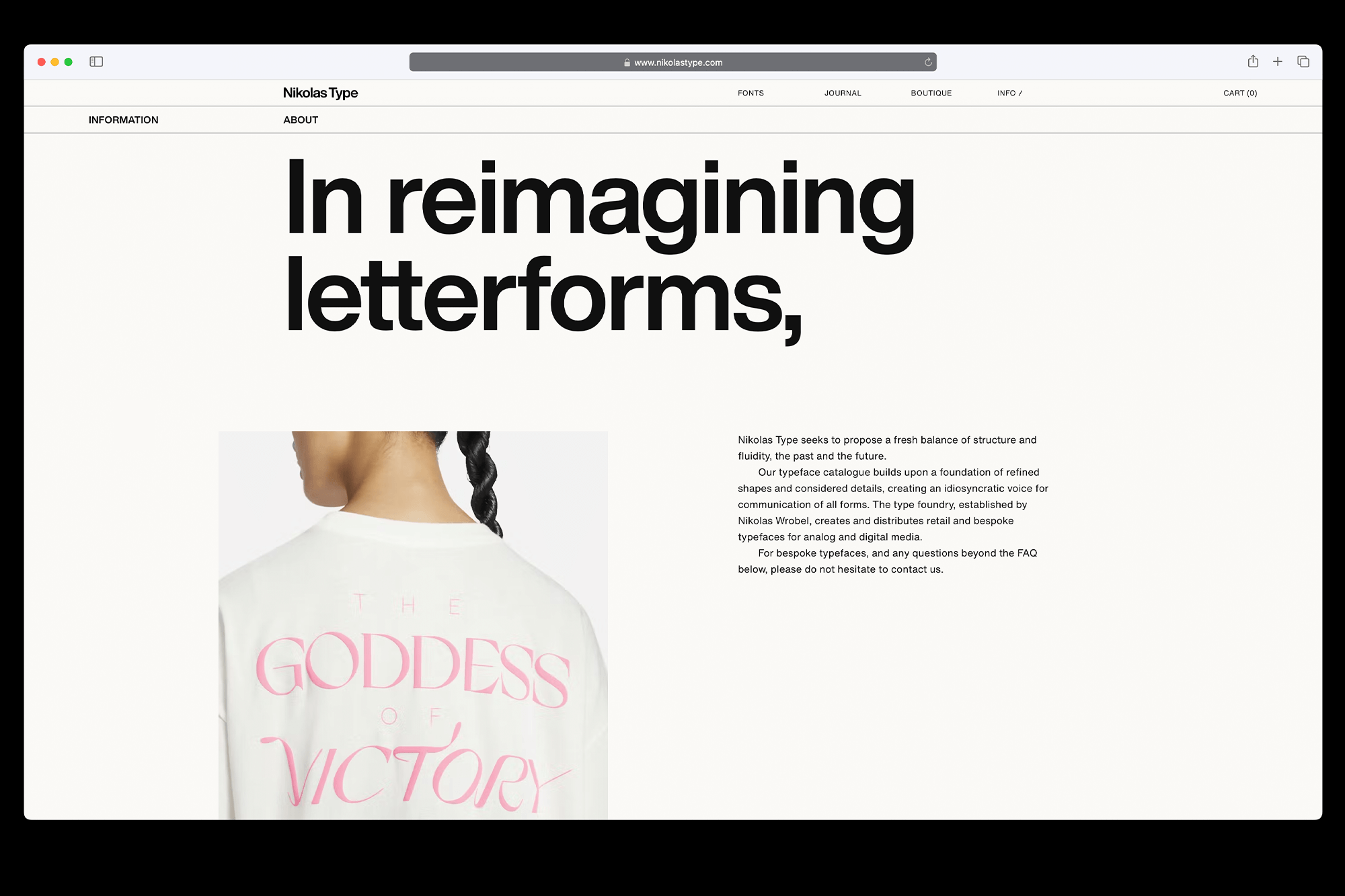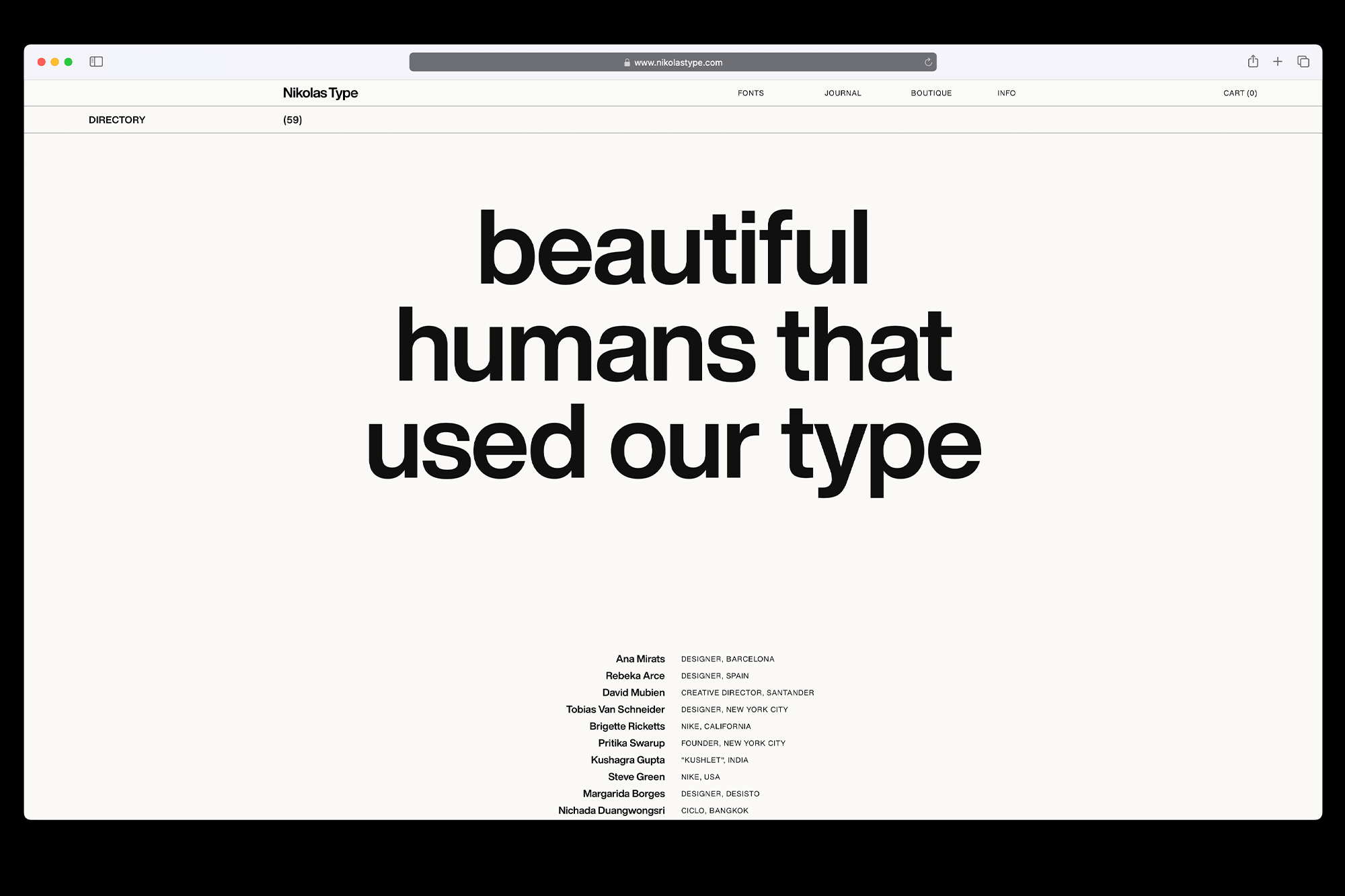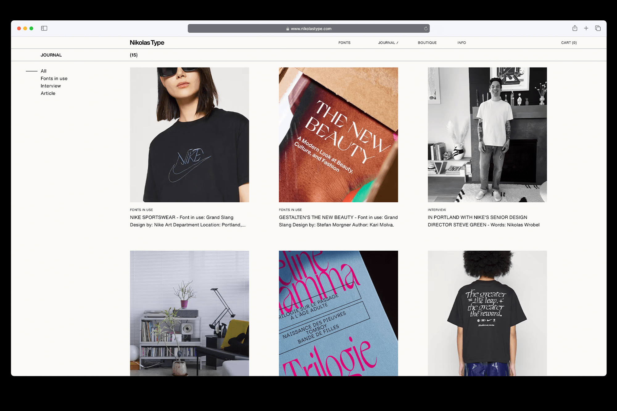 The blog section, called Journal, offers a curated collection of content, including examples of typefaces in use, articles, interviews with creators, and more. Limited-edition foundry merchandise is offered in the Boutique; the Directory section showcases clients / uses of Nikolas Type typefaces.