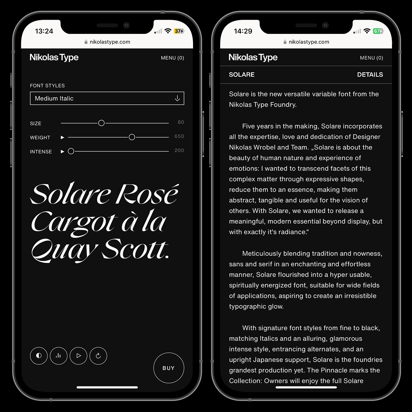 The website primarily uses Helvetica Now (Regular, Medium and Bold) while the recently released Solare appears in blog articles for titles and quotations. The website design embraces minimalism, featuring deliberate contrasts in font weights and a monochrome color scheme. Typography is central to the layout, ensuring an intuitive browsing experience.