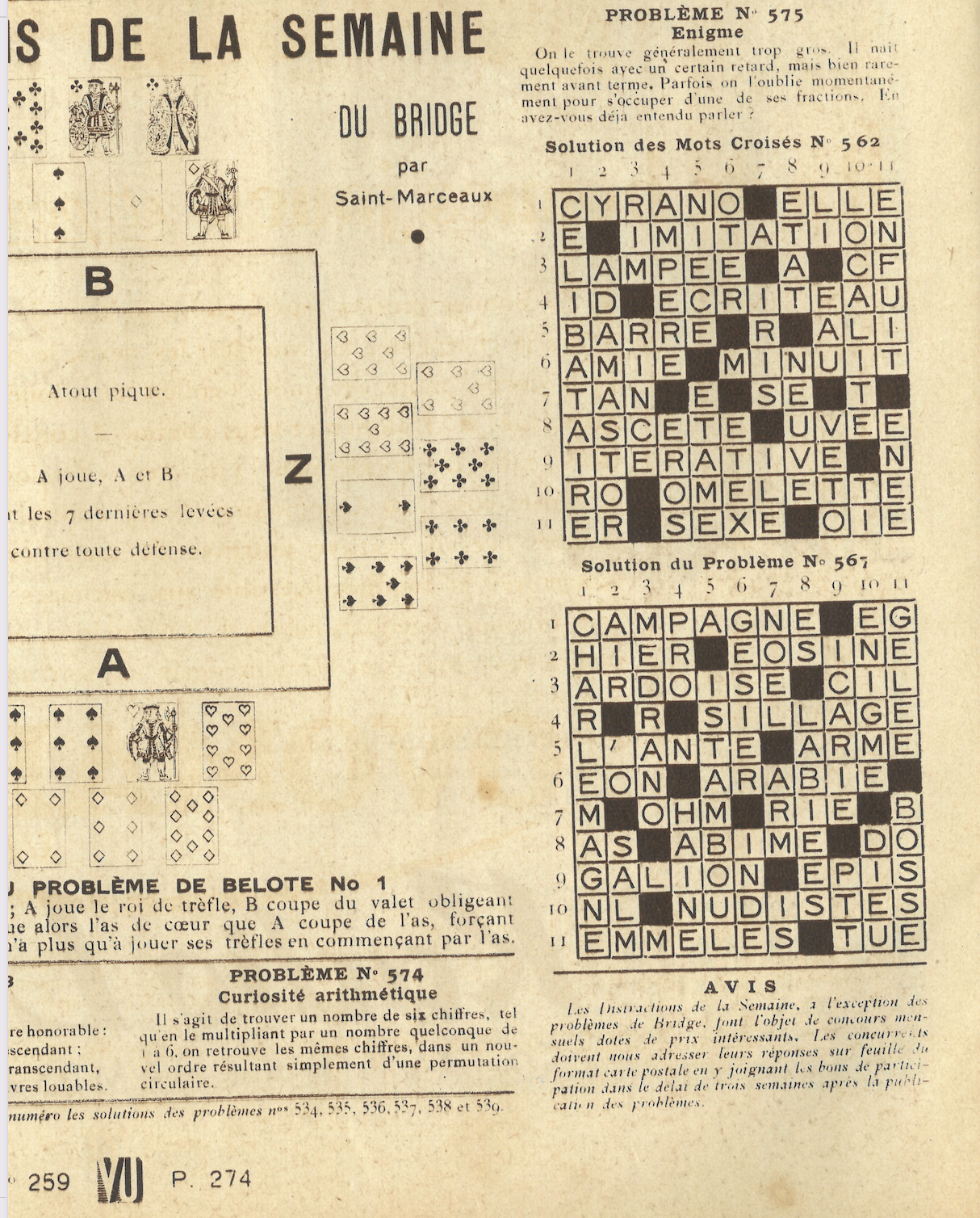 The other fonts in use for “Les distractions de la semaine” are worth a look, too. While the dancing fat face with the checkered fill used for the title is lettering, the thin caps for “Résultats” in the first image are typographic: they come from the generically named Antique Fine. The puzzles themselves are set in Beaudoire’s Elzevir, which started about 1860 as a commercial copy of Louis Perrin’s Caractères Augustaux. Headings are in the accompanying Elzevir Gras, which has more in common with Alexander Phemister’s Old Style Antique No. 7.