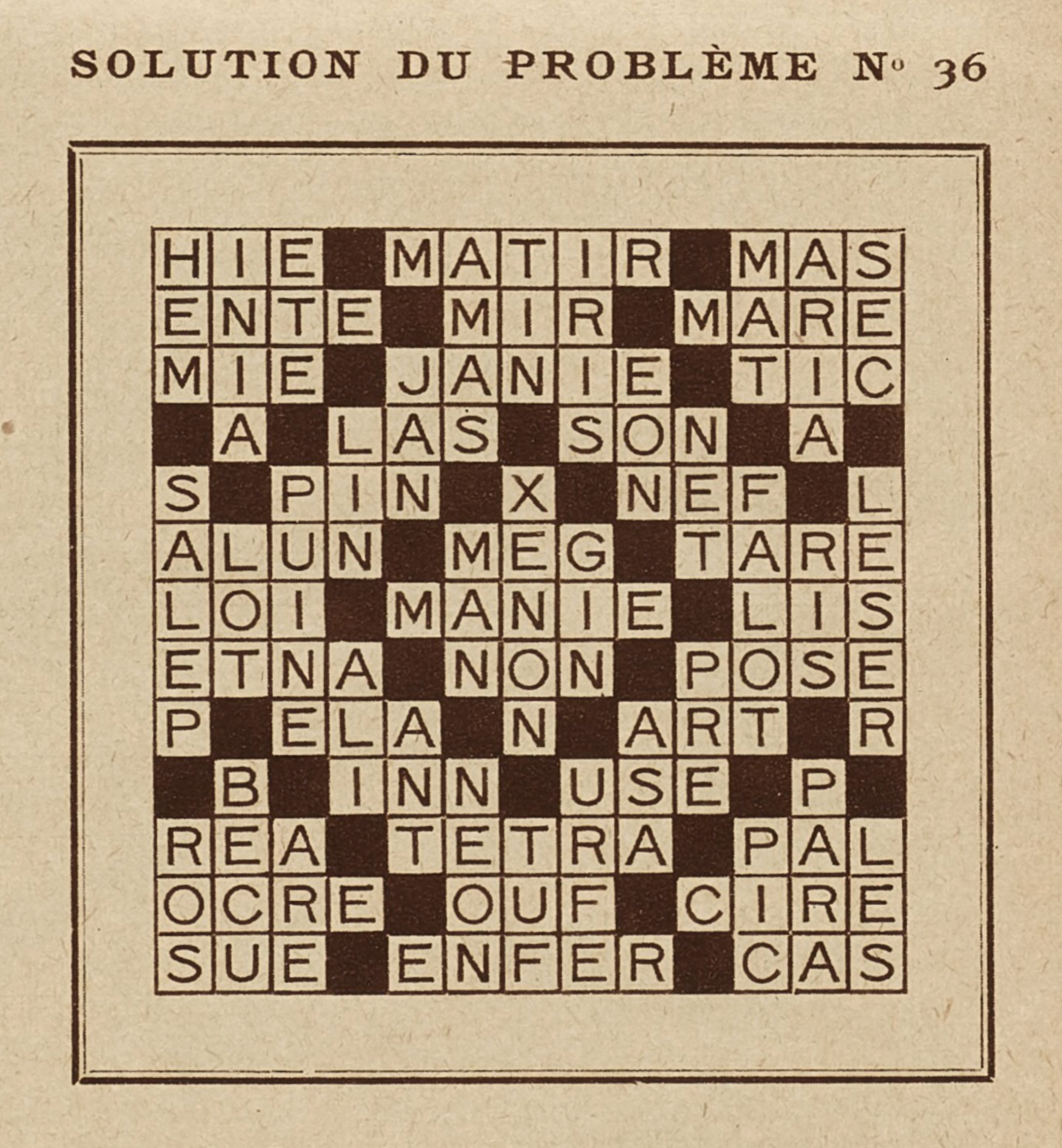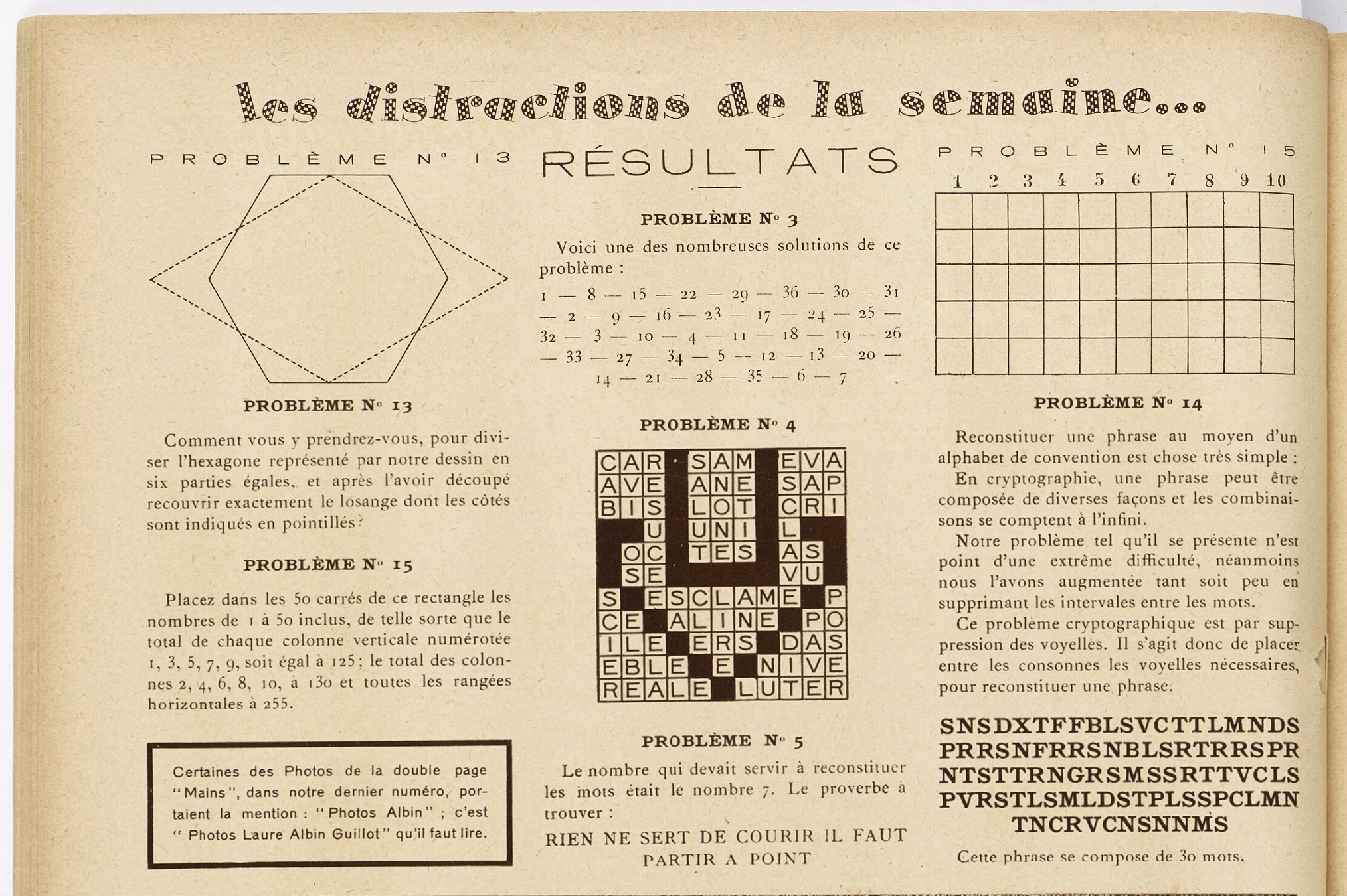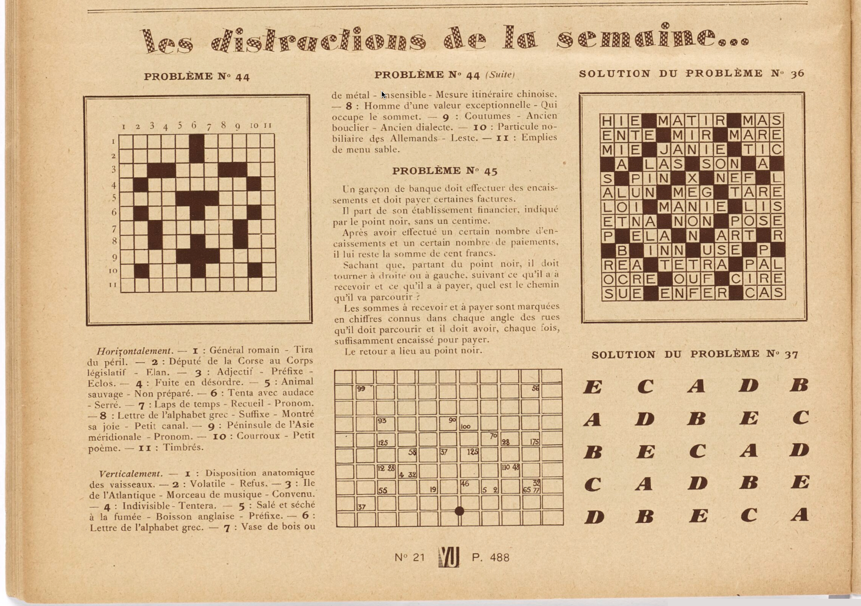 From the very start, it included a section titled “Les distractions de la semaine” (“The week’s distractions”) with various puzzles, or problèmes. Initially, the crosswords came with handwritten numbers, see this example from issue 5. In the sixth issue from April 25, 1928, Vu introduced solutions for the crosswords. These no longer used lettering. Instead, they were composed from a special font. Simply named Mots Croisés (French for “crosswords”), it offered blank and black squares as well as such with capital letters for clues and solutions, internal and external numbers, and border elements. Mots Croisés is shown in Deberny & Peignot’s Spécimen Générale from around 1936.
