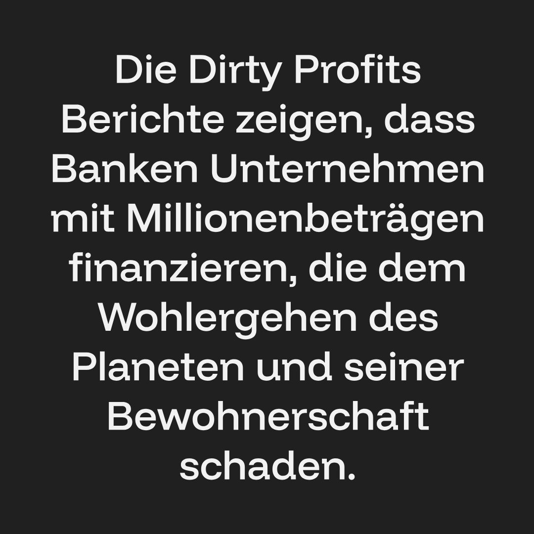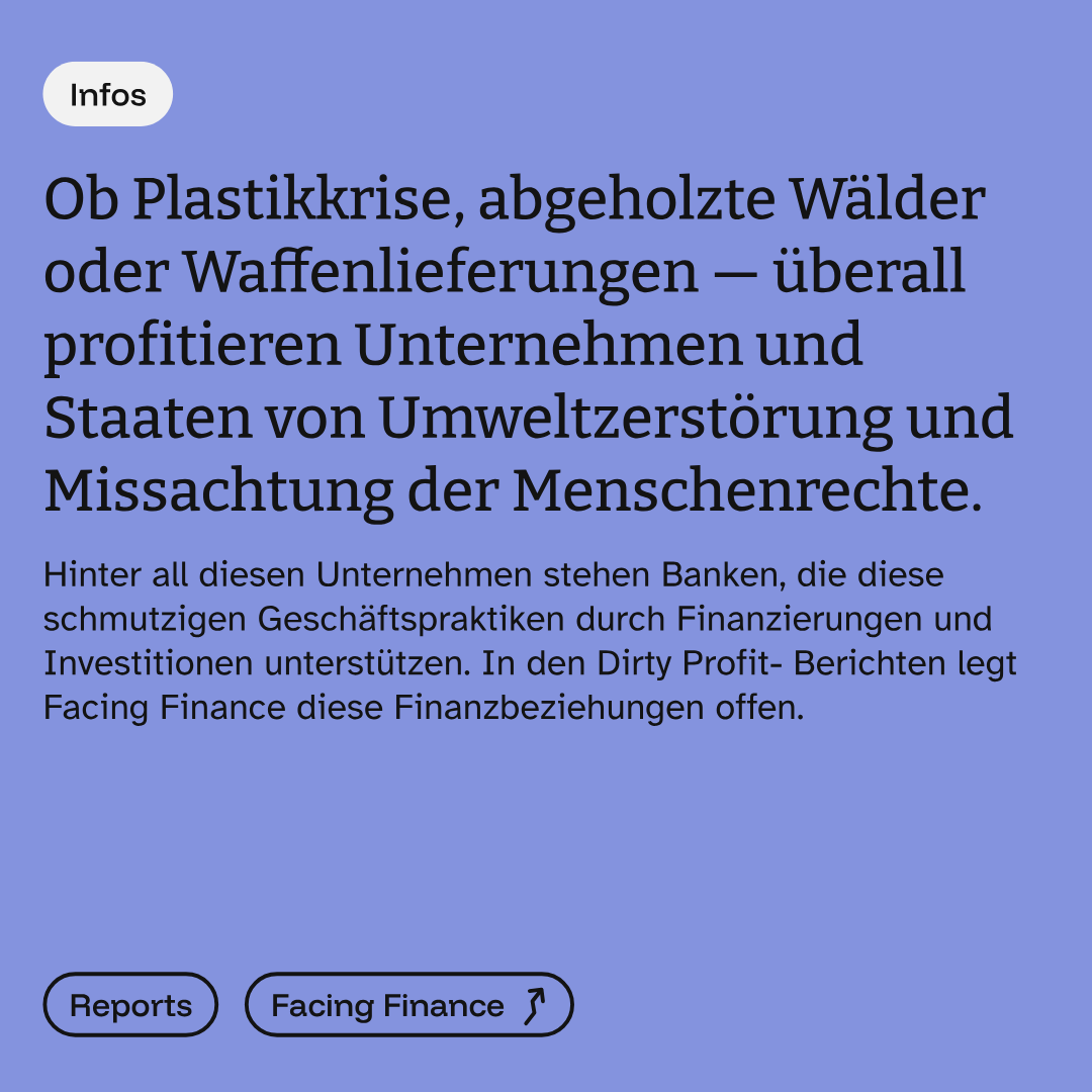 Whether it’s the plastic crisis, deforestation or arms shipments – companies and states everywhere are profiting from environmental destruction and disregard for human rights. Behind all these companies are banks that support these dirty business practices through financing and investments. In the Dirty Profits reports, Facing Finance exposes these financial relationships. The Dirty Profits reports show that banks finance companies with millions of dollars that harm the well-being of the planet and its inhabitants.