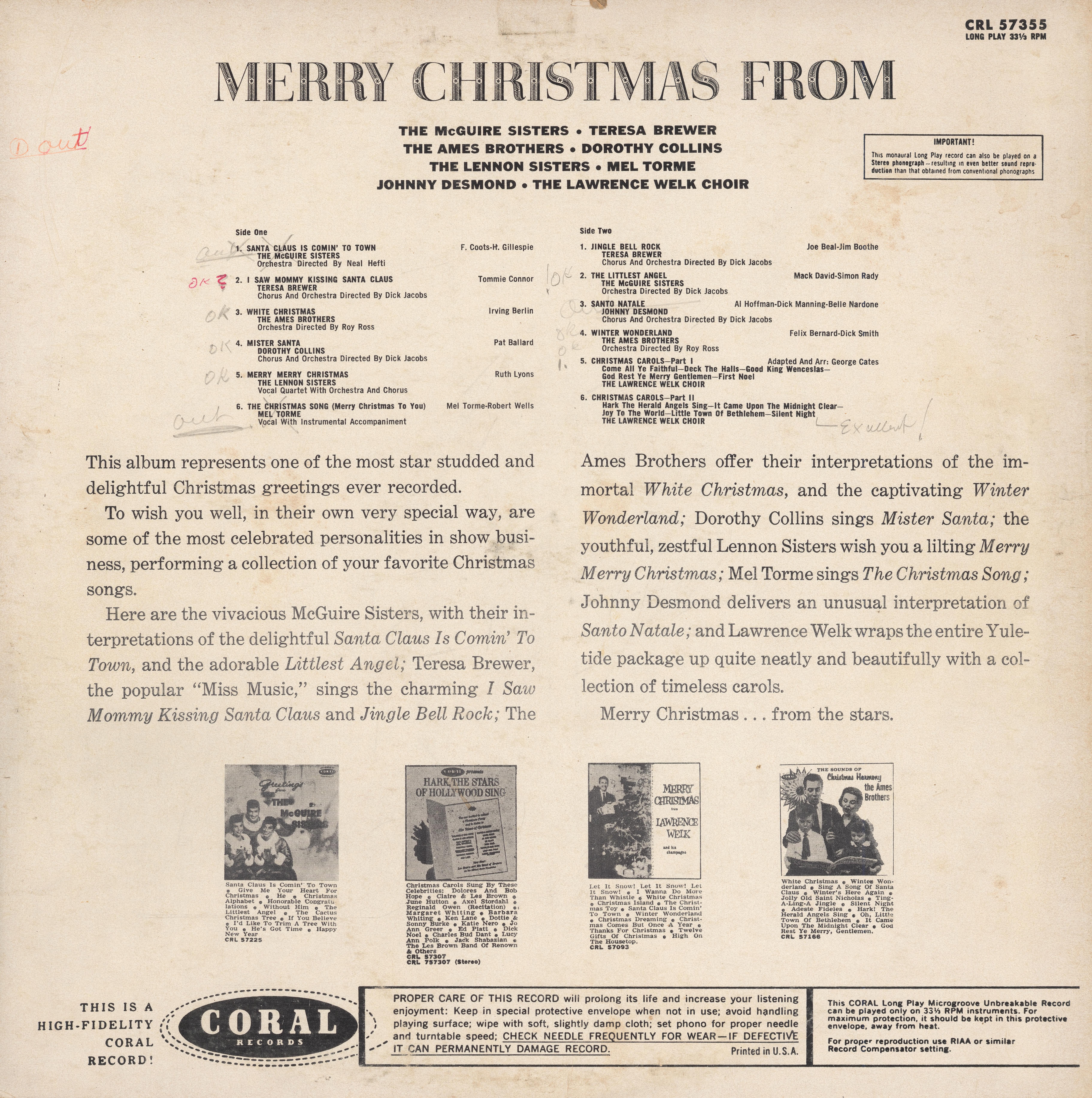 Here are the vivacious McGuire Sisters, with their interpretations of the delightful Santa Claus Is Comin’ To Town, and the adorable Littlest Angel; Teresa Brewer, the popular “Miss Music,” sings the charming I Saw Mommy Kissing Santa Claus and Jingle Bell Rock; The Ames Brothers offer their interpretations of the immortal White Christmas, and the captivating Winter Wonderland; Dorothy Collins sings Mister Santa; the youthful, zestful Lennon Sisters wish you a lilting Merry Merry Christmas; Mel Torme sings The Christmas Song; Johnny Desmond delivers an unusual interpretation of Santo Natale; and Lawrence Welk wraps the entire Yuletide package up quite neatly and beautifully with a collection of timeless carols.