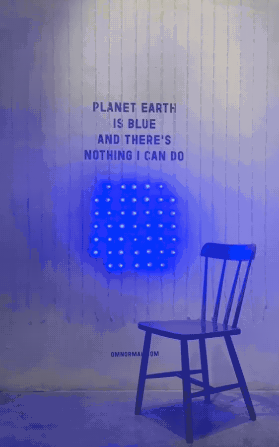 This art piece reflects on humanity’s capacity for change, juxtaposing the cyclical motion of a blue bouncing ball with the cunning lyrics of David Bowie’s “Space Oddity”. The LED curtains symbolizes the intersection of technology and existential thought, questioning whether or not our actions are genuine, while also allowing us to attempt to transform our patterns. Through its minimalist yet evocative design, the work invites viewers to ponder the fragility of our planet and the limits of human agency in shaping its future. And there is an empty chair in front, adding the narrator’s dimension.