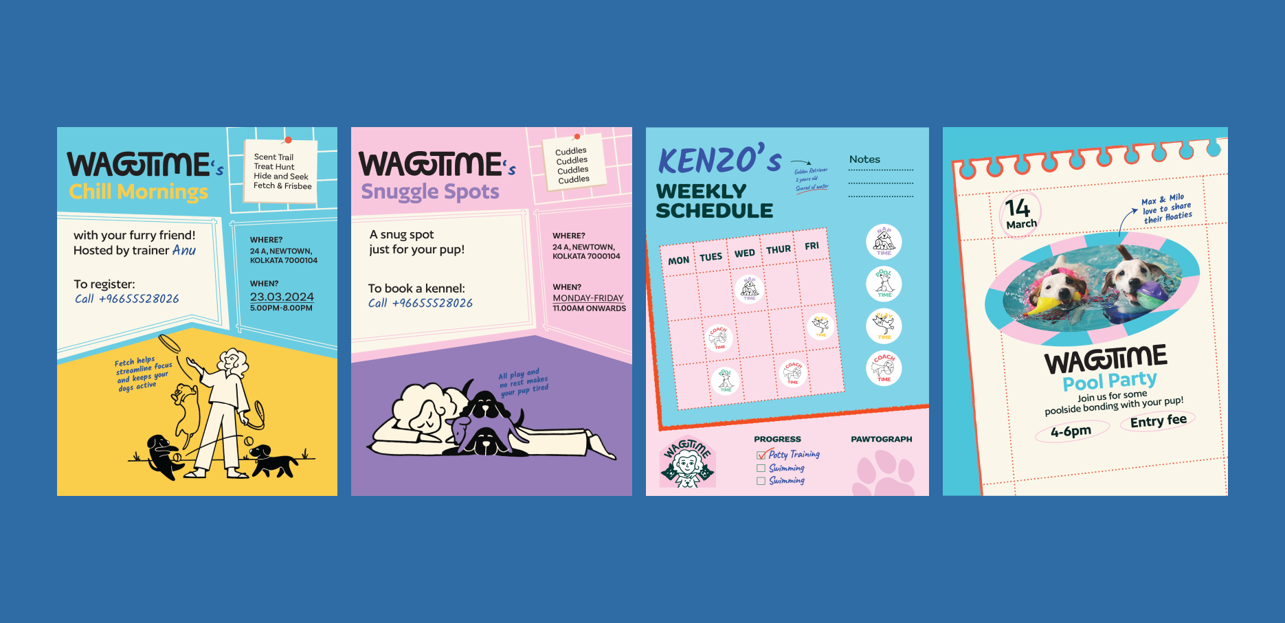 A first-of-its-kind haven open to every pup in the city, Anu, the founder formed the core of Wagtime. That is why we kept her front and centre, letting pet parents know that their pups are in good hands. The world of pets is playful, cute, and fun – all of which we leaned into when we came on board as design partners for Wagtime. The project spanned across identity, space graphics, illustration, print posters, and an extensive branding system.