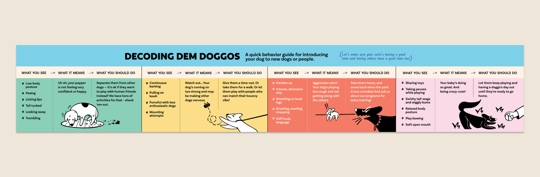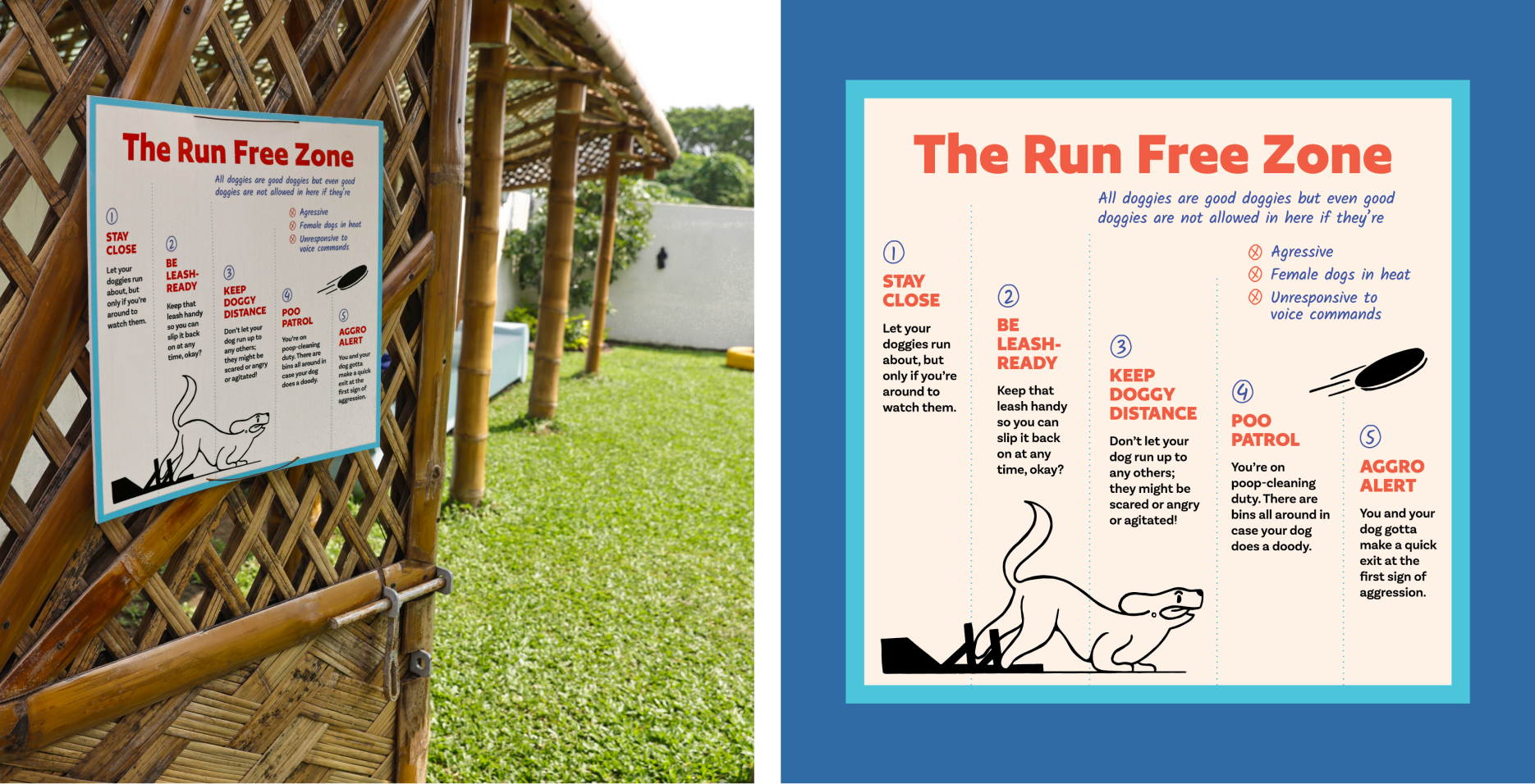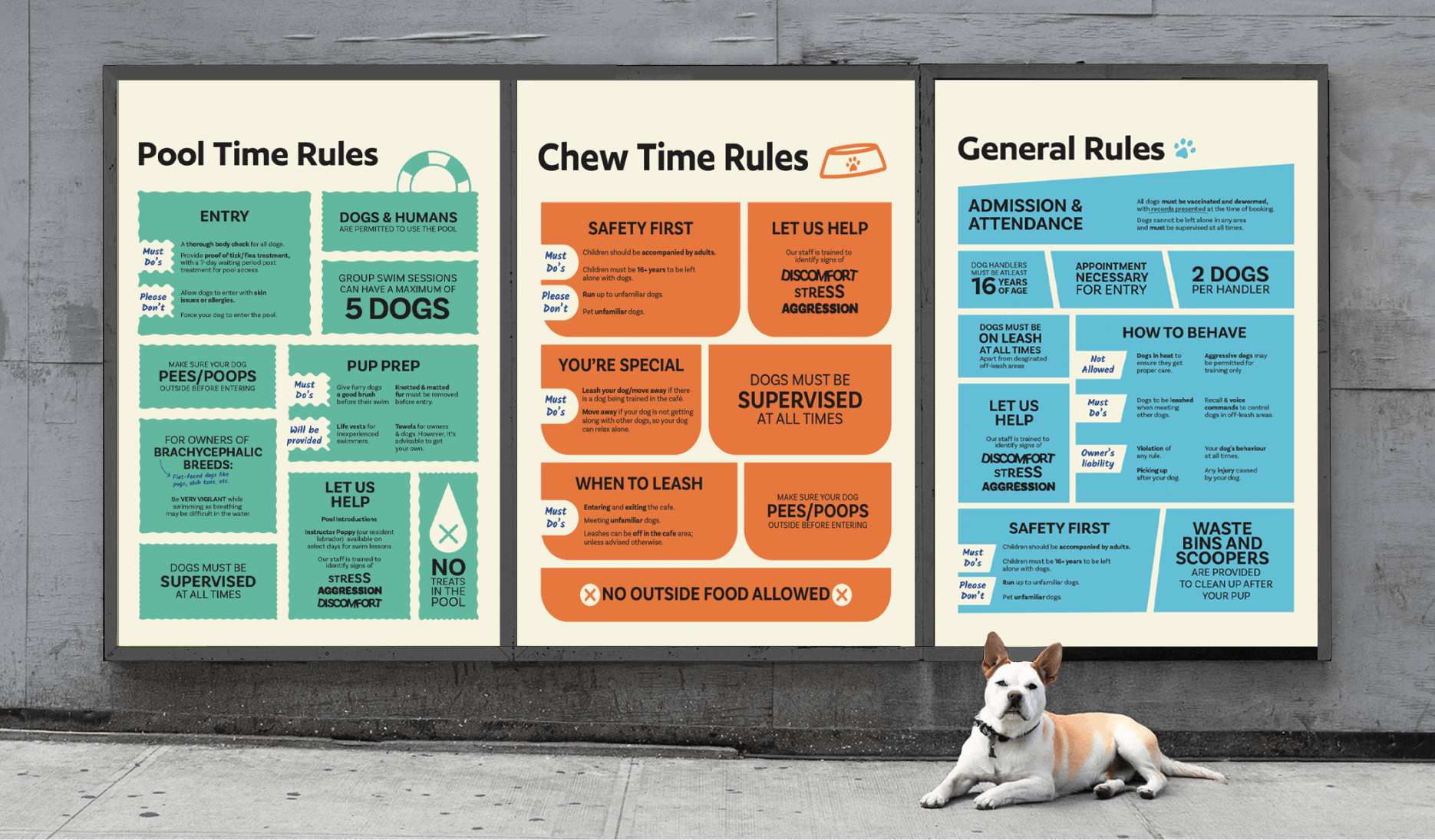 We decided to make Anu and her dogs (quite literally) the face of the brand. With each space dedicated to different activities, a naming system with the word time was assigned to each area (playtime/naptime/coachtime). Anu’s voice in the form of a handwriting font was incorporated throughout the brand as small notes, much like a coach’s pointers, also informing clients of the ‘whys’ of what they were doing.