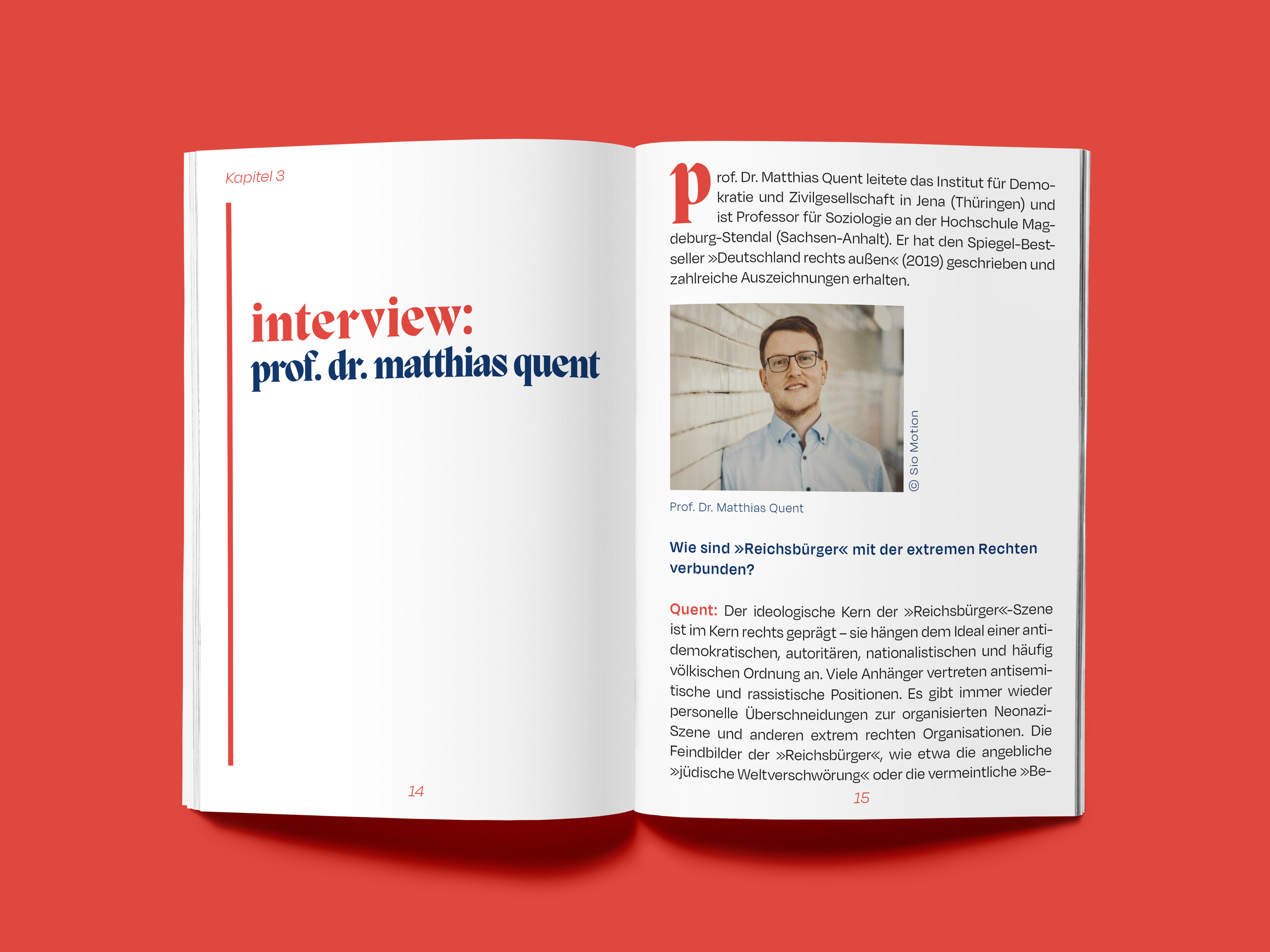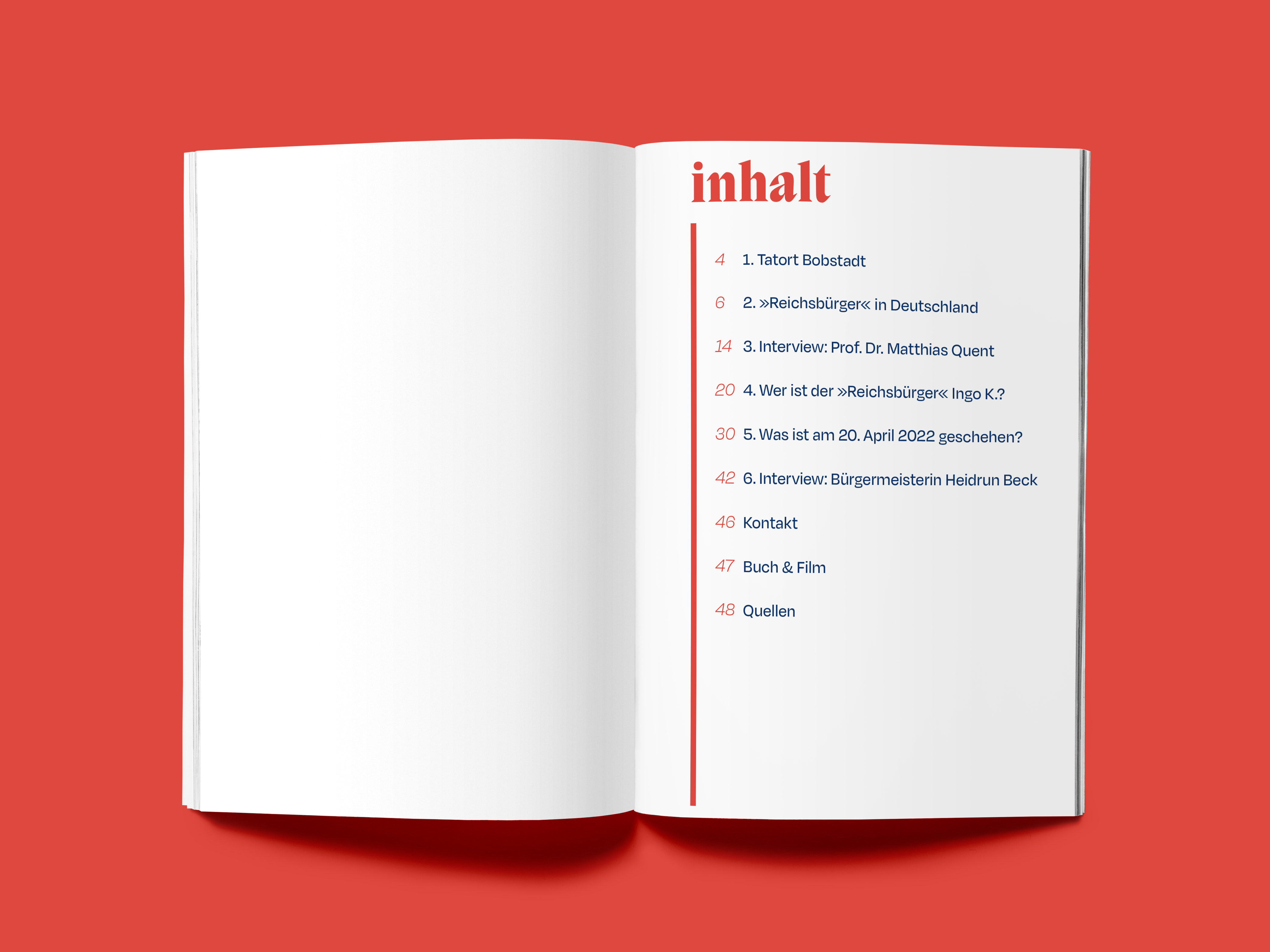 The brochure provides information about “Reichsbürger” in Germany and presents what has become known about the crime and its background during the trial against Ingo K.. Mayor Heidrun Beck and Prof. Dr. Matthias Quent, who has been researching “Reichsbürger” and neo-Nazis in Germany for years, have their say in the brochure.