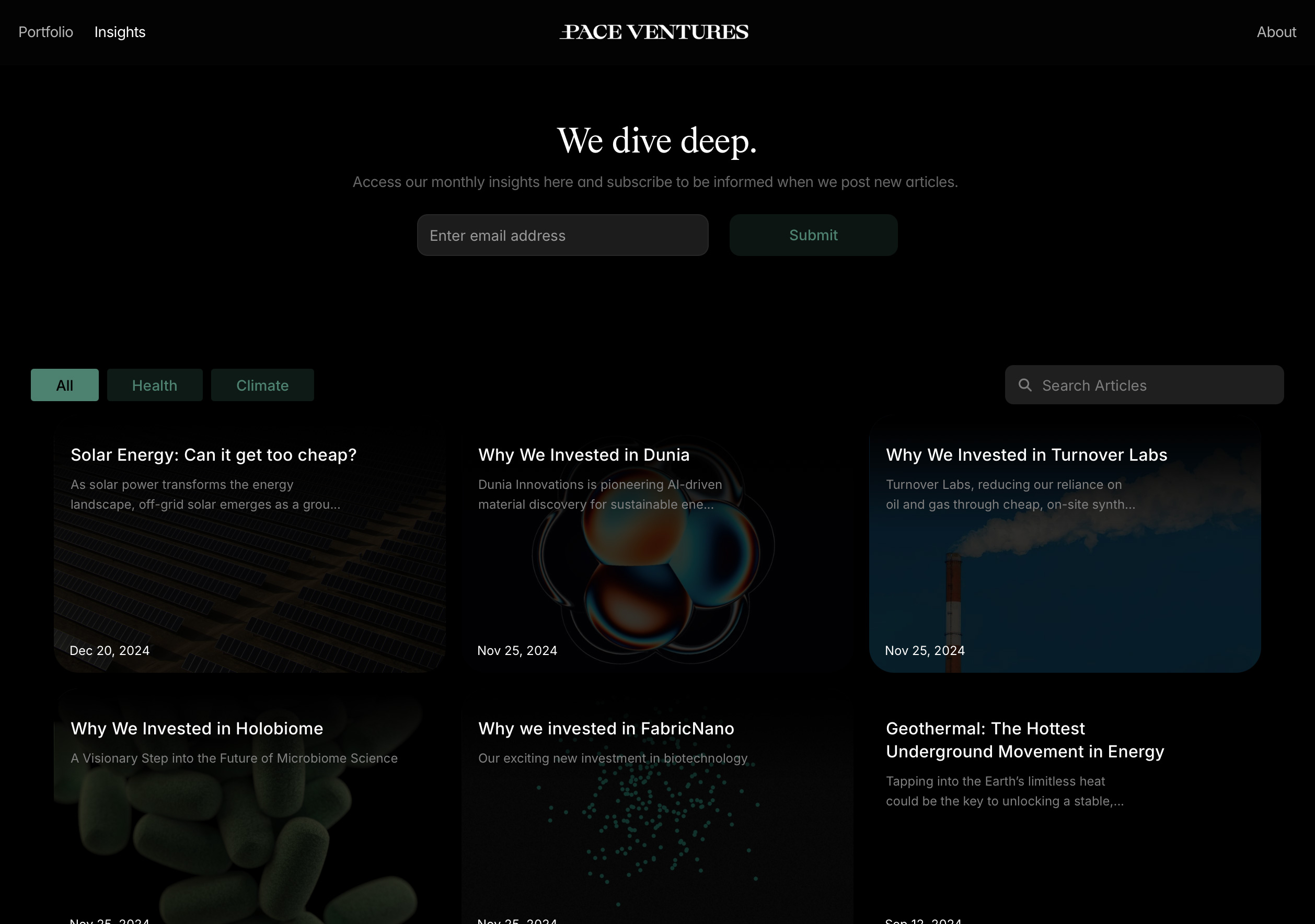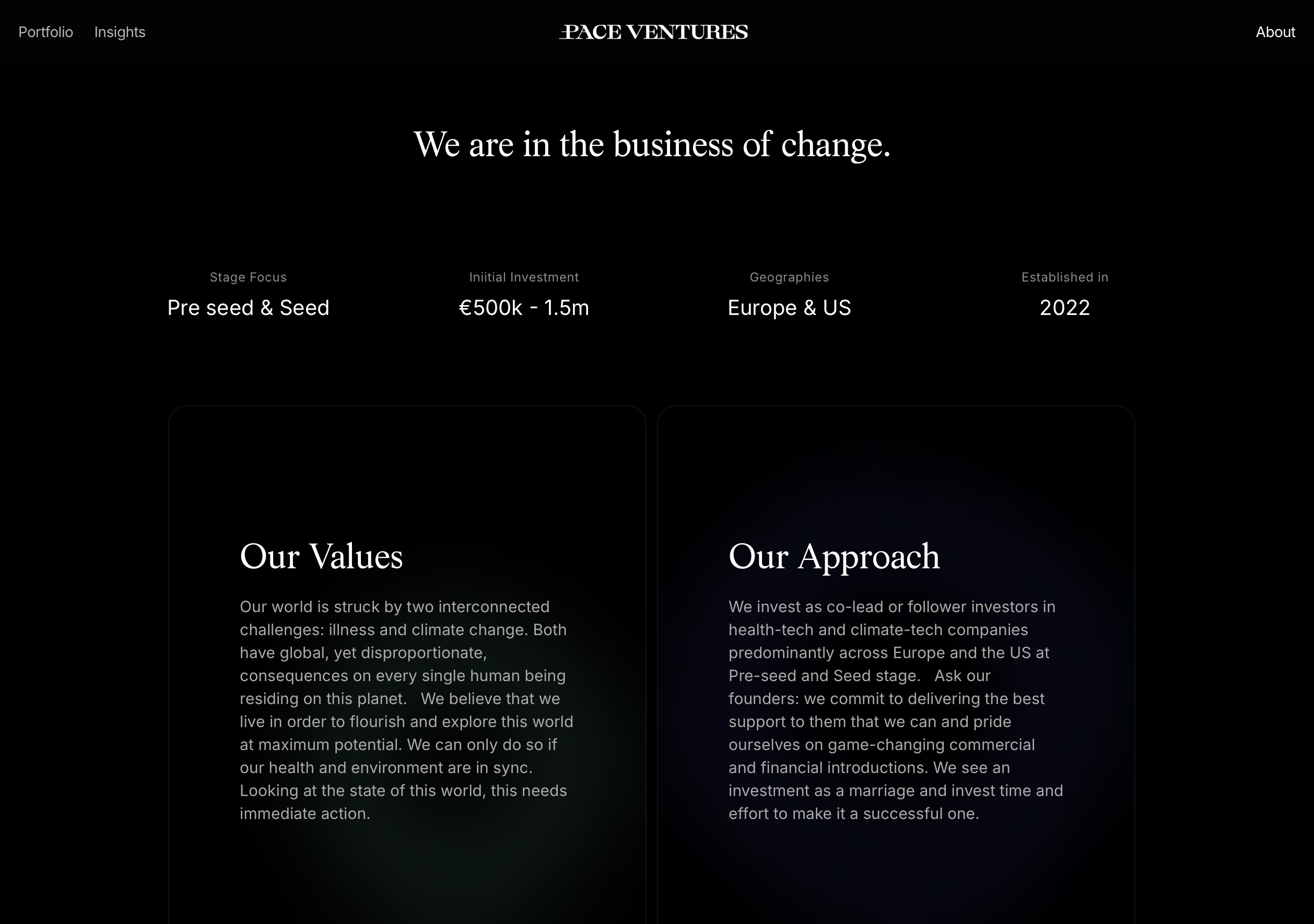 Pace Ventures website Contributed by Store Norske Skriftkompani on Jan 9th, 2025. Artwork published in 2024. Source: paceventures.com License: All Rights Reserved. Berlin based investment company Pace Ventures have updated their website. The typefaces used are Inter from Rasmus Andersson and Store Norske Leif from Skriftkompani. Source: paceventures.com License: All Rights Reserved. Source: paceventures.com License: All Rights Reserved. Source: paceventures.com License: All Rights Reserved. Source: paceventures.com License: All Rights Reserved. Typefaces More about Store Norske LeifGet Store Norske LeifMore about InterGet Inter Formats Web (5714) Topics Business/Finance (781) Designers/Agencies unknown (4270) Tagged withinvestments (33)finance (122)economics (35)websites (3653)black (49)spheres/globes (78)sustainability (270)portfolios (779) Artwork location Germany (3923) Berlin (1166) Post a comment Name Email – will not be published Website Your response Submit Comment More Store Norske Leif in use Libertas website2025LibertasContributed by Store Norske Skriftkompani Arkanum Pictures website2024d-a-m-kContributed by Store Norske Skriftkompani Historien om den norske løve by Knut Johannessen2025Halvor BodinContributed by Store Norske Skriftkompani Sponsor More in Business/Finance Era of the Solopreneur2025HyperPensionGolden Bell TempleContributed by Hyper Pension Access2023Max Hofert DesignFRNDSContributed by Max Hofert Bloomberg Businessweek, Feb. 8–14, 2016 “Girl Talk”2016Tracy MaContributed by Love Lagerkvist Norme e Tributi Mese2015BunkerContributed by CAST More in Web Fusion Arena2018Studio UpdottContributed by Daniel Sabino Sebastian Q2012Contributed by Indra Kupferschmid Staff Pick Attido2011BondContributed by Florian Hardwig Staff Pick Ring Ring websitec. 2024Lina ForsgrenContributed by Bloom Type More Fonts In Use “Parents of Earth, Are Your Children Fully Immunized?” public service announcement1979Contributed by Florian Hardwig Staff Pick The Peter Principle (BBC)1973Liz FriedmanContributed by Florian Hardwig Staff Pick Antônio Conselheiro por ele mesmo2017Daniel JustiContributed by Erica Jung Staff Pick La Cascade2015Clémence PassotDorothée CaradecContributed by Benoît Bodhuin Staff Pick