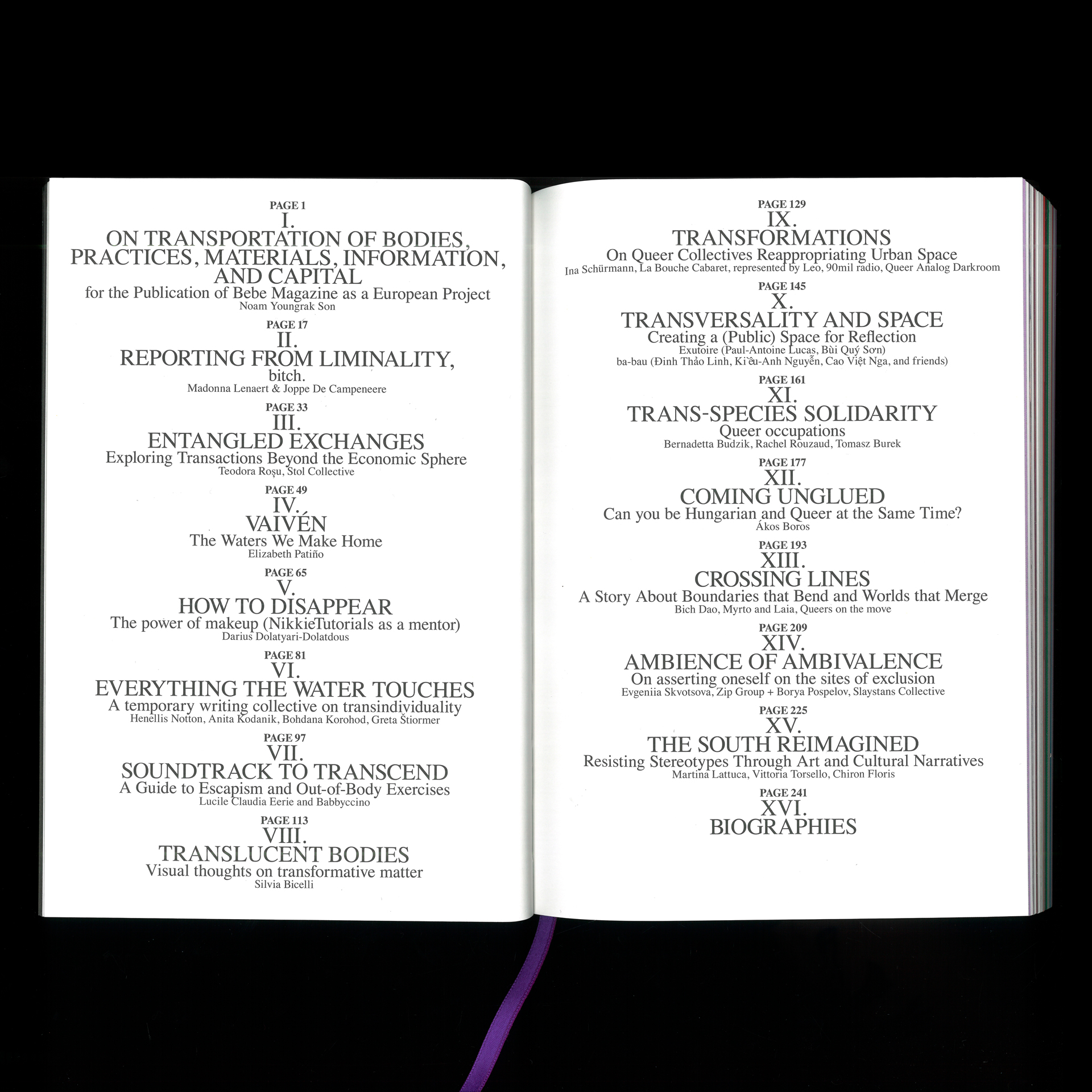 In its very first issue, Bebe Magazine offers a broad constellation of possibilities for queer understandings, beyond identity-based reduction. Using the prefix trans- (across, beyond, through), each of our eight co-curators chose a term and formed mini collectives to destabilise its accompanying pre-established, societally accepted, conceptions—from transversal lines to transactions.