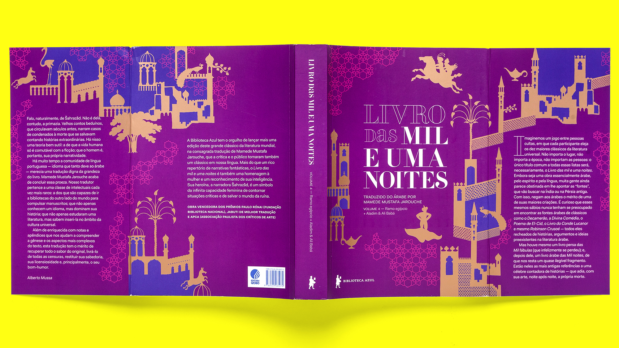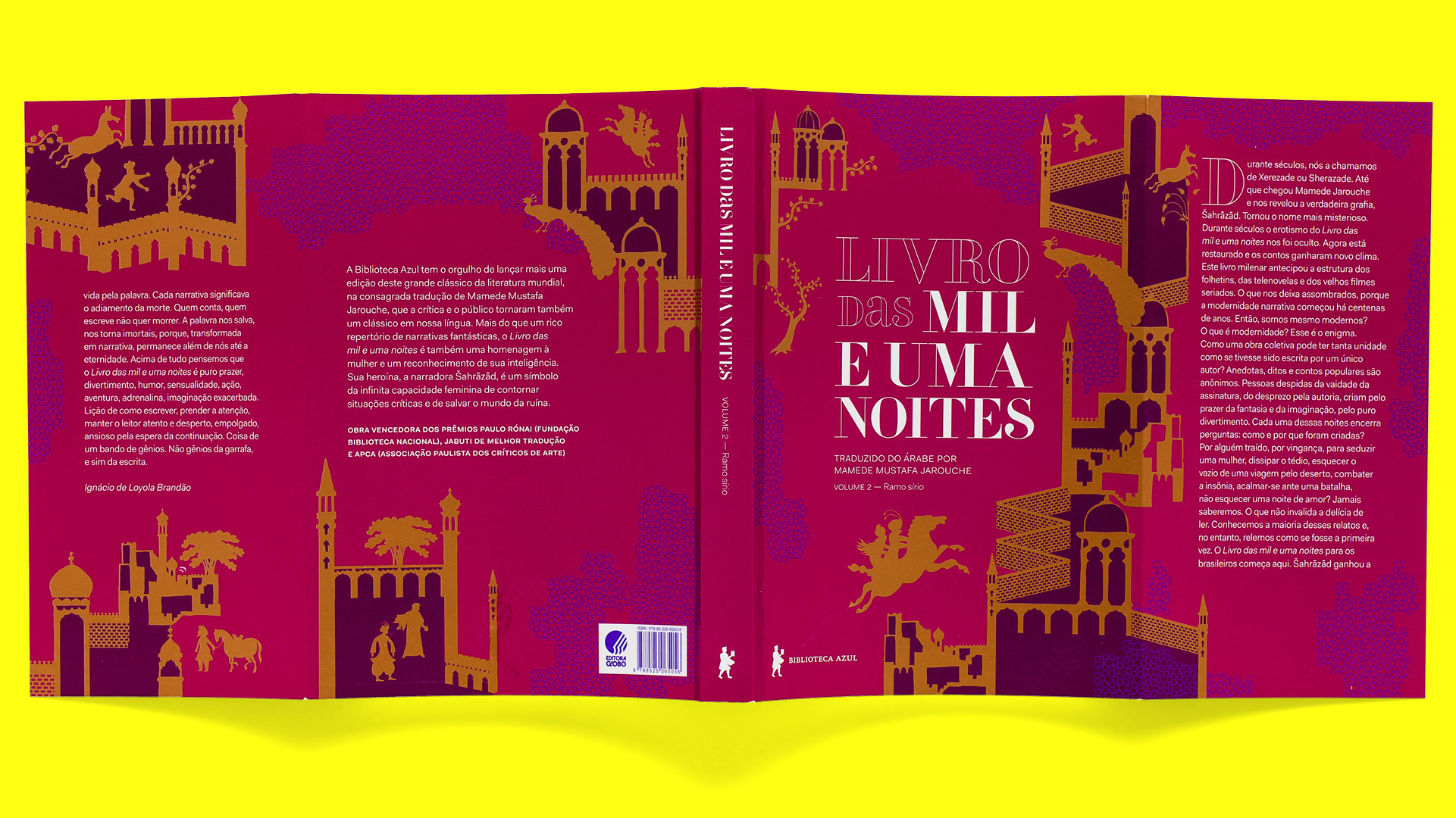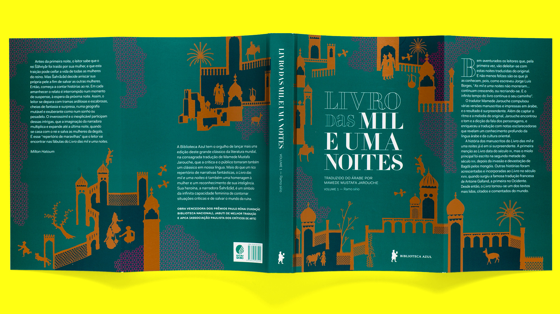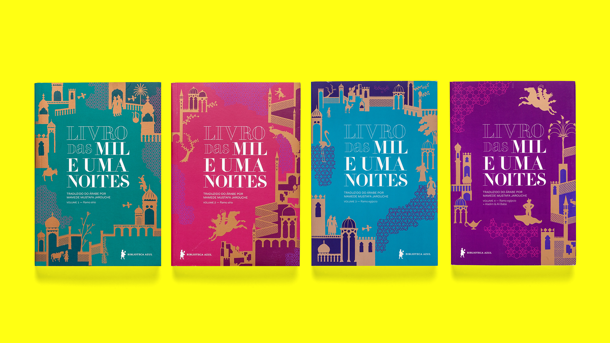Brazilian edition for the Arabian Nights, translated to the Portuguese by Mamede Mustafa Jarouche and published in 2017 in the Biblioteca Azul by Globo Livros. Illustrations by Bruno Algarve. All cover illustrations connect to each other.
