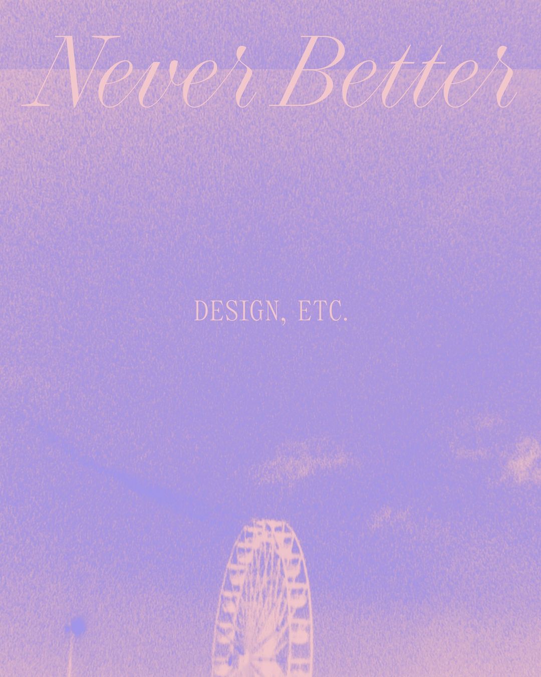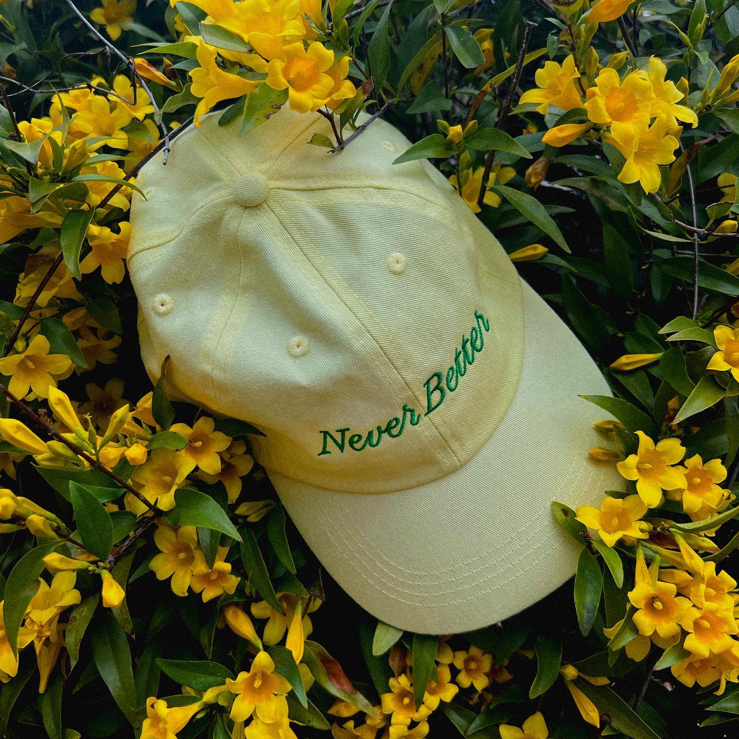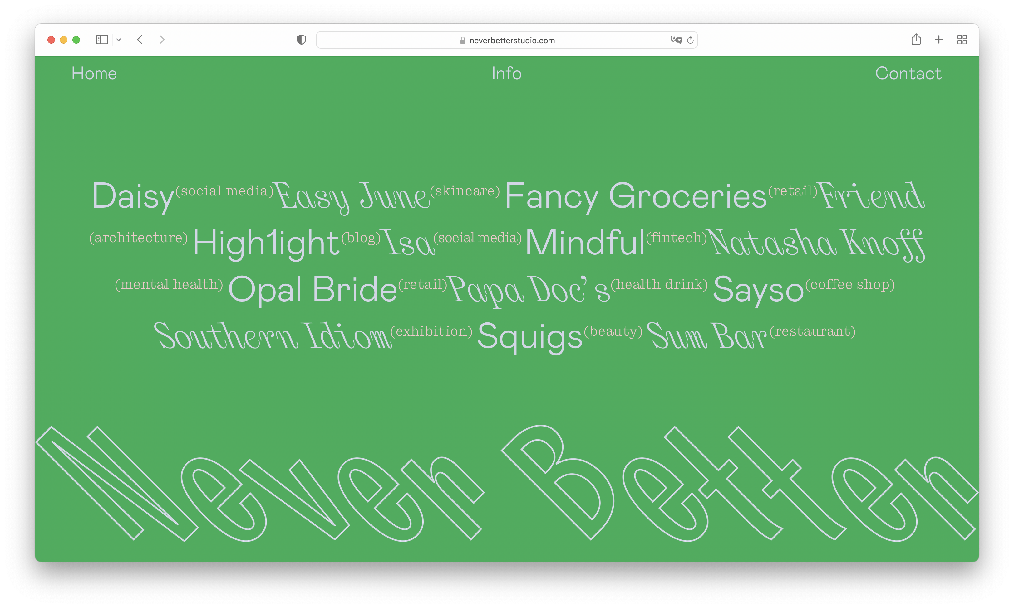 Never Better is a design studio based on the internet. For their own website and identity, they’re using a range of fonts, including Mabry, Panama in upright and Iranic (its left-leaning italic style), Bourrasque 45 Est (another “contra italic”), Cucina and Selva Script. They even made embroidered caps!