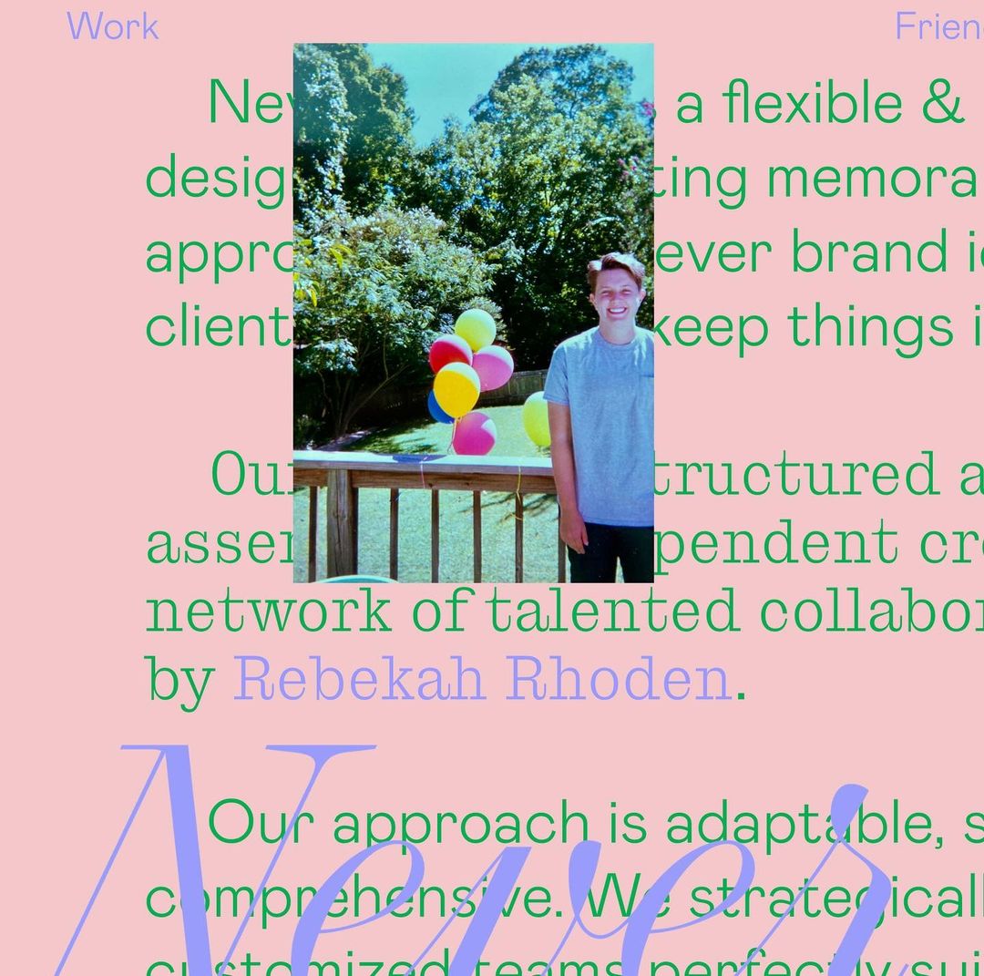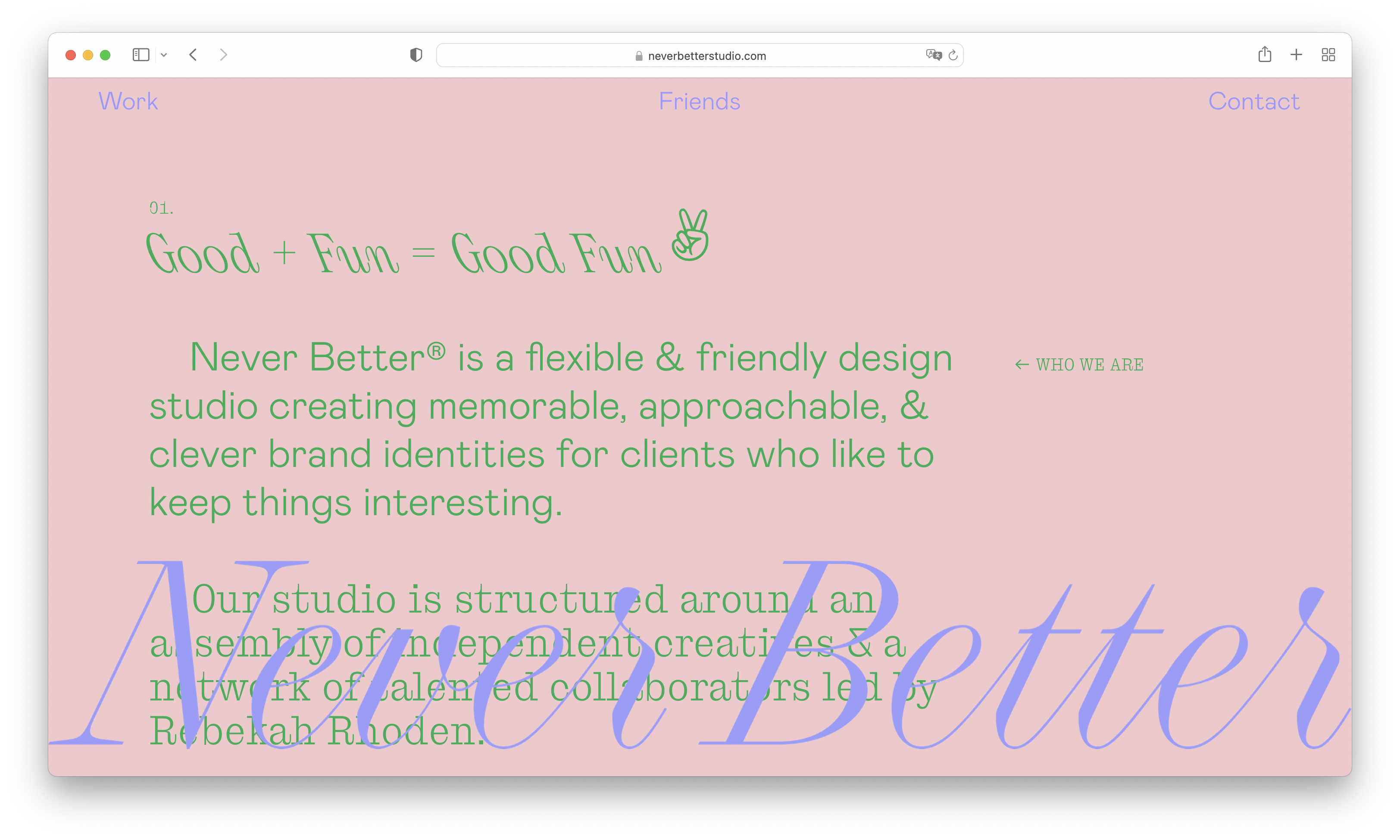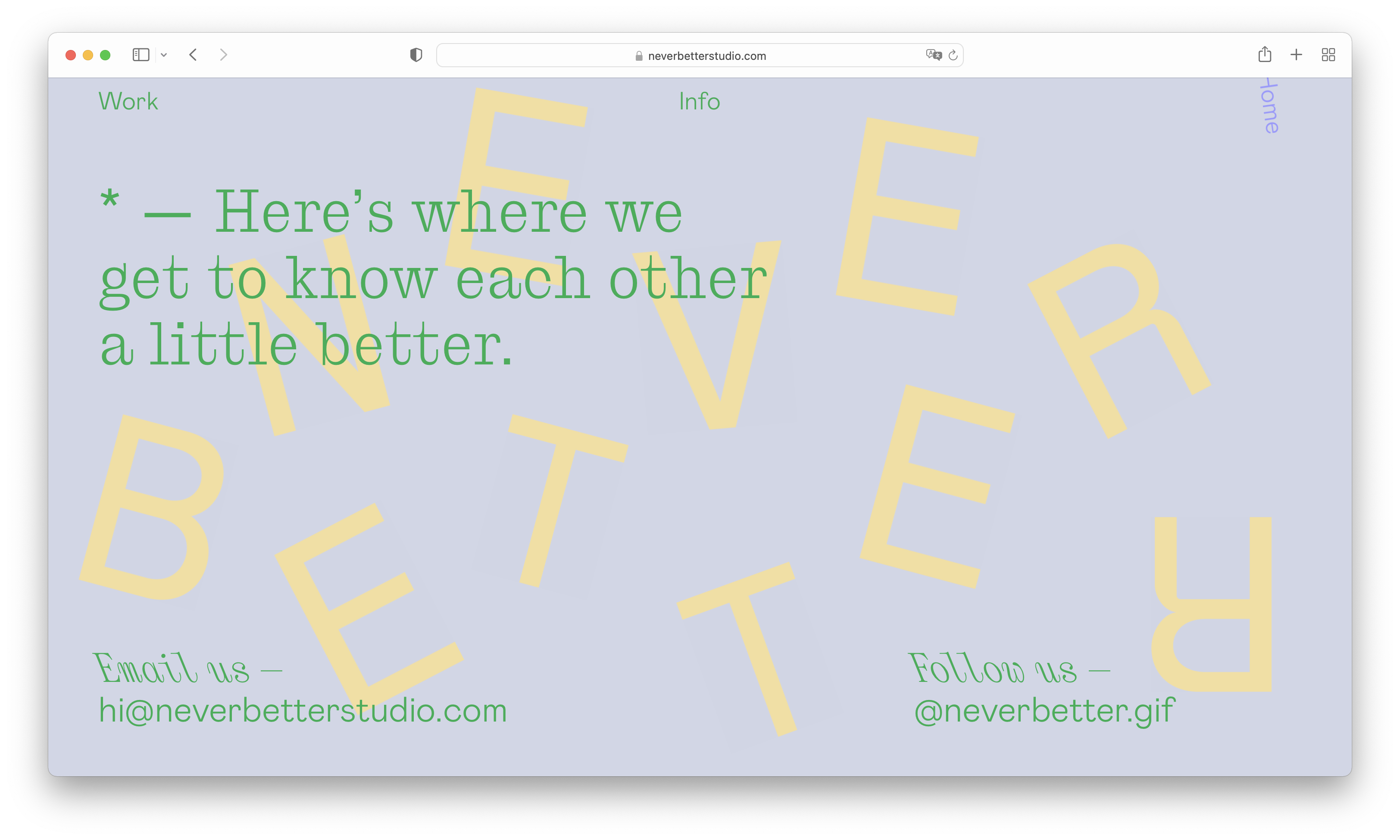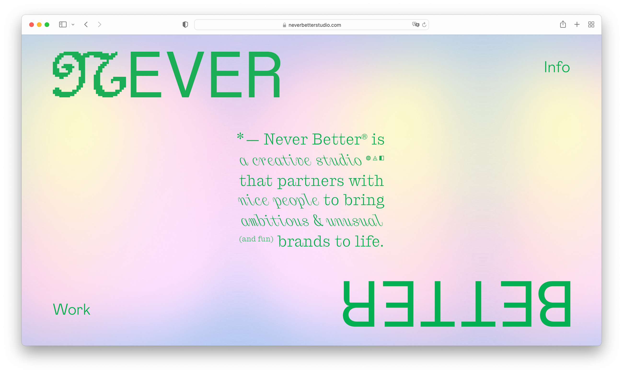 Never Better is a design studio based on the internet. For their own website and identity, they’re using a range of fonts, including Mabry, Panama in upright and Iranic (its left-leaning italic style), Bourrasque 45 Est (another “contra italic”), Cucina and Selva Script. They even made embroidered caps!