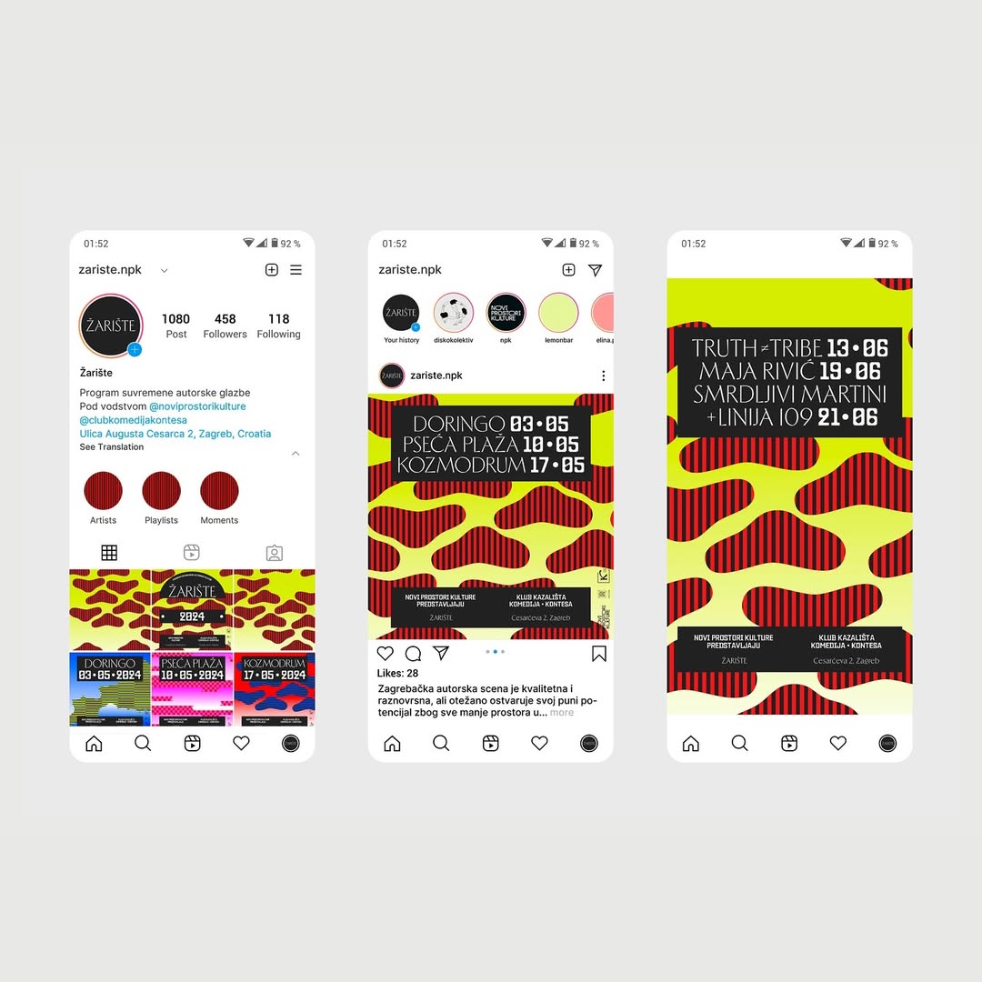 Zagreb’s Žarište is a venue for contemporary live music, comedy, and theater. The visual identity, designed by the DISKO collective, blends cabaret-inspired flair with art deco sophistication to reflect the event’s dynamic energy. Bold typography and geometric patterns take center stage, creating a striking aesthetic that captures the vibrancy of the music event.
