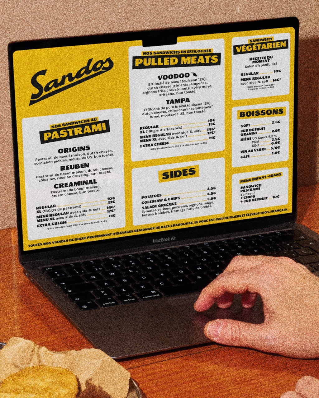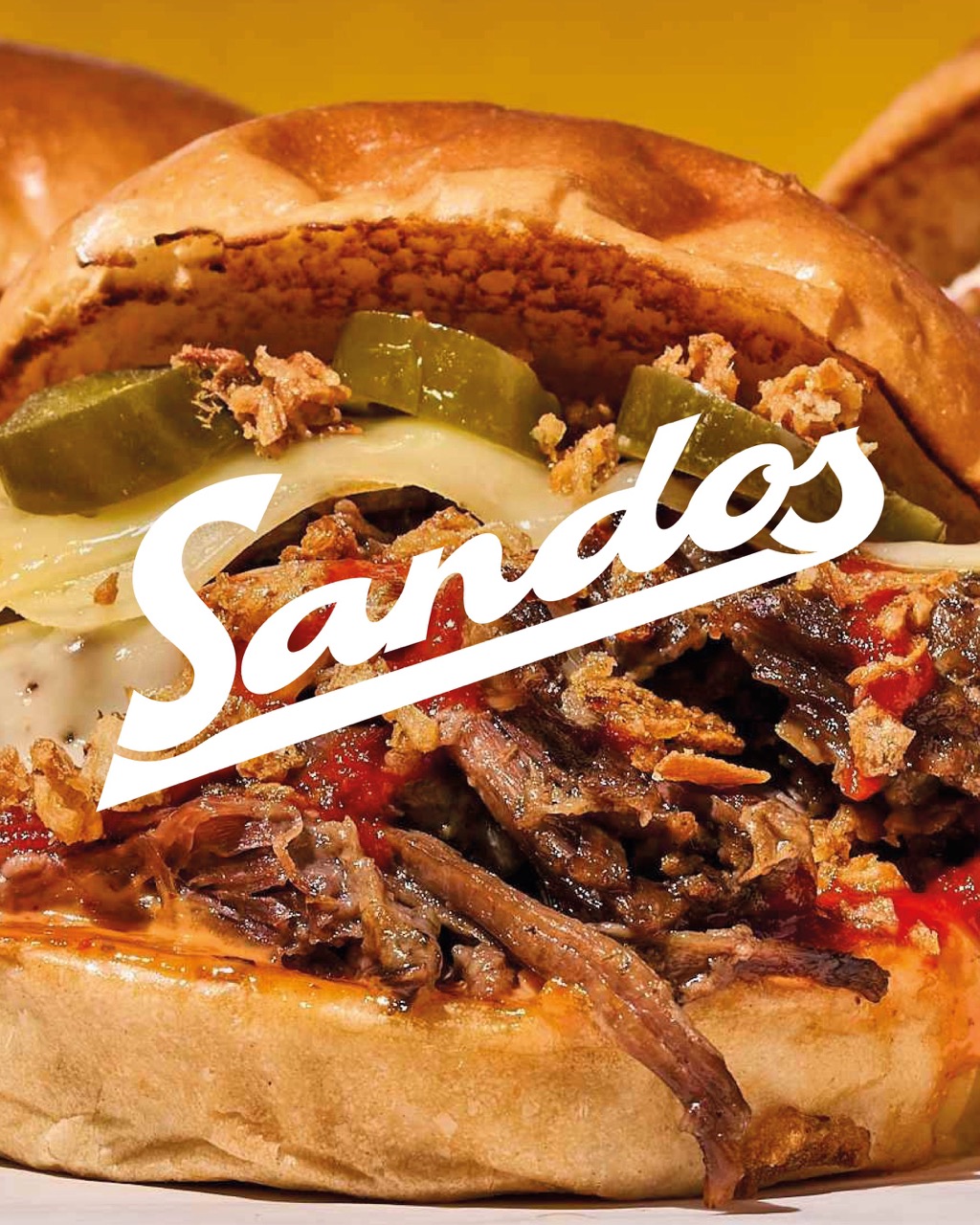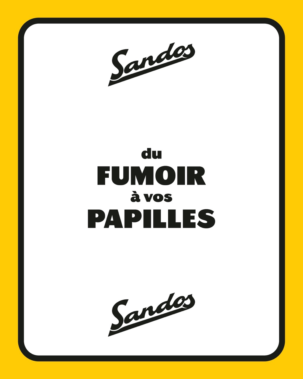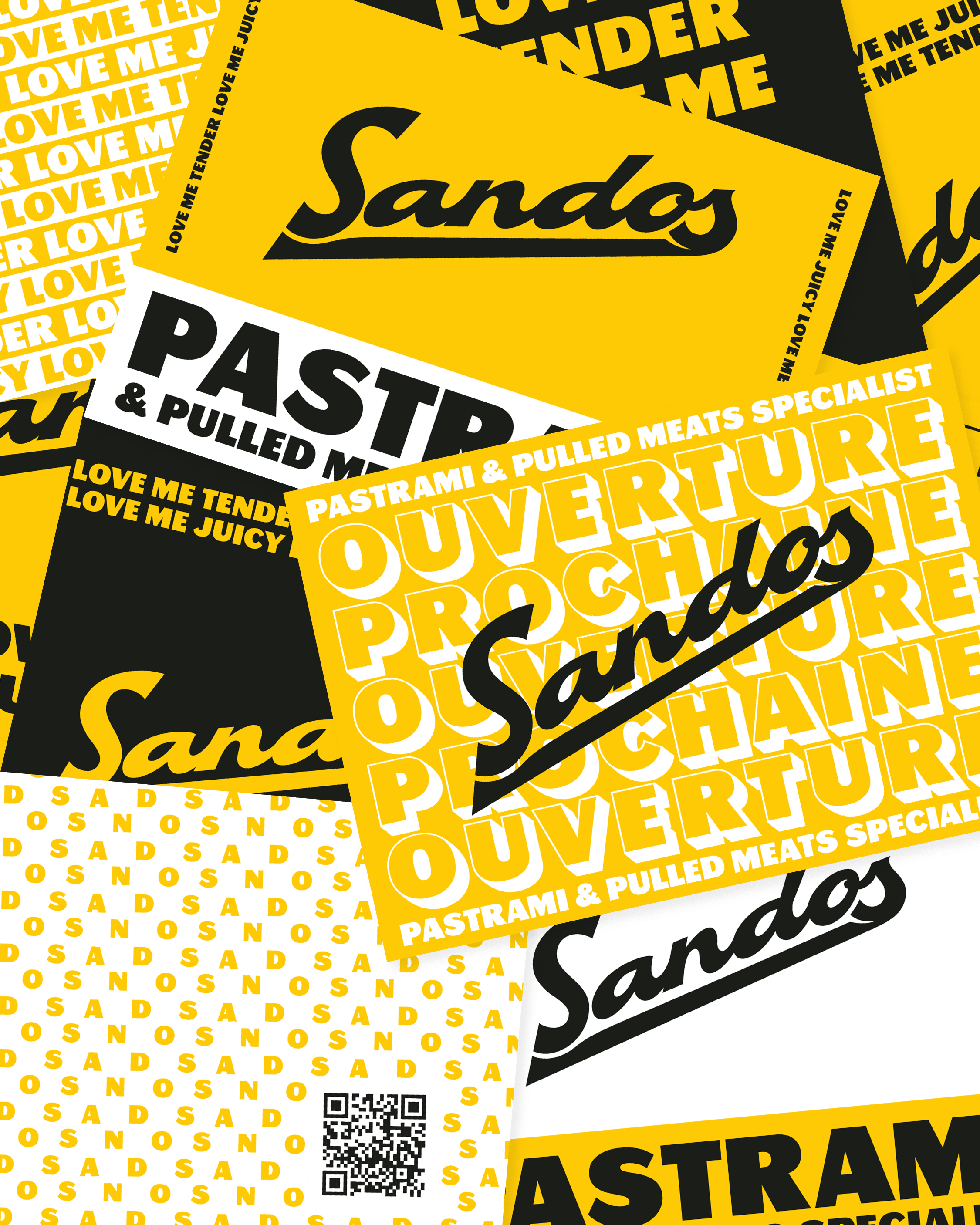 Visual identity for Sandos, Lyon’s best pastrami sandwich dealer. The bold yellow-and-black design features a signature logo inspired by the iconic signage of New York delis.