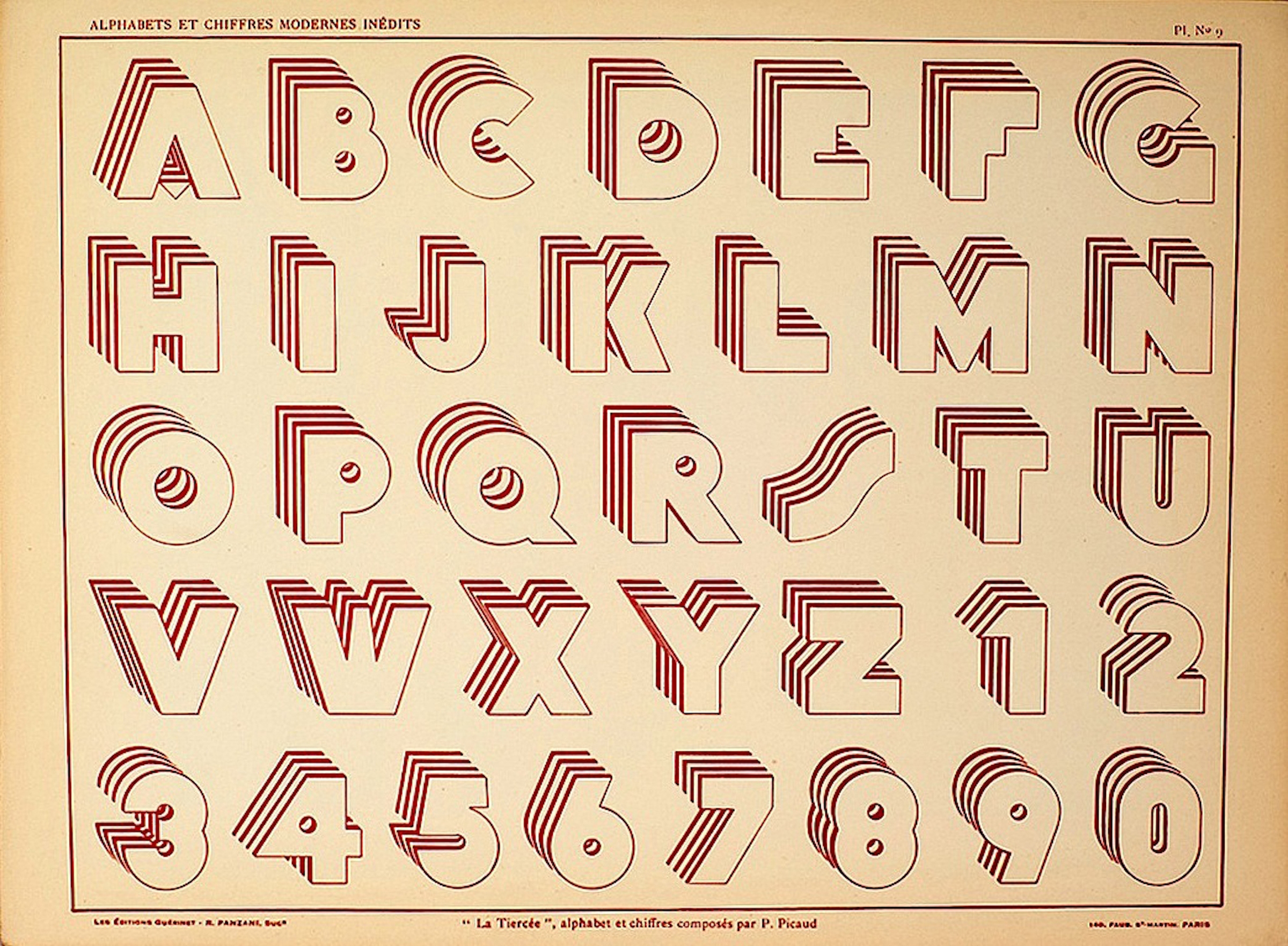 The design of Plywood didn’t originate at Photo-Lettering, Inc., though. Like Halloween, Aztec, Cabaret, Razzle Dazzle, and Echo, it’s based on an alphabet sourced from a book published in 1931 in Paris, titled Publicité Vignettes Lettres Chiffres Monogrammes et Rehauts Modernes. With this design and alphabet sampler, “Guérinet publishers captured the fading glory of ‘Modèles de lettres’ from the Romantic period with their Art Déco-inspired collection”, writes Michel Wlassikoff.