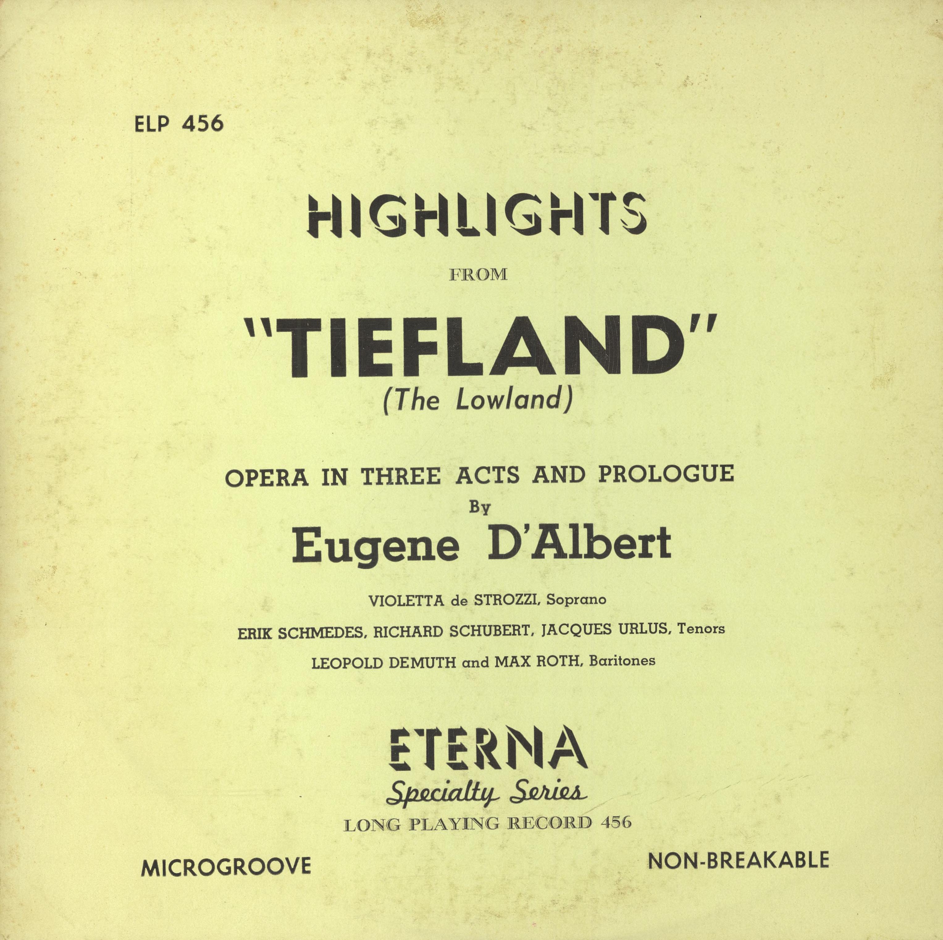 Highlights from “Tiefland” is an undated* vinyl record from Eterna’s Specialty Series, showcasing various acts of the opera and the prologue.