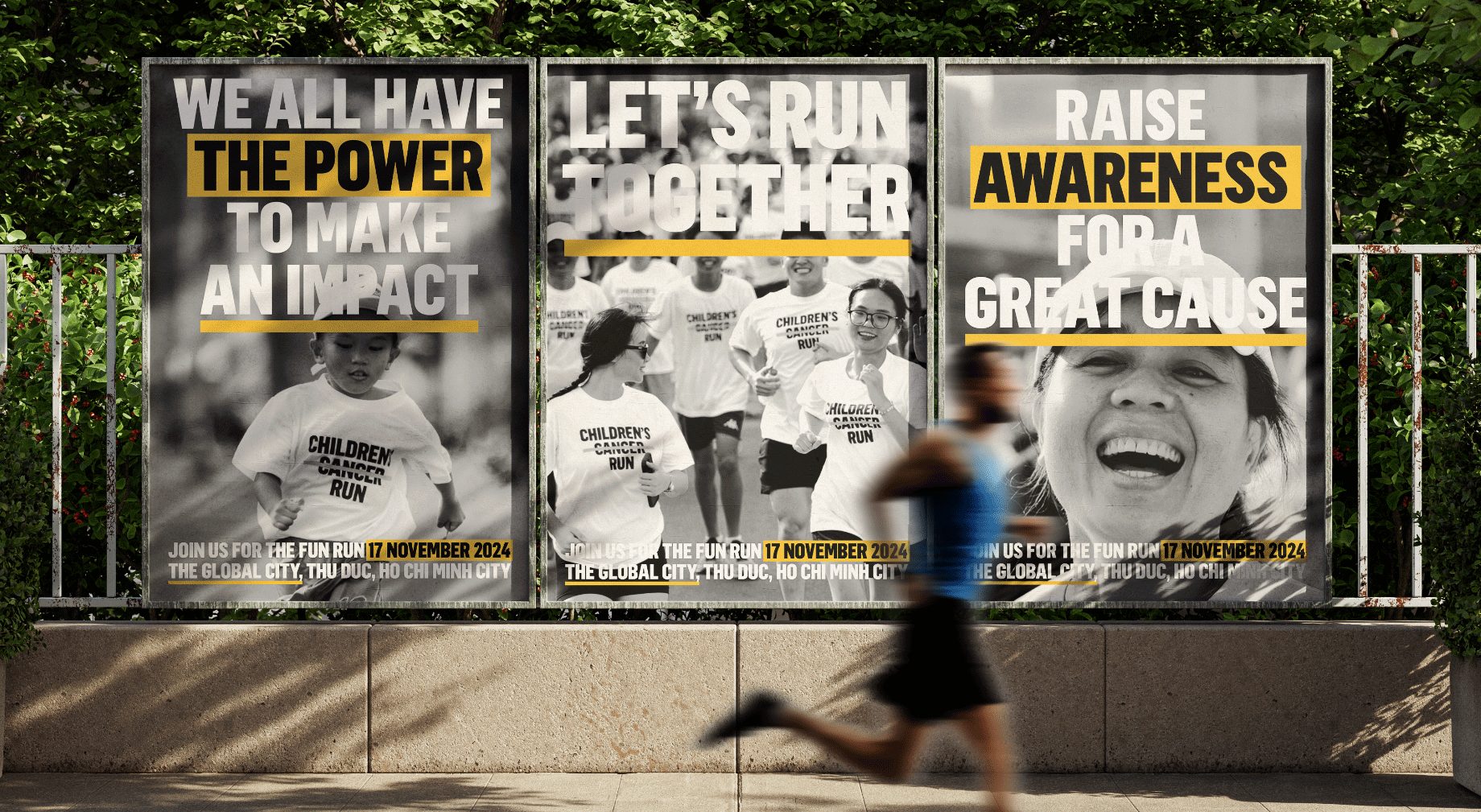 Flama Condensed Black, as the primary font, allows for a bold and strong statement, as Children’s Cancer Run wants to be recognized as a brand. The secondary font, Neue Helvetica Roman (not shown in this image selection), also supports Vietnamese. It helps express long information, body text, or cases in which a neat and neutral font is required.